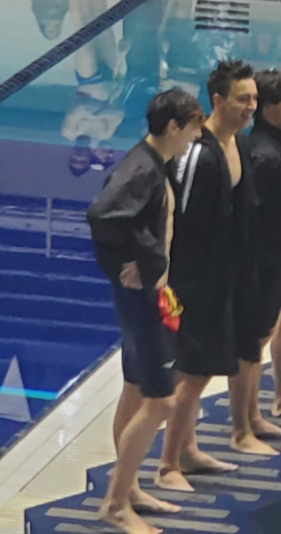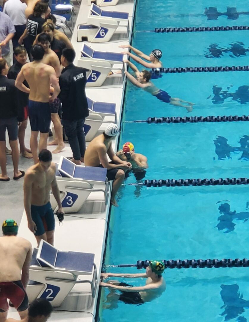 Newport began with a bang breaking their own meet record they just set last year with a 1:32.70 final time just missing the State record of 1:32.42 set by Mercer Island also last year. The winning time also was an AAA (automatic All-America) time. The Knights lightning fast relay team was led off with Freshman William Ho the 2nd leg was Sr Christian Koh, up 3rd went Soph Nathan Xu and the anchor was Sr Liam Campbell.