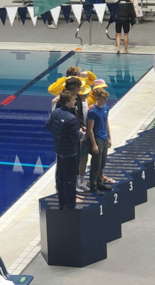 The Union Titans got their 3rd win of the day and Sam Empey the lead-off swimming in the 200 freestyle relay grabbed his 3rd gold. The Titans were the top qualifier and took nearly 2 seconds off their top qualifying time with a 1:25.93 just missing the AAC time. Empery was joined by 2nd leg swimmer Owen Robertson, 3rd leg was Steven Empey and Alexander Wahlman finished up with a strong leg to clinch the win.