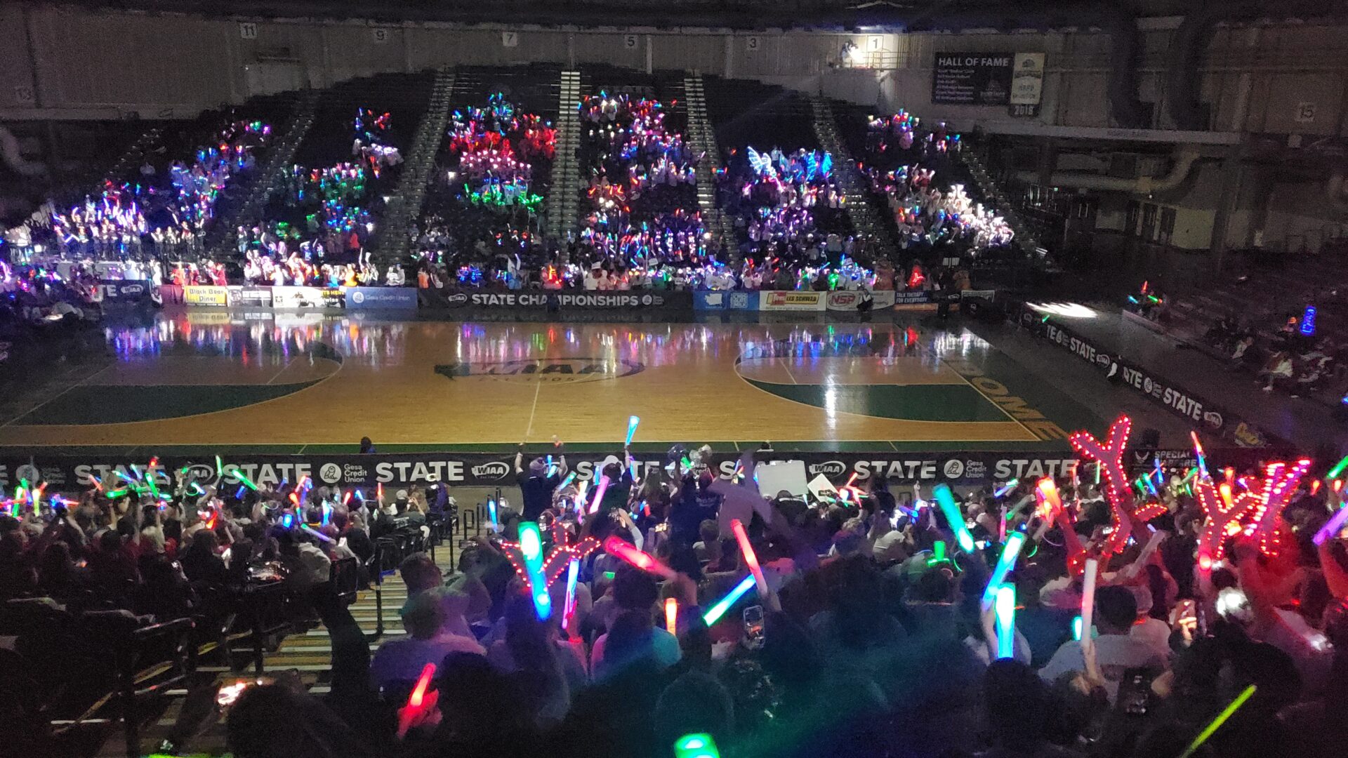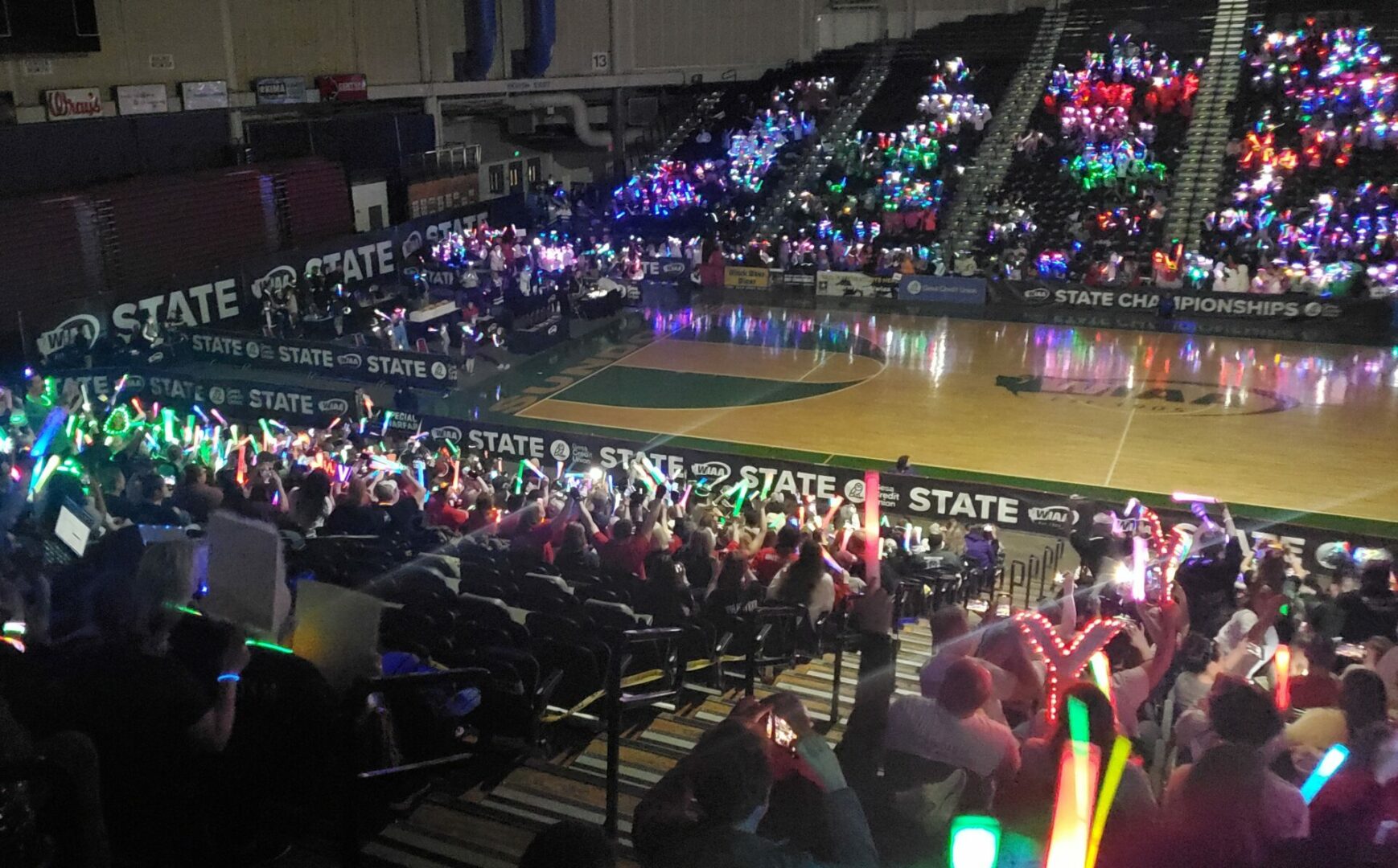 The day long event was then wrapped up with the Drill down competition, a large “Simon Says” event with all the competitors while the WIAA administrators finish tabulating the final scores and get all the awards ready for presentation. Then the lights go out and the parade of athletes with all the color and vigor of a Mardi Gras parade in New Orleans but of course rated G. Loud music, spot lights dancing off the roof of the dome, and each competitor and most of the audience from kids to Grandparents waving or wearing anything that blinks and is flashy.