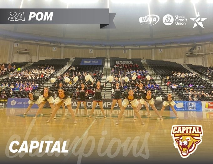 In the 3A Pom last year there were 4 places and this year 5. 4th place Hazen jumped to 2nd this year, Bonney Lake was 3rd both last year and this year while Lake Washington dropped from 2nd to 5th. Mercer Island stepped up to grab their 1st trophy since 2015 taking 4th place. But taking the top spot was the Capital Cougars defending their Title.