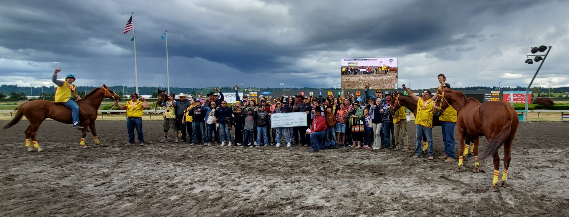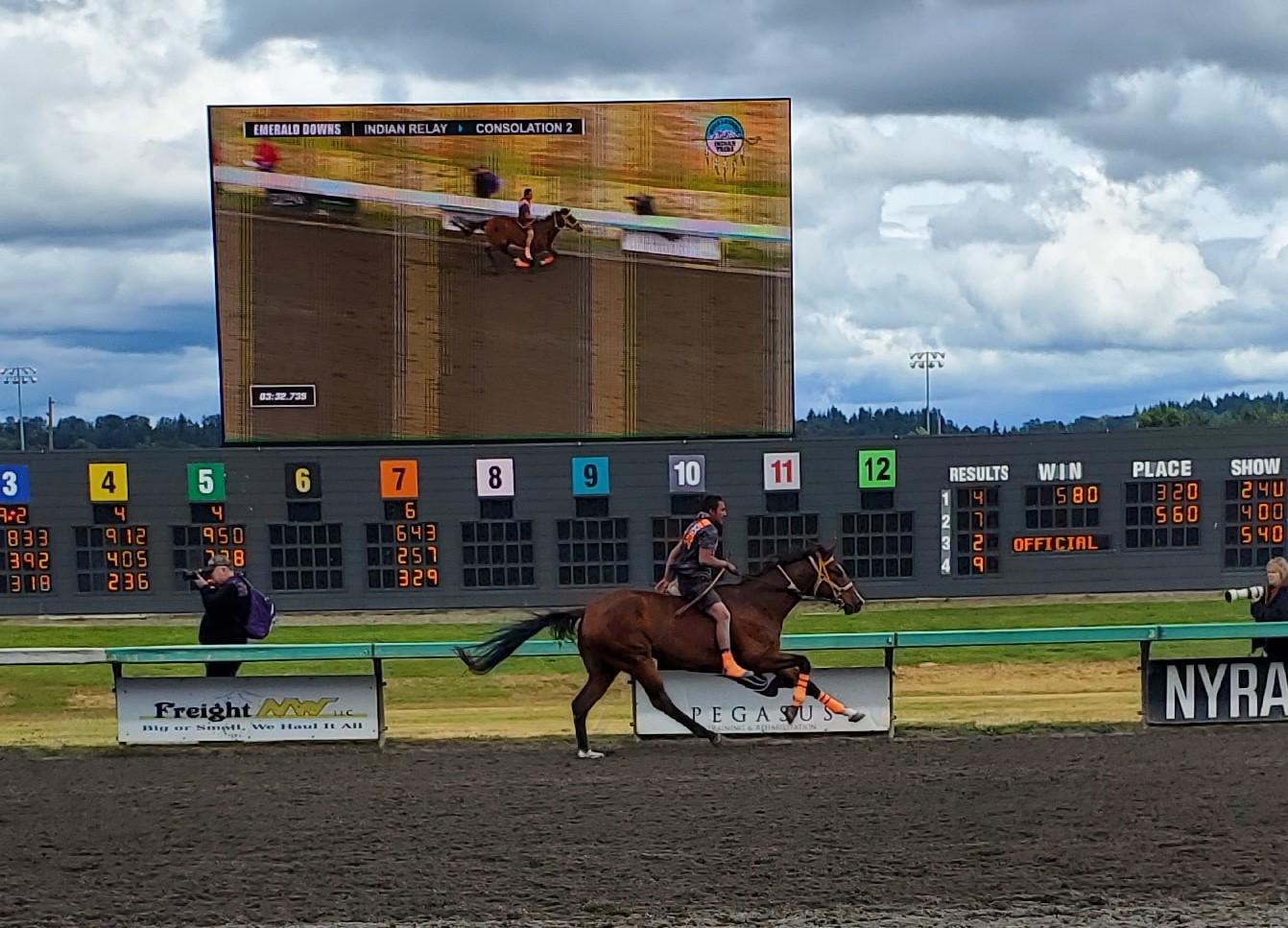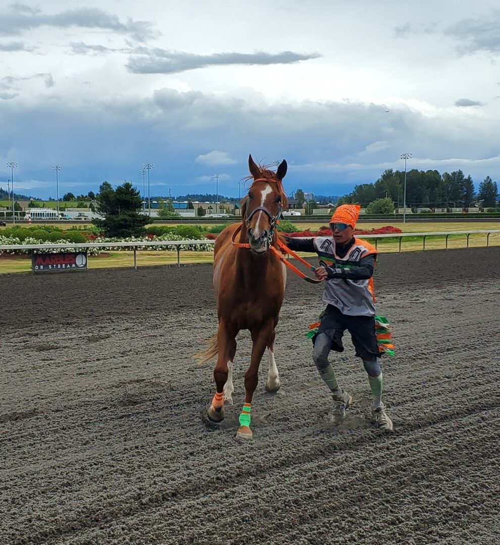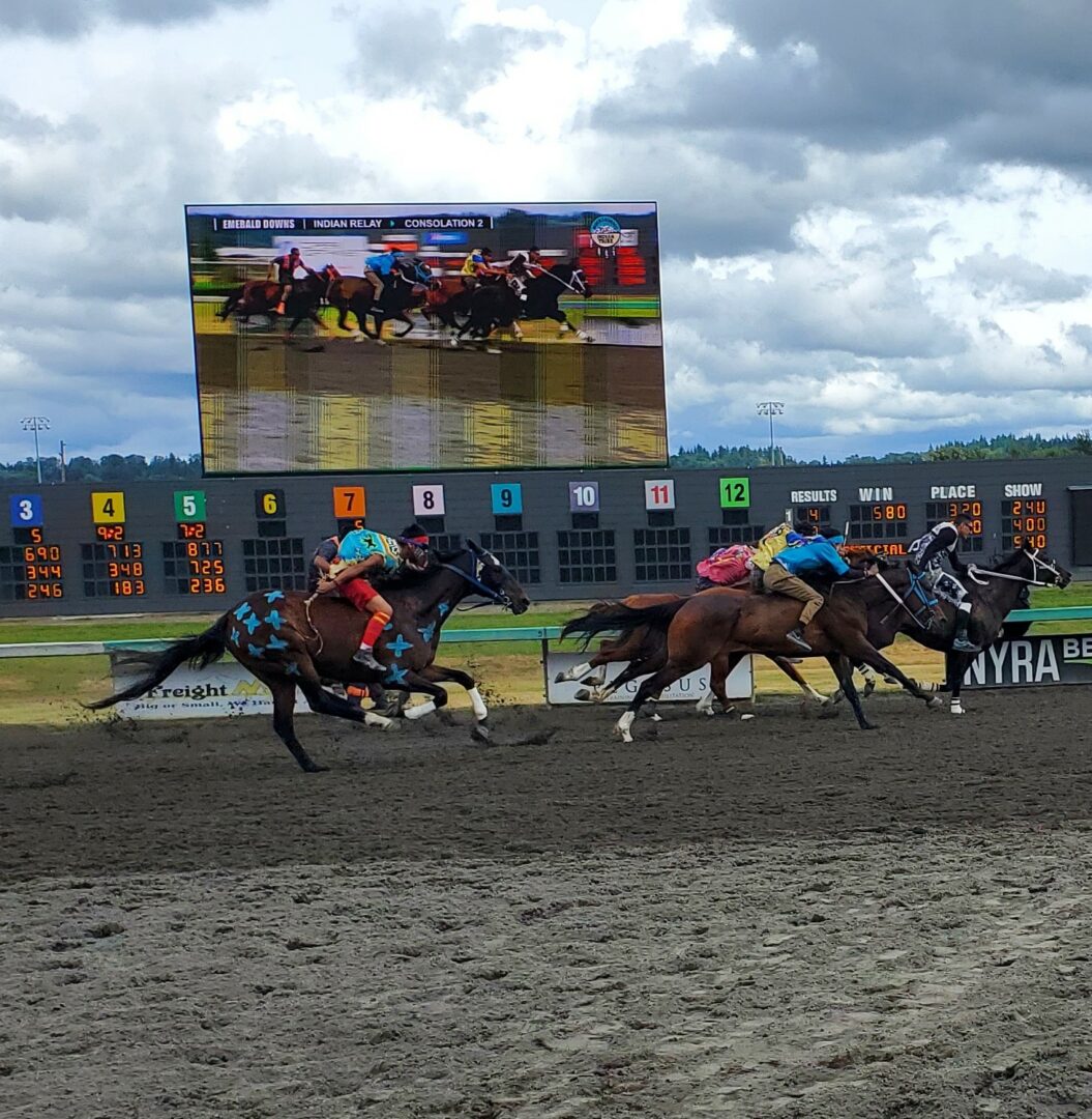 In a year of the newcomer at Emerald Downs it was no surprise another one won in the 2nd heat of the Muckleshoot Gold Cup. Birdinground Relay from Crow, Montana trailed Carlson Relay for the 1st half mile but a quick change of mounts at the 1st exchange was again the difference in the race.