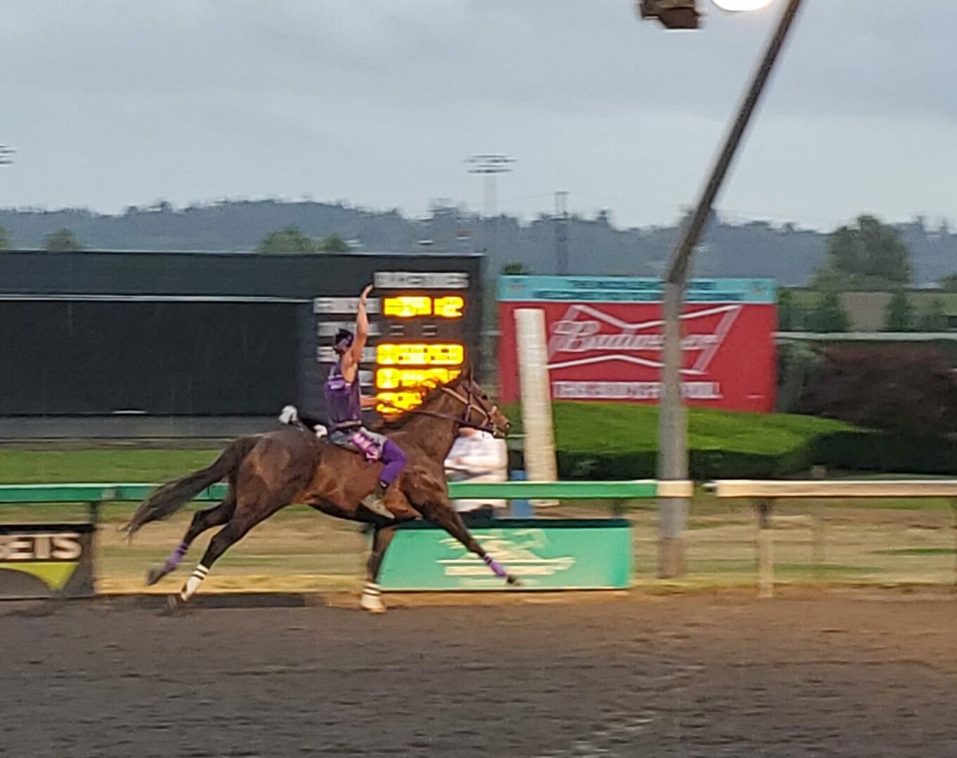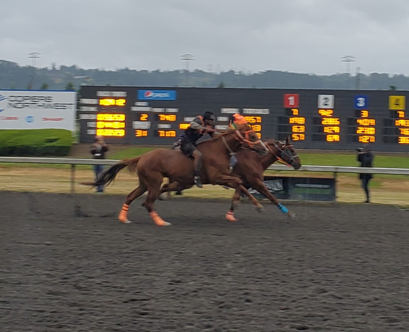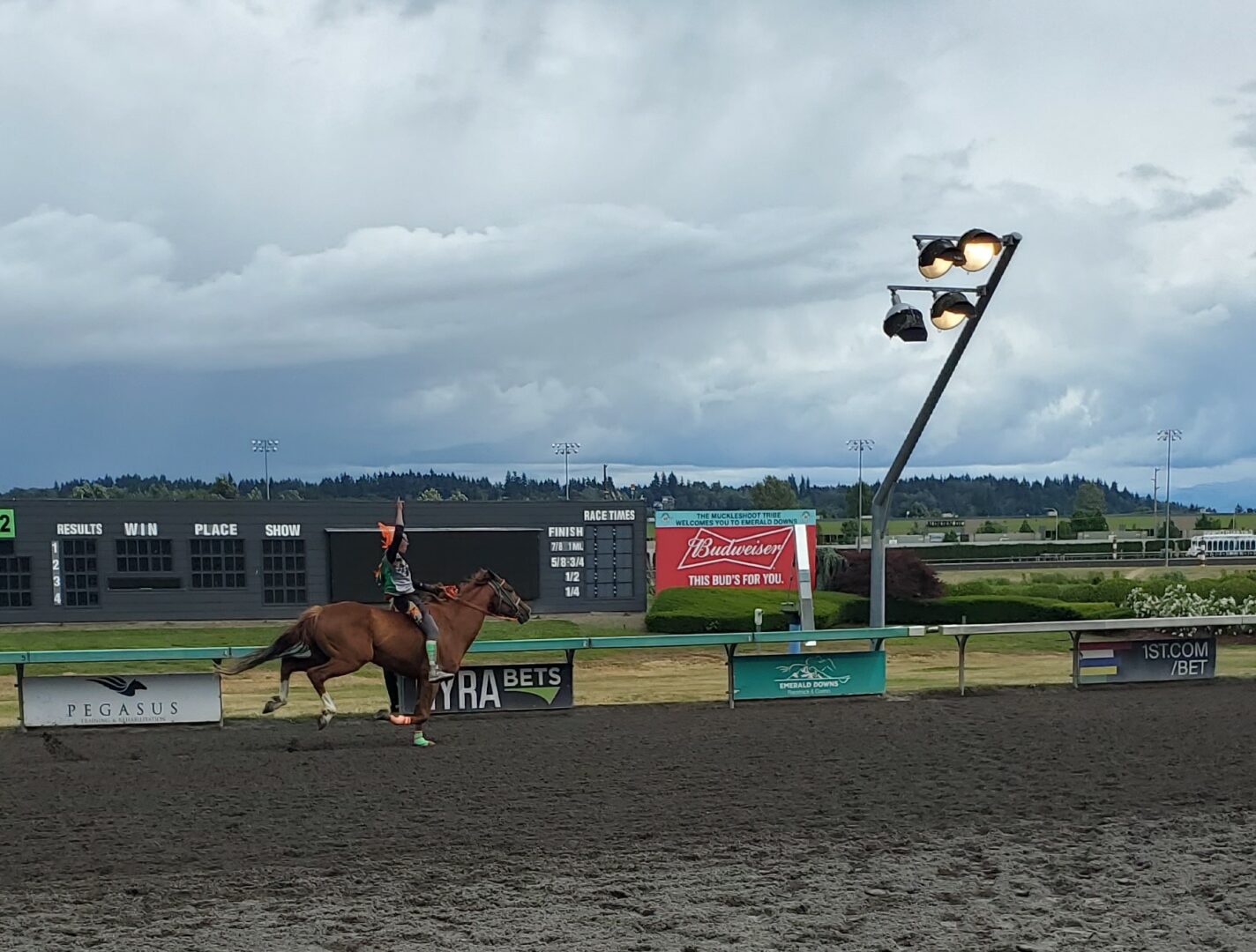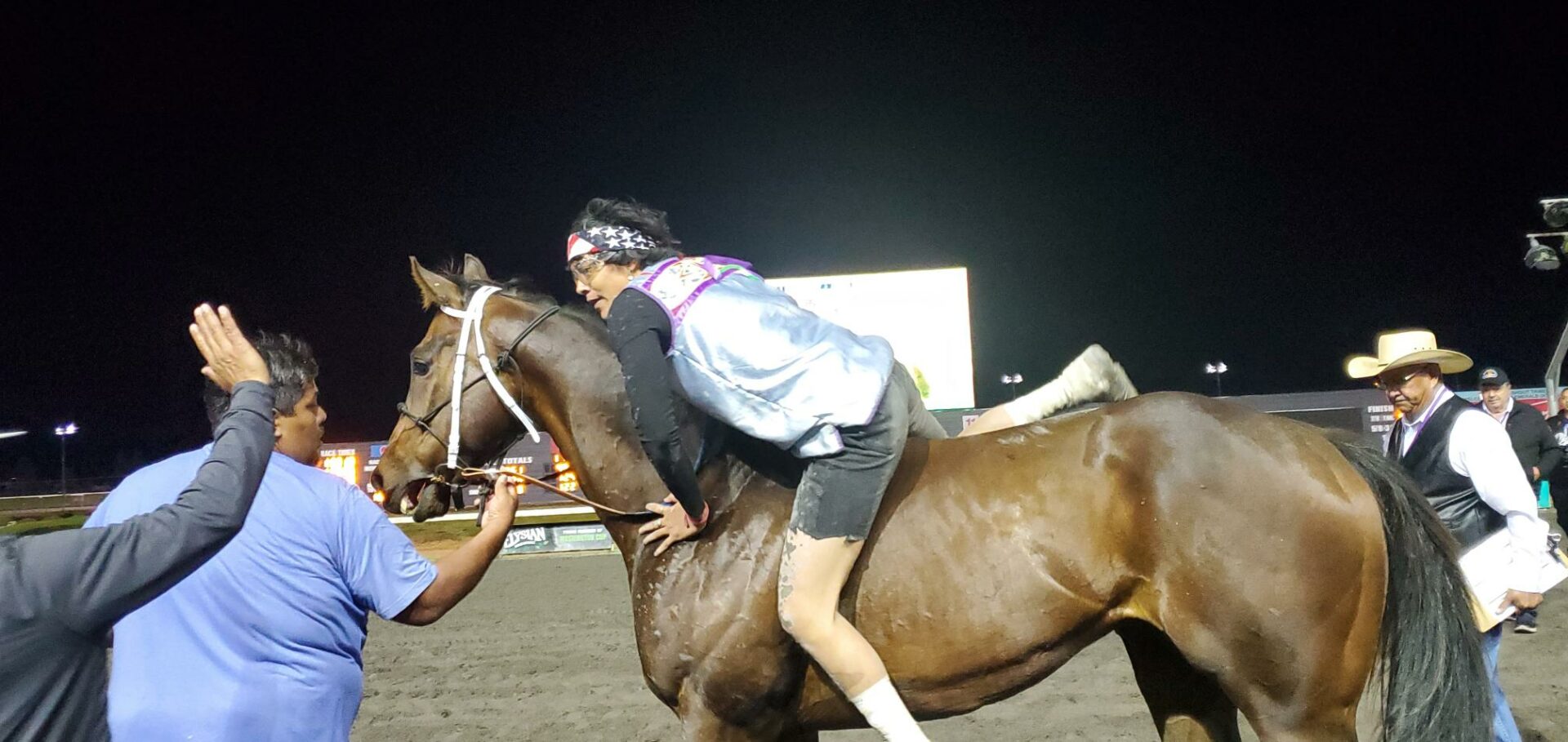In a year of the newcomer at Emerald Downs it was no surprise another one won in the 2nd heat of the Muckleshoot Gold Cup. Birdinground Relay from Crow, Montana trailed Carlson Relay for the 1st half mile but a quick change of mounts at the 1st exchange was again the difference in the race.