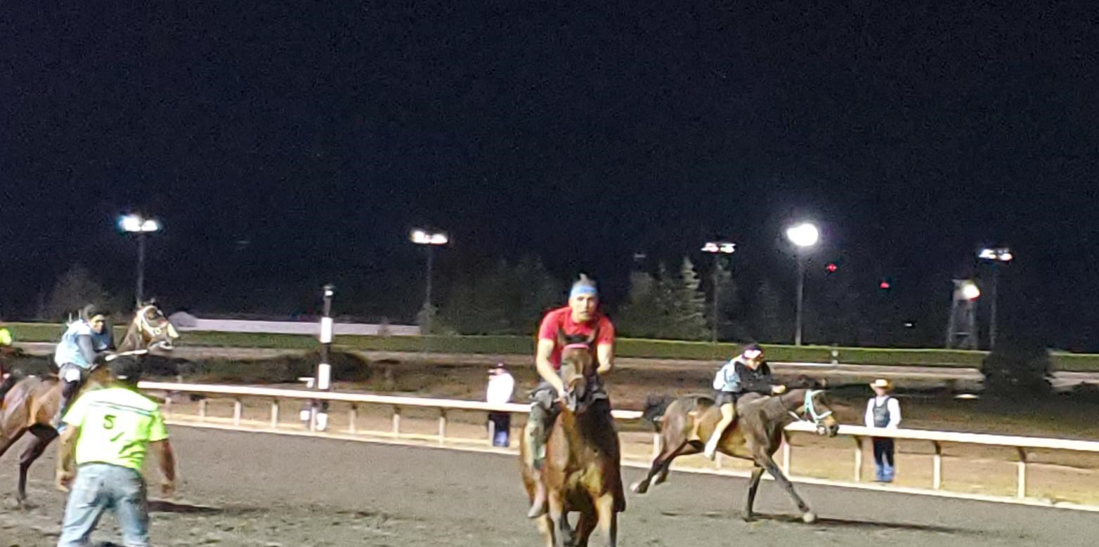 Counting Coup took the early lead in the 1st Consolation race of the day with Narsis Reevis riding, Grizzley Mountain with Terrence Holford was also in the mix early but at the 1st exchange everything got turned upside down as a rough exchange for Grizzly Mountain pushed them back to 2nd last opened the gate for Little Badger to take the lead but quickly making up ground was Mathew Pakootas on Strong Horse Relay.