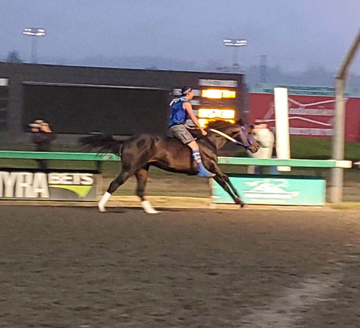 Two Medicine got the lead because BirdinGround made the transfer in ok time but then he couldn’t get his horse to go as he was excited and wasn’t sure what to do finally Tristan was able to get his horse going the right way but by that time Two Medicine had built a big lead.