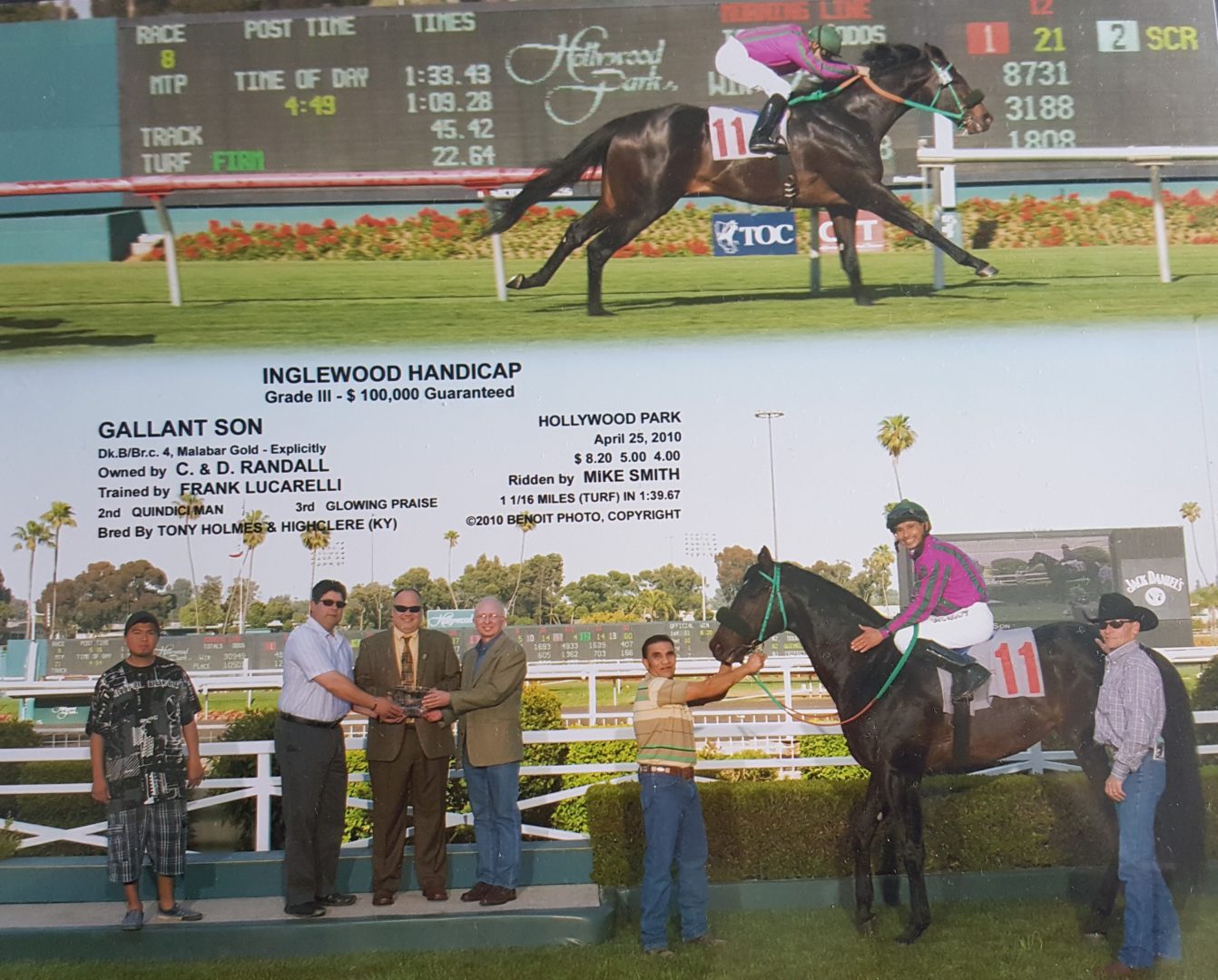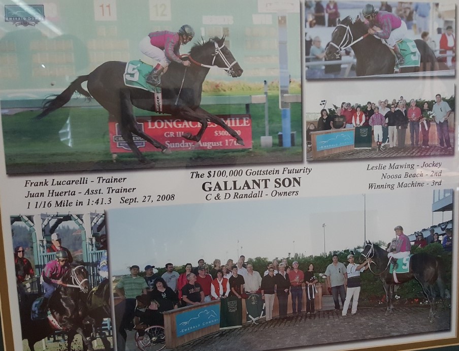 2008 maybe the year that Lucarelli finally admitted to himself he made it. It was by far his best year as he topped 1-million dollars in earnings for the 1st time in his career and cleared it by a mile with more than 1.3-million on the books. He would also start a record 535 and had 82 winners both personal bests. But it was this 2-year-old steal he and owner Chris Randall found at the Keeneland sale for $9,000 that took Lucarelli to another level. Gallant Son would lose his opener at Emerald but then go on to score big wins in the Premio Esmeralda Stakes at 8-1 then cruised to an impressive 6-length victory in the Gottstein as the 5-2 2nd favorite. Gallant Son was getting so good Randall and Lucarelli decided to take a swing at the 2-million dollar Juvenile Breeders Cup race. Regular rider Leslie Mawing got the ride and he finished a very credible 7th in the 12 horse field with only 3 and half lengths separating the top 7 finishers.
