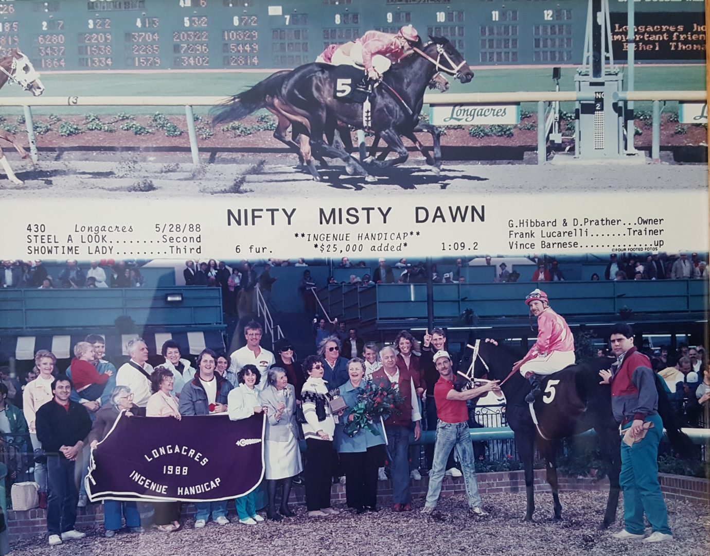 Thanks to Nifty Misty Dawn Lucarelli would have a very good 1988 not only did he crush his former earnings record with nearly 220k, 80-thousand more than in 87 but he would get his first Stakes win. On May 28, 1987 in the $25,000 Ingenue Handicap Nifty Misty Dawn with regular rider Vince Barnese got up just in time to beat Steel a Look by a head and Lucarelli had his 1st Stakes win.
