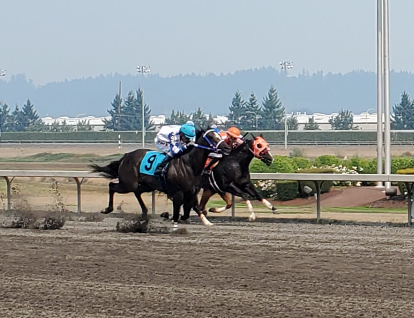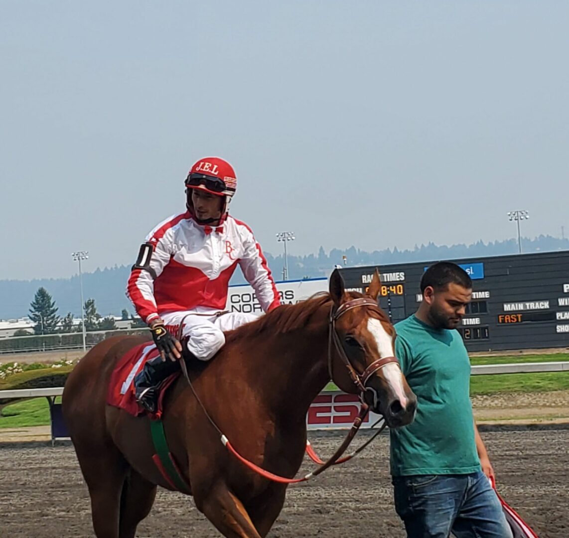 With the 2 quarter horse Stakes races in the books early we still had to have a Thoroughbred Feature race and it was a good one in the 9th race with a field of 6 going 6-furlongs. Dirt Road Red was trying for his 5th win of the season while Tax Code was looking to bounce back coming off a troubled trip in his last while Jin Tong who has run well but bolted to his right unseating rider Alex Anaya in the Muckleshoot Derby last week from the outside 10 hole position. Trainer Joe Toye and Anaya again drew the outside 6 hole in this one and the question was would he do it again?