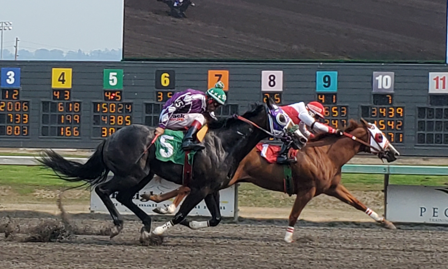 The 6th race sent 7 to the gates going 6-furlongs and not only has front speed struggled for the past month or more but so has favorites. Well the favorites were making up ground on Sunday as the rare 1-9 shot got the win, not without some excitement but Alex Cruz got Blazen Grazen to the line over 31-1 upset minded Peter Flies with Silvio Amador. Peter Flies went to the lead and led by 1 1/2 at the top of the stretch but Blazen Grazen was measured just right passing the big underdog in the final 25 yards for a 3/4-length win in a time of 1:10.14. Tiger Too at 30-1 with Kevin Radke nosed out 6-1 A Skip in the Park with Jose Zunino. Blazen Grazen races for Fred and Cindy Dinsmore the estate of Glyn Kelly and Anne MacLennan and trained by Dan Markle. Blazen Grazen set the new low for a $2 win pay of just $2.20 he also paid $2.10 to place but thanks to a 31-1 running 2nd and a 30-1 running 3rd Blazen actually paid more than the win at $2.40 to show. Peter Flies paid $9 and $5.60 and Tiger Too $6 to show. The $1 exacta of 1-9 to 31-1 paid $9.20, the 50-cent tri $40.75 and the $1 super $142.40.