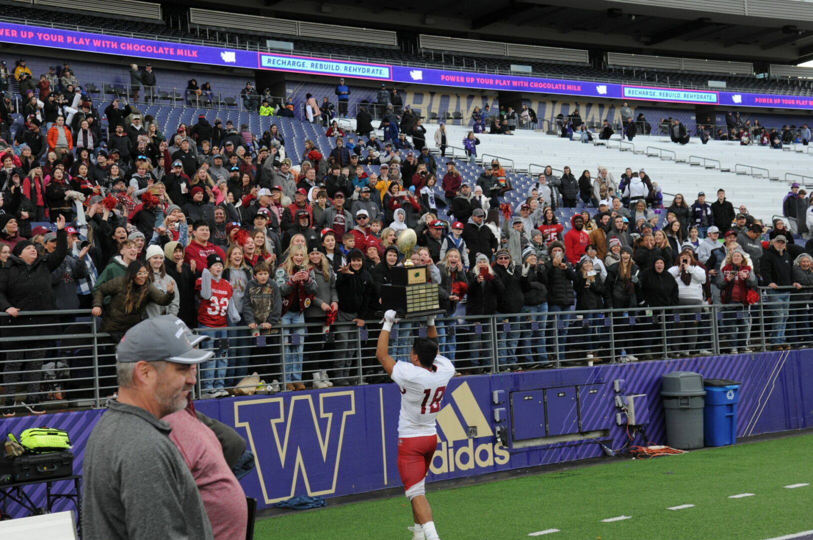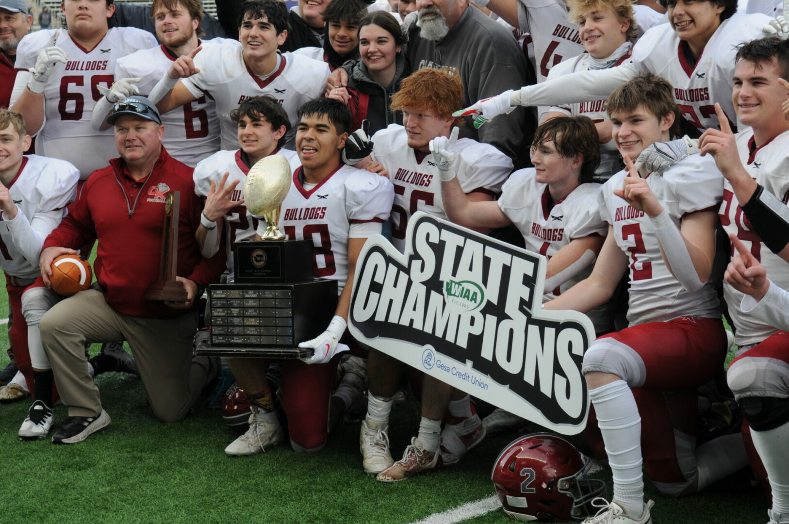Napavine would not give in and score in just 1:01 when Demarest hit Karsen Denault on a 28-yard perfect pass and catch but the 2-point conversion missed but it was a 1 score game 28-24 with the Tigers hoping for a successful onside kick with 1:03 to play. Napavine’s kicker Pablo Ruedas-Guido rolled a pretty good onside kick that bounced around before a relieved Okanogan bench saw a Bulldog fall on the loose ball. Okanogan then kneed twice to clinch their 3rd 2B State Title and 4th overall Championship.