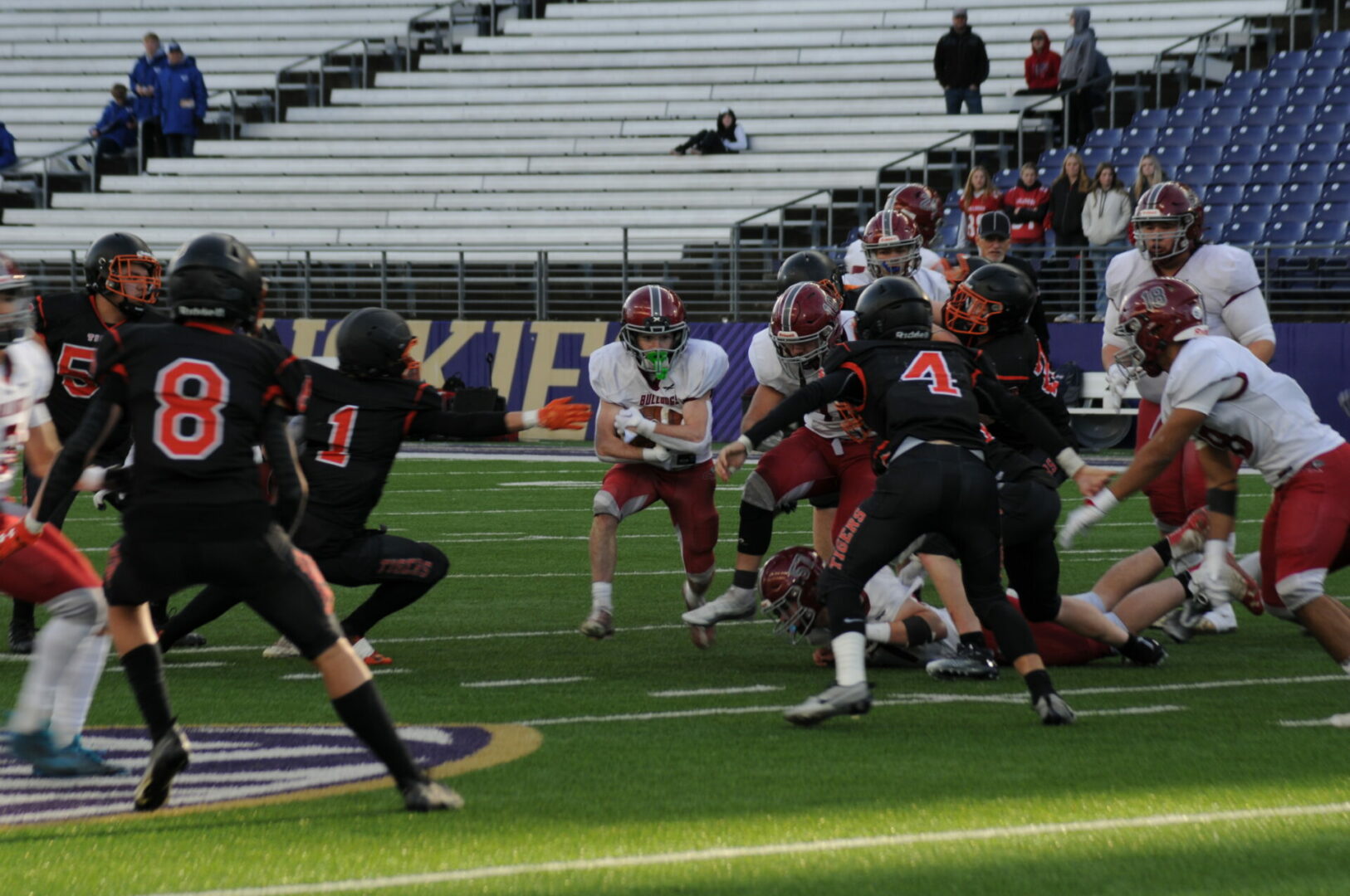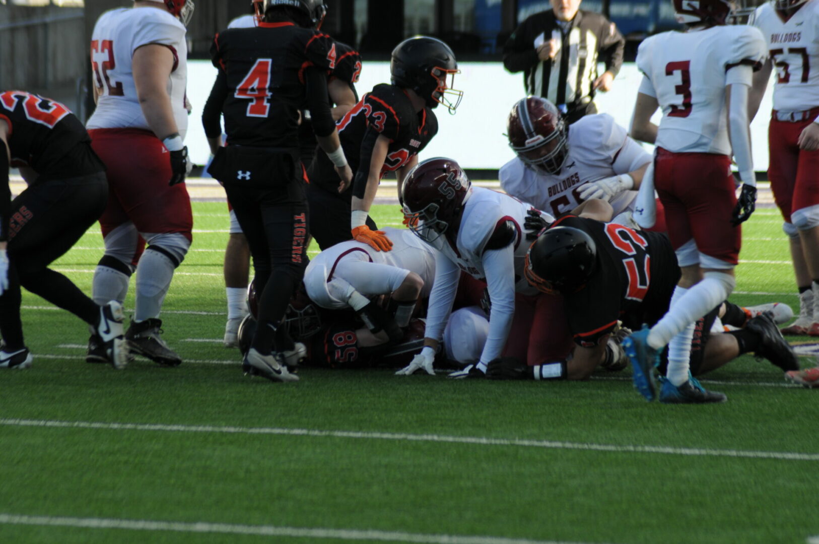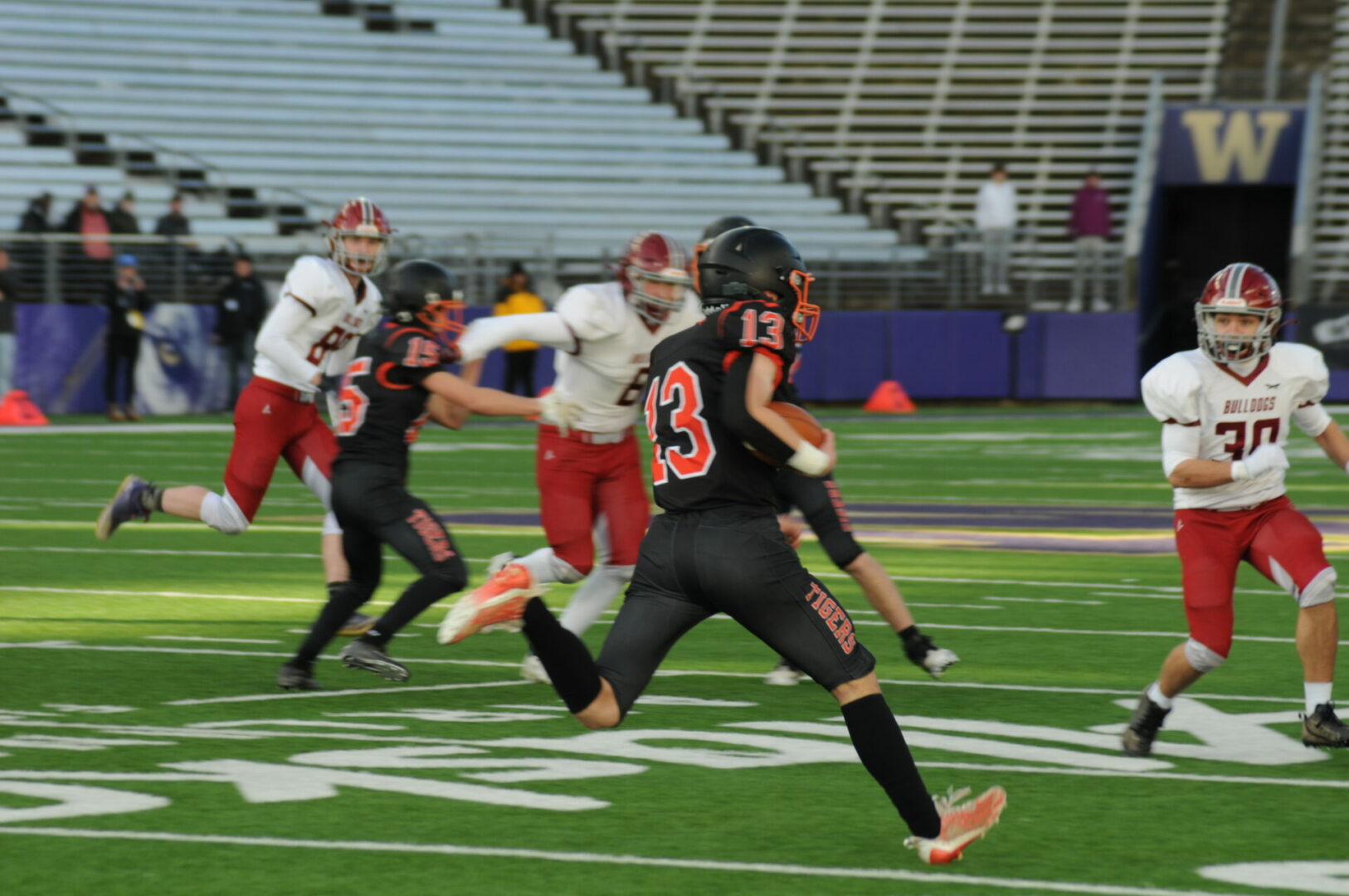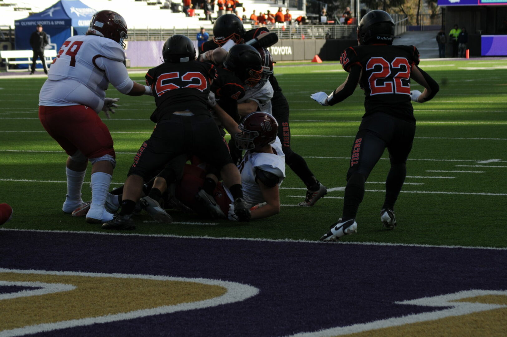 The Tigers then came up with a huge turn-over as Okanogan was driving on their 1st possession of the 2nd half when Connor Holmes picked off the pass on the Napavine 30. The Tigers took advantage of 2 big mistakes by the Bulldogs with a pass interference and a hit out of bounds. Demarest would hit James Grose on a 21-yard TD strike. The PAT attempt was picked and no good but Napavine took their first lead of the game 18-14 with just 2 seconds left to go in the 3rd quarter.