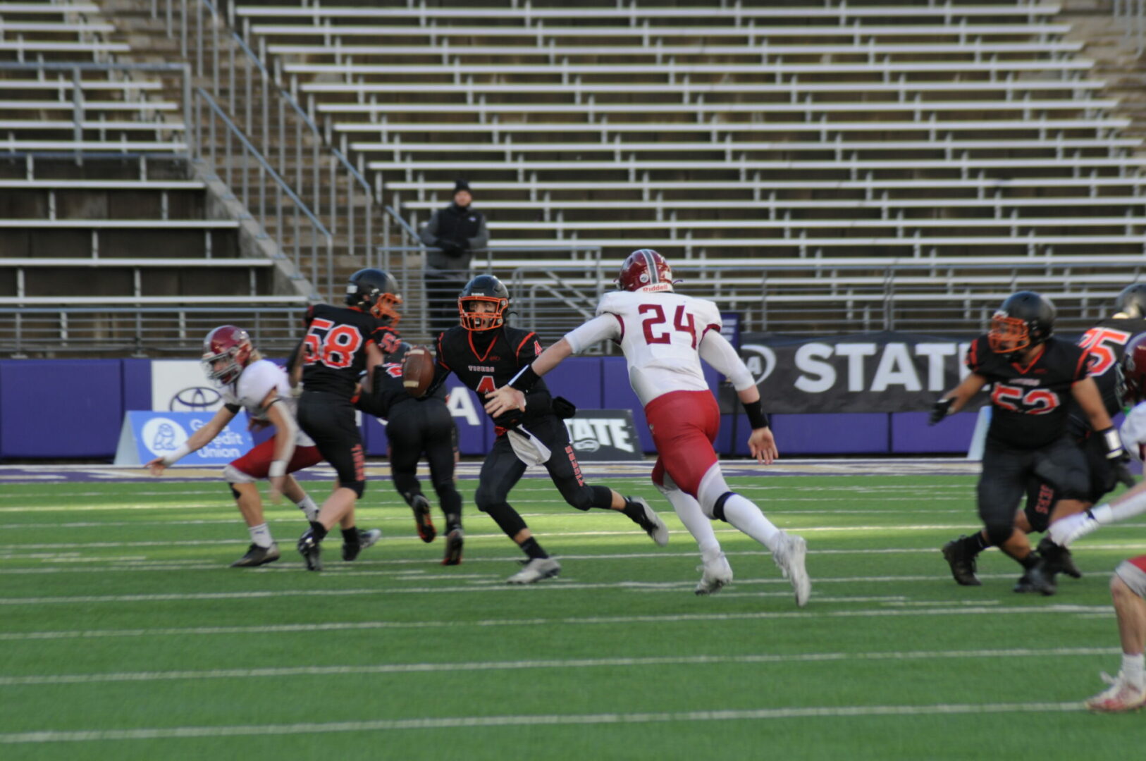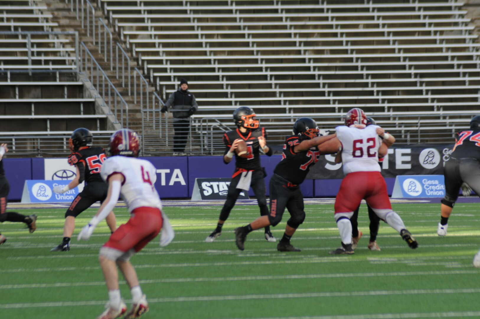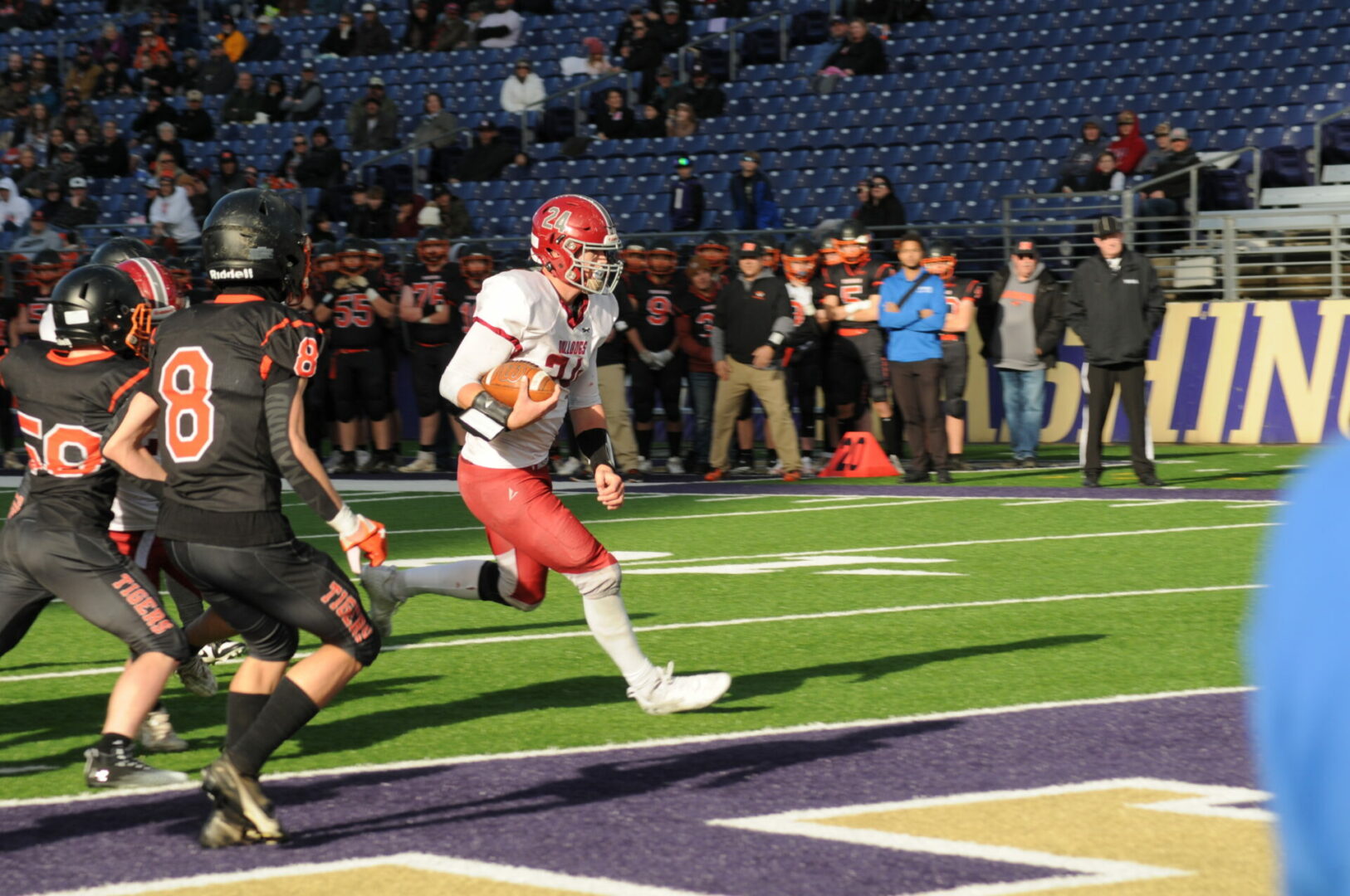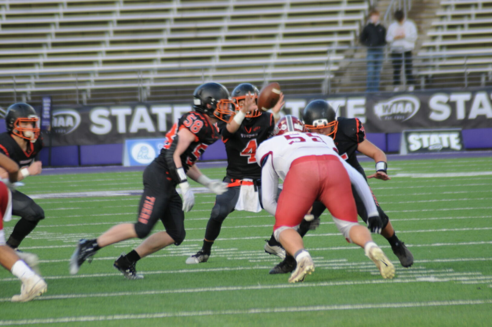 The Tigers then came up with a huge turn-over as Okanogan was driving on their 1st possession of the 2nd half when Connor Holmes picked off the pass on the Napavine 30. The Tigers took advantage of 2 big mistakes by the Bulldogs with a pass interference and a hit out of bounds. Demarest would hit James Grose on a 21-yard TD strike. The PAT attempt was picked and no good but Napavine took their first lead of the game 18-14 with just 2 seconds left to go in the 3rd quarter.