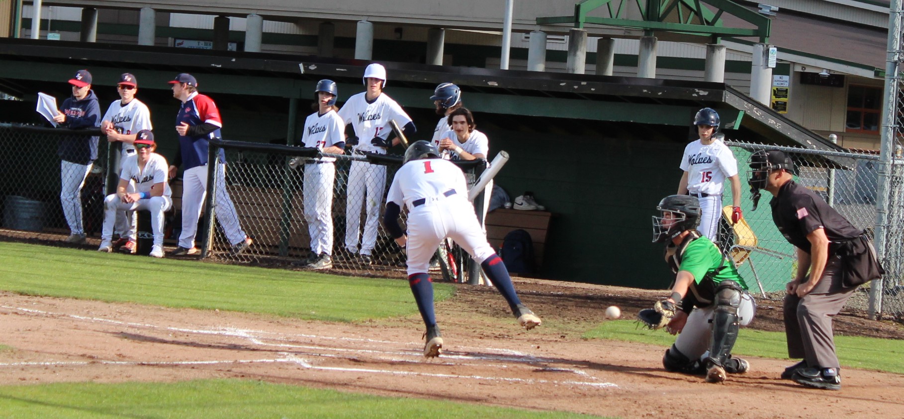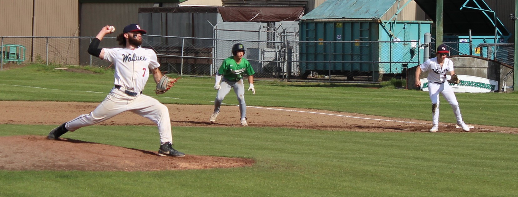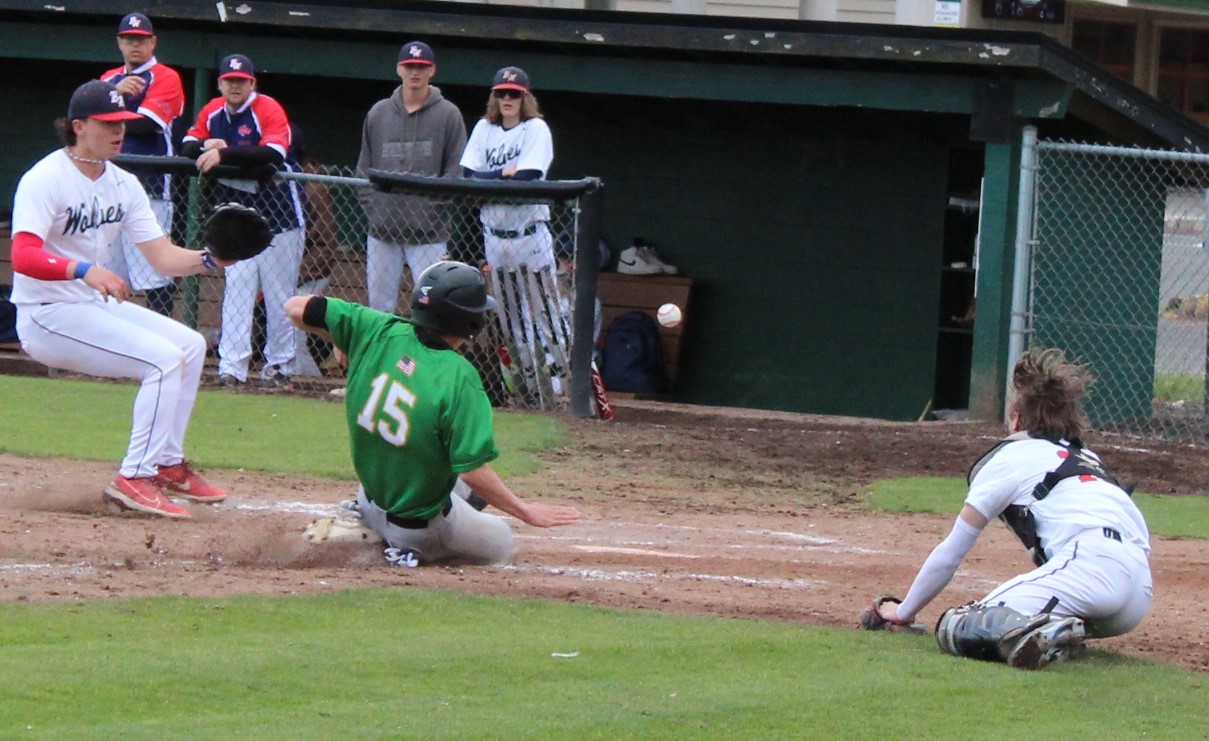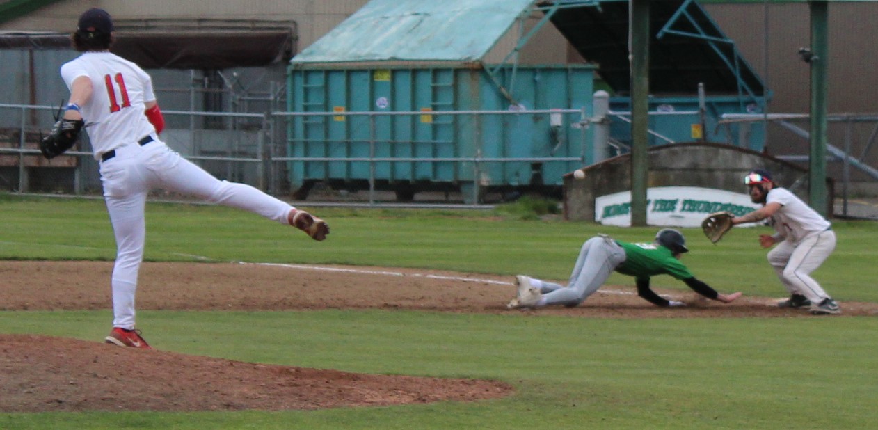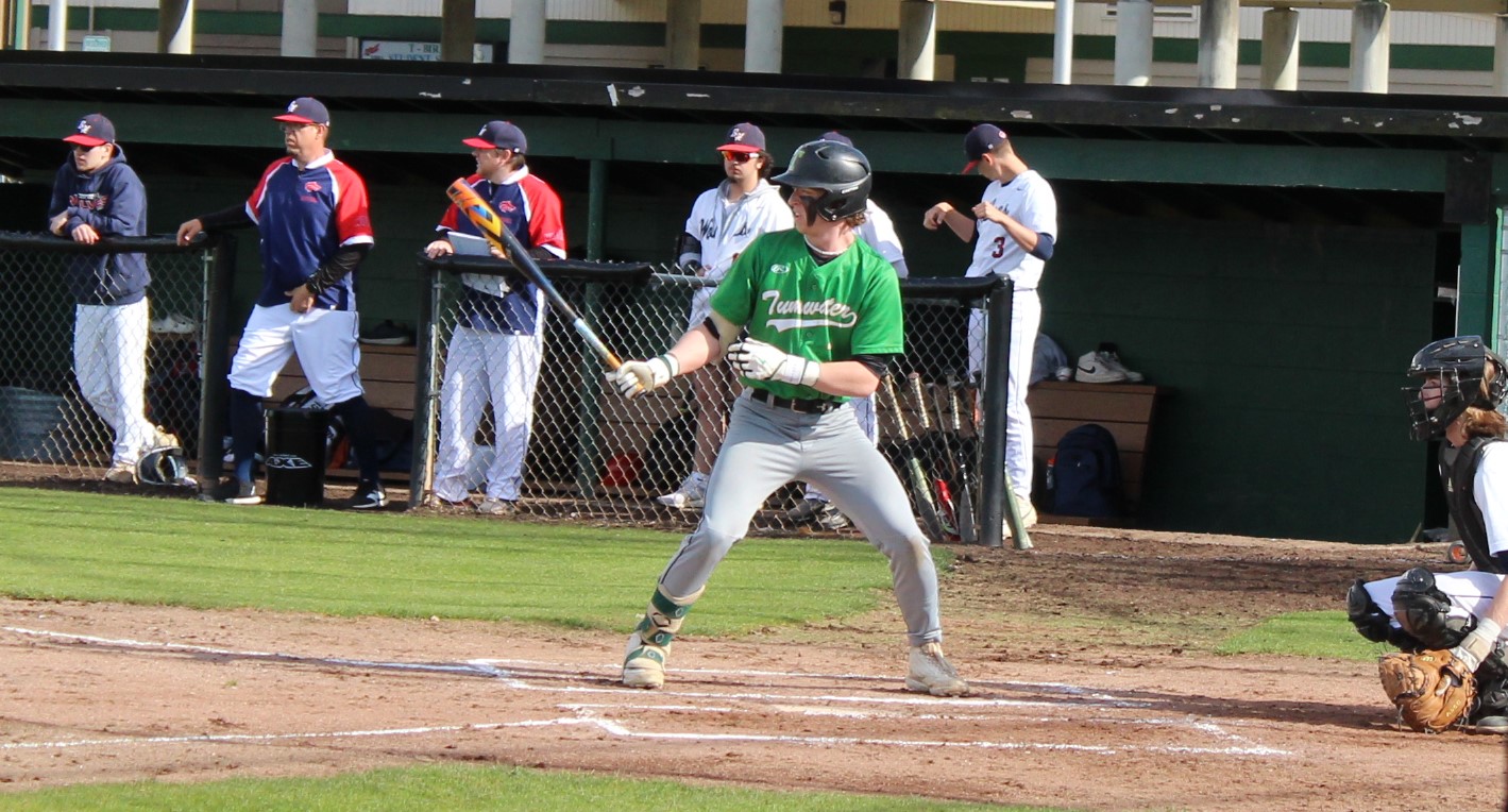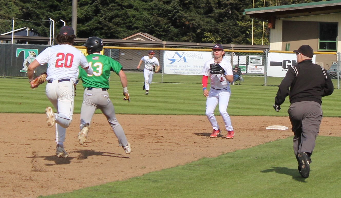 It wasn’t as easy as the final score appeared to hand the Wolves their final loss of the season. Tumwater was the visitor despite playing on their home field. So in the top of 1 the T-Birds scored twice on errors after lead-off hitter Derek Thompson walked and Eddie Marson singled. Both scored on passed balls or wild pitches. Tumwater had the bases full but Wolves pitcher Parker Termini worked out of the jam down just 2-0.
