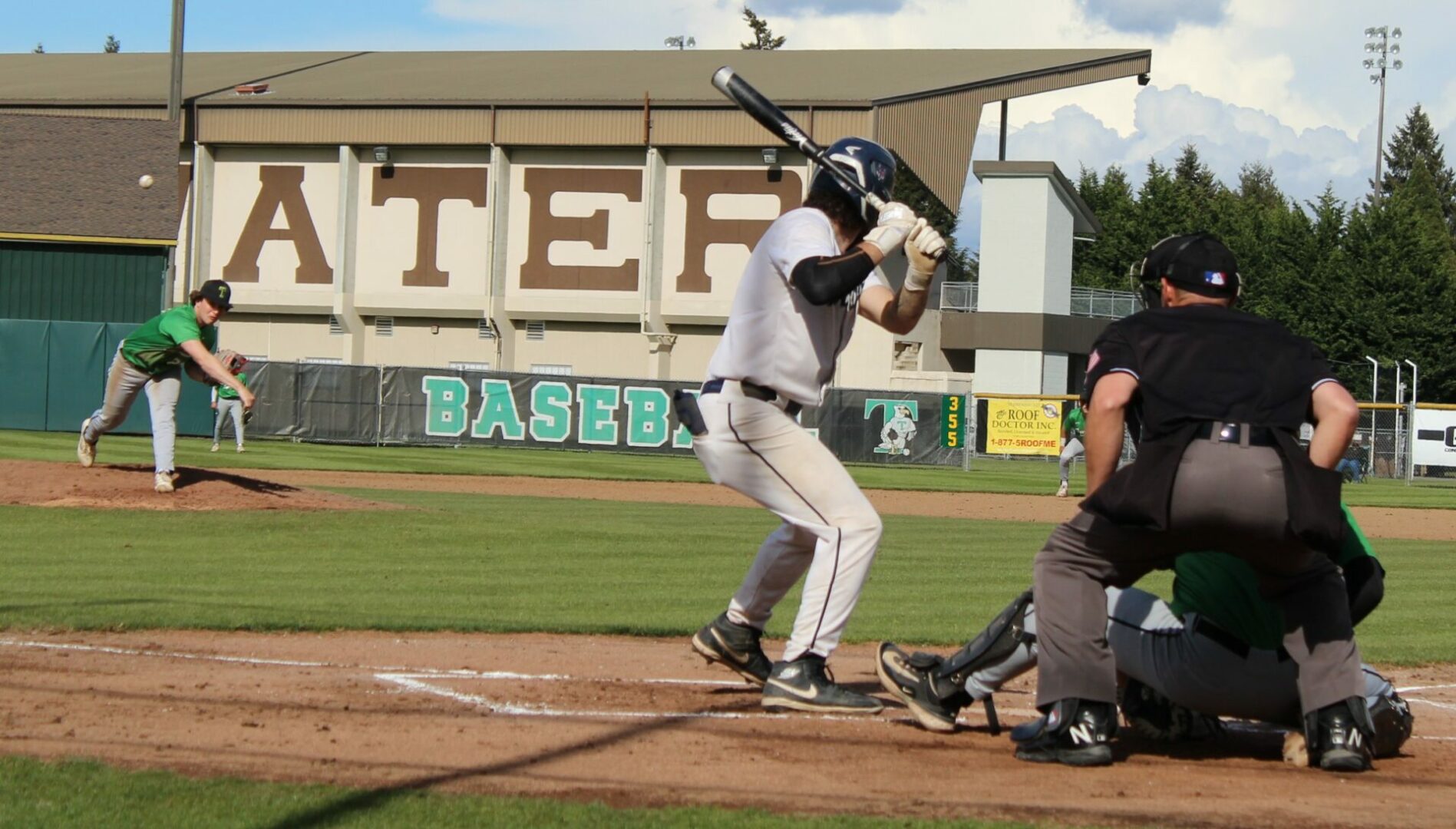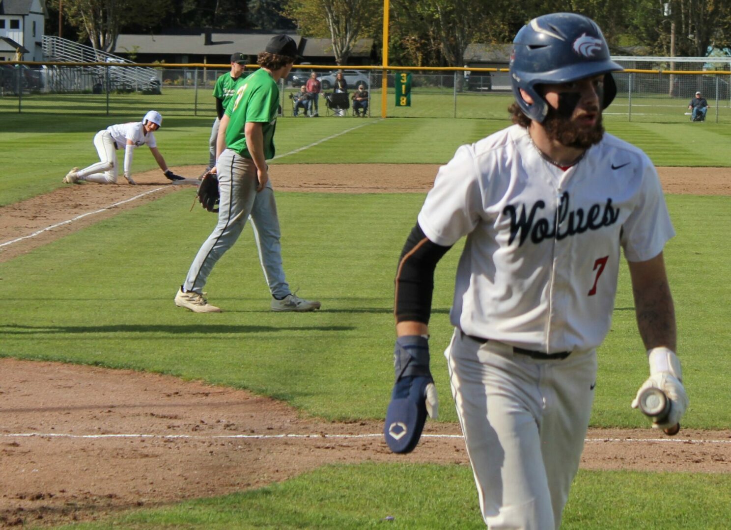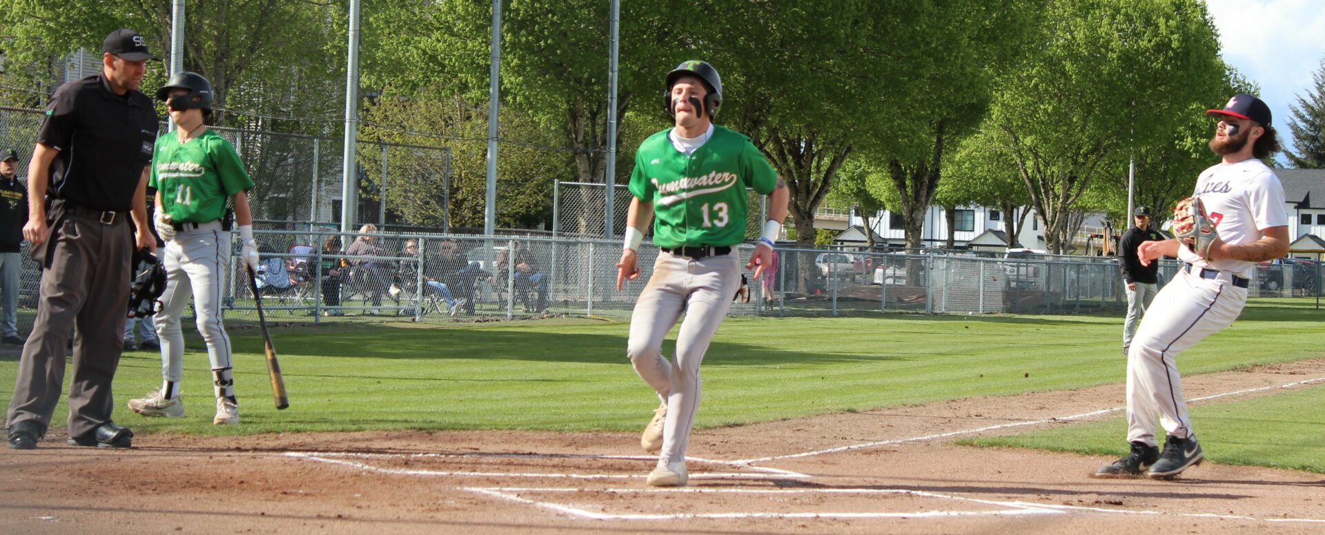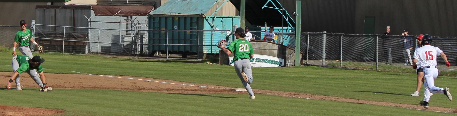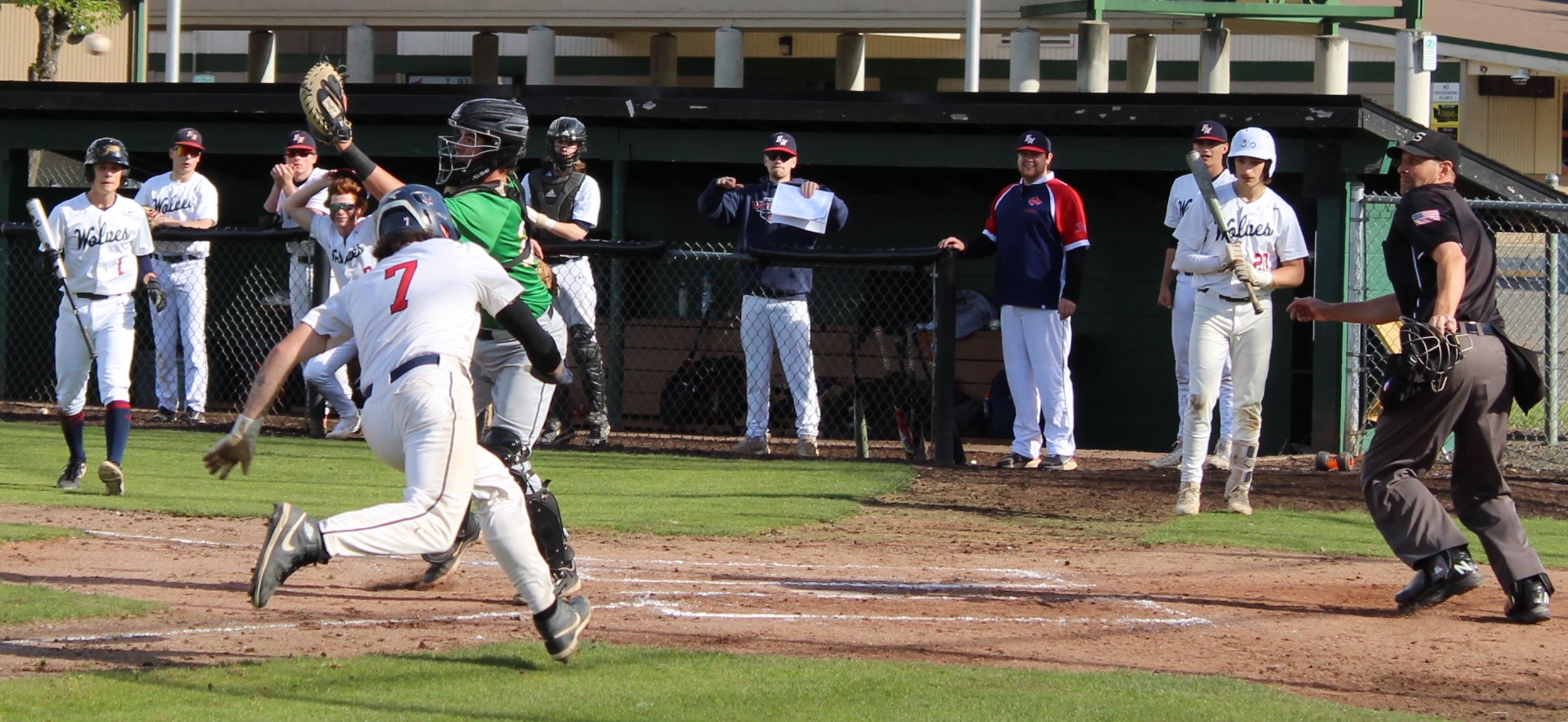 It wasn’t as easy as the final score appeared to hand the Wolves their final loss of the season. Tumwater was the visitor despite playing on their home field. So in the top of 1 the T-Birds scored twice on errors after lead-off hitter Derek Thompson walked and Eddie Marson singled. Both scored on passed balls or wild pitches. Tumwater had the bases full but Wolves pitcher Parker Termini worked out of the jam down just 2-0.