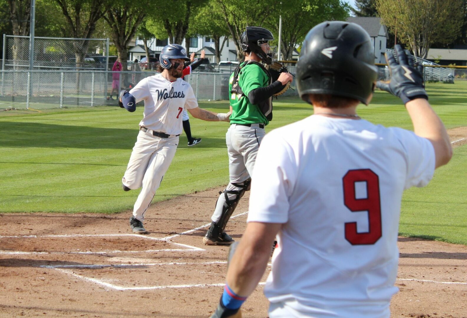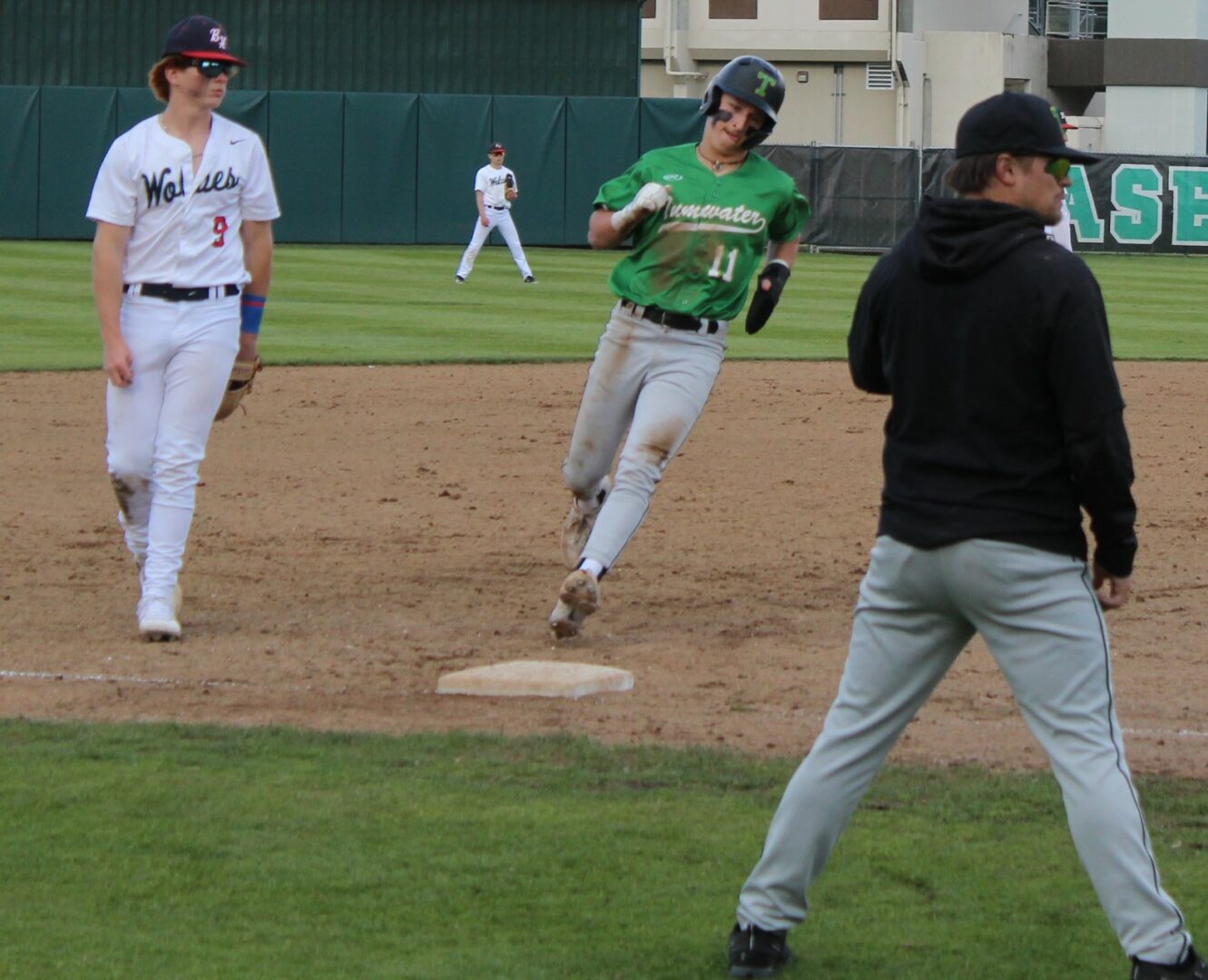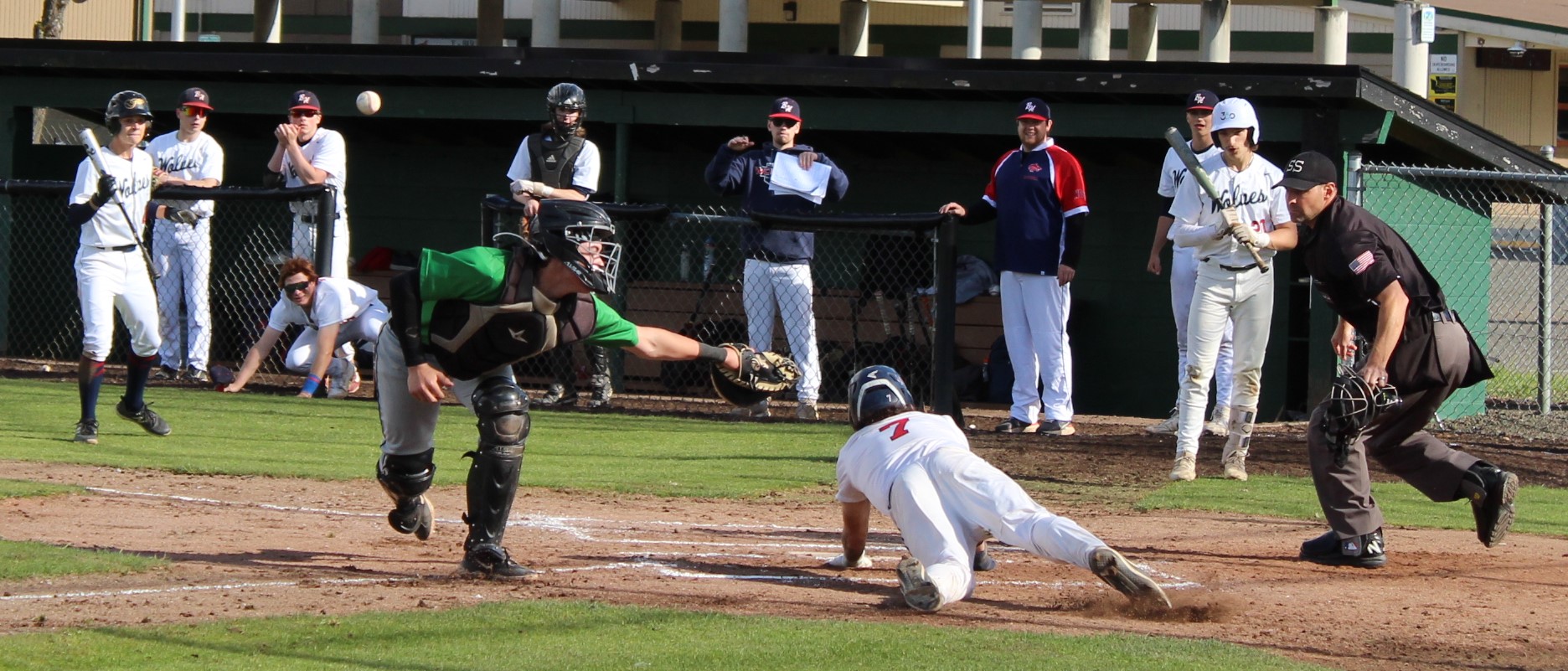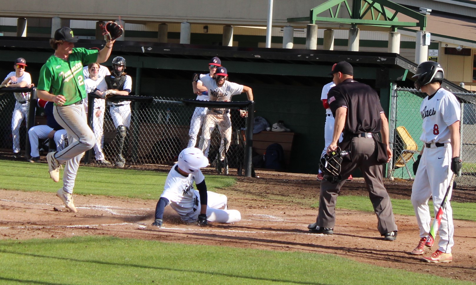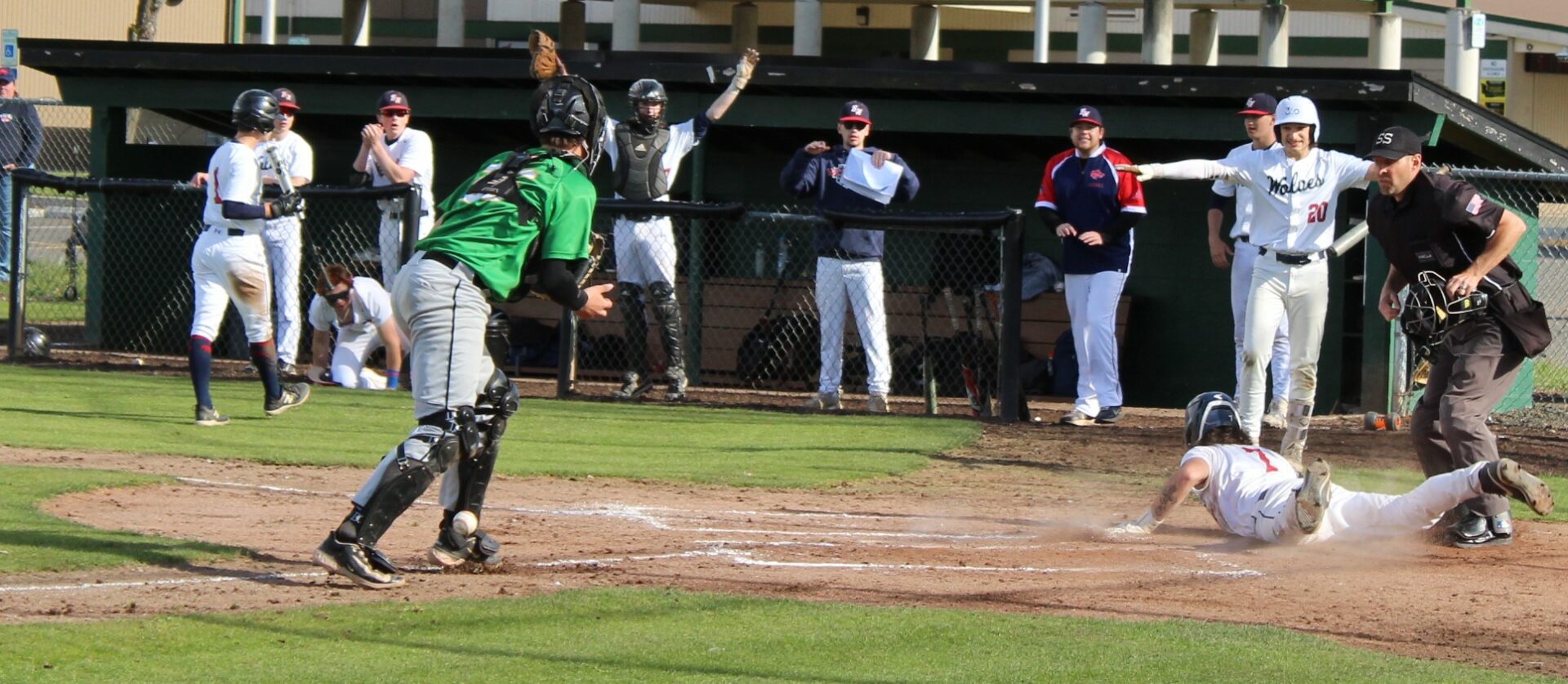 It wasn’t as easy as the final score appeared to hand the Wolves their final loss of the season. Tumwater was the visitor despite playing on their home field. So in the top of 1 the T-Birds scored twice on errors after lead-off hitter Derek Thompson walked and Eddie Marson singled. Both scored on passed balls or wild pitches. Tumwater had the bases full but Wolves pitcher Parker Termini worked out of the jam down just 2-0.