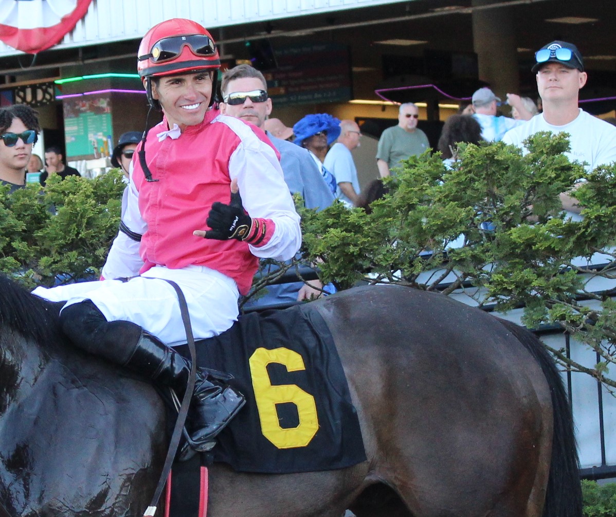 Silvio Amador had caught an early 2nd-itis bug and had 6 2nd place finishes in 9 starts before he got his 1st win of the year on Saturday in the feature race on Mister Mafioso (story above). Amador got win #2 in the opener on Sunday with a 3 length win on Jazzy Love.