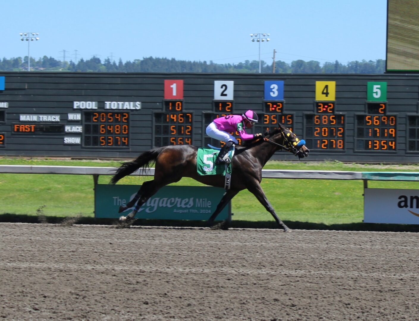 A field of 9 lined up to go 5-furlongs in the Saturday finale but Kevin Orozco and Fruit Lutes decided to make it a 1-horse race breaking alertly setting the fractions and entering the stretch with a 2 length lead and hit the finish line with a dominsting 5 1/4 length win in a time of 57.44. The 5-1 Fruit Lutes gave Orozco his 2nd win of the season and races for Horse Haven Creek Farm trained by Rosie Simkins. Horse Haven Creek also bred the 4-year-old gelding here in Washington state and is by Lutes Gift out of Sweet Pleasure by Candy Ride.
