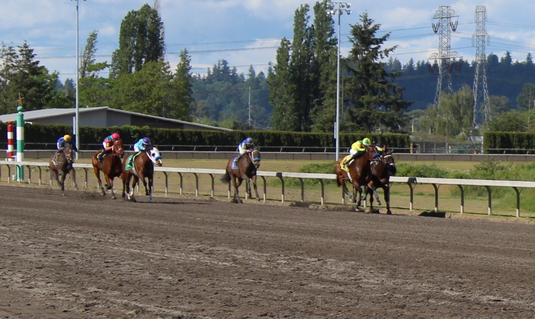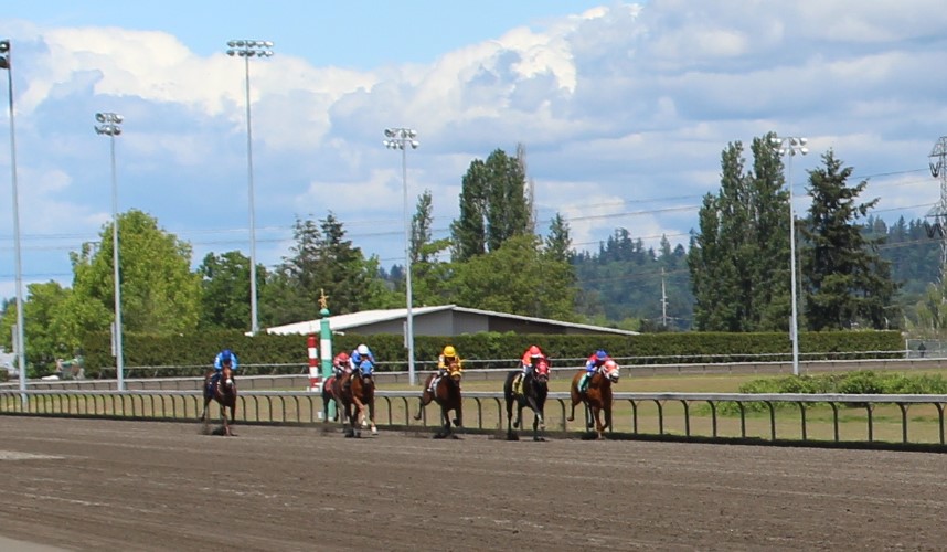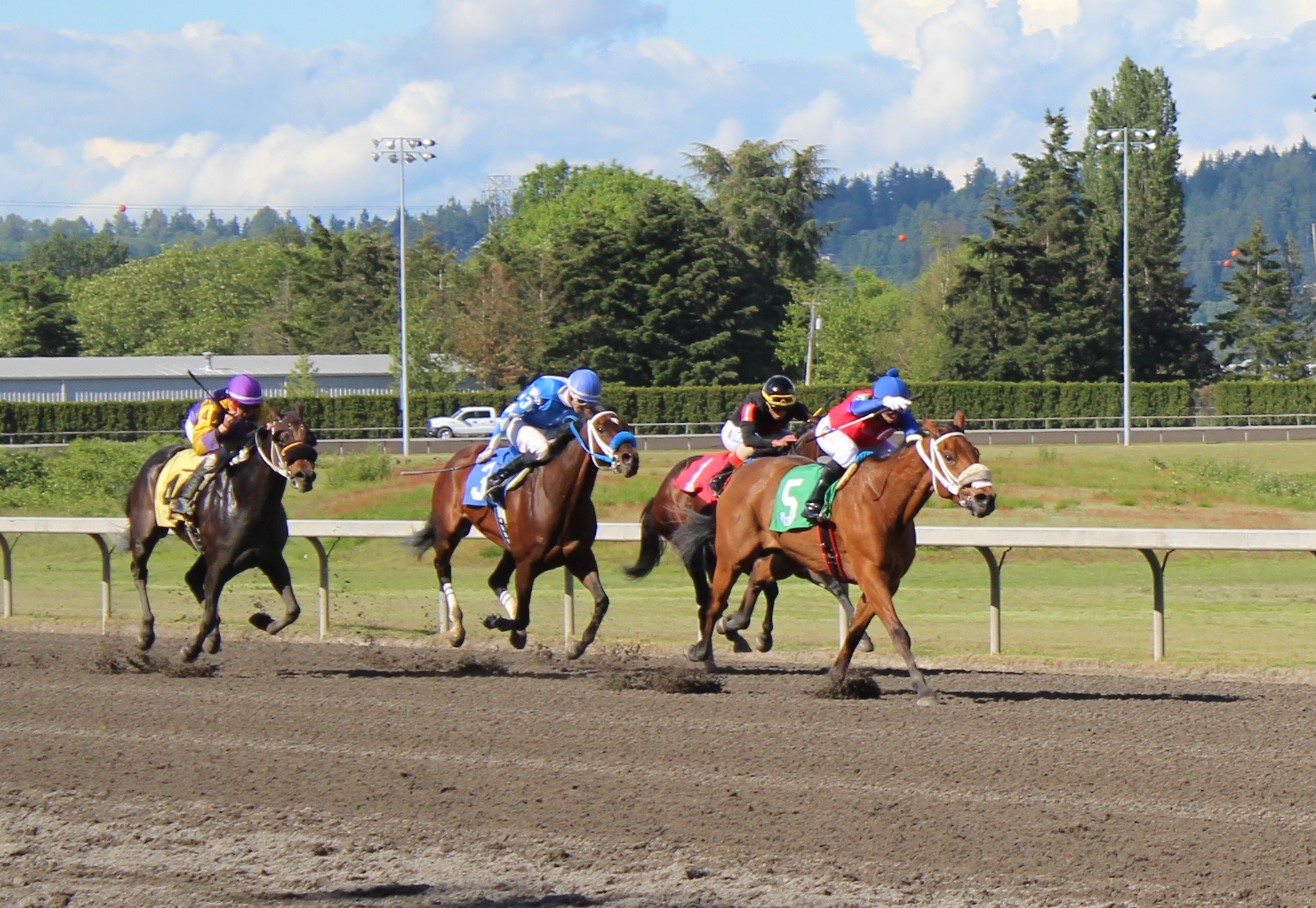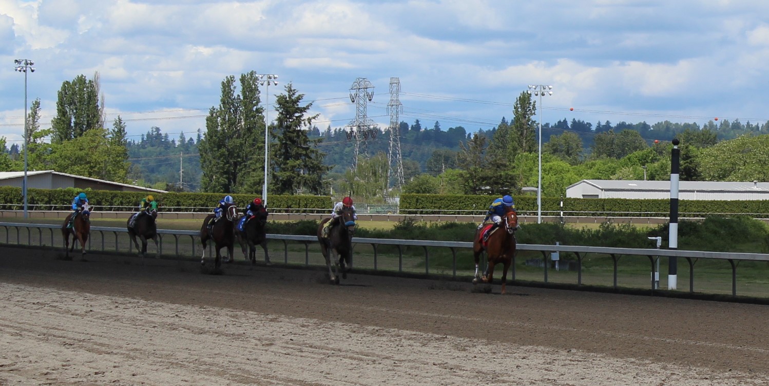 6 broke from the gate in the 3rd race going 5 1/2 furlongs and Alex Cruz broke well with 2-1 favorite Stay Sassy to take command leading by a length all the way to the top of the stretch setting reasonable fractions of 22.11 and 45.53 leaving Sassy plenty of sassiness for the final 2 furlongs stretching that lead and winning 2 1/2 lengths. Stay Sassy stopped the clock in a final time of 1:03.53 and races for Dave and the Little Lady Stable and trained by Charles Essex. Stay Sassy is a 4-year-old filly by Stay Thirsty out of Pippa Bou Peep by Harbor the Gold and bred here in Washington State by Dave and Linda Olson.