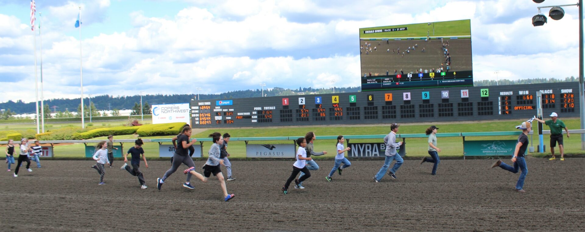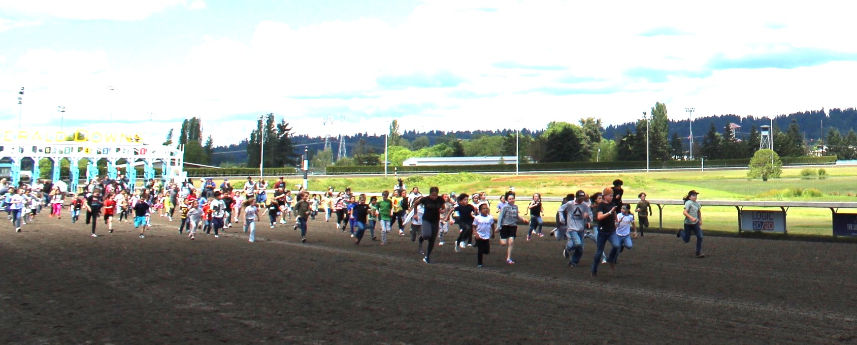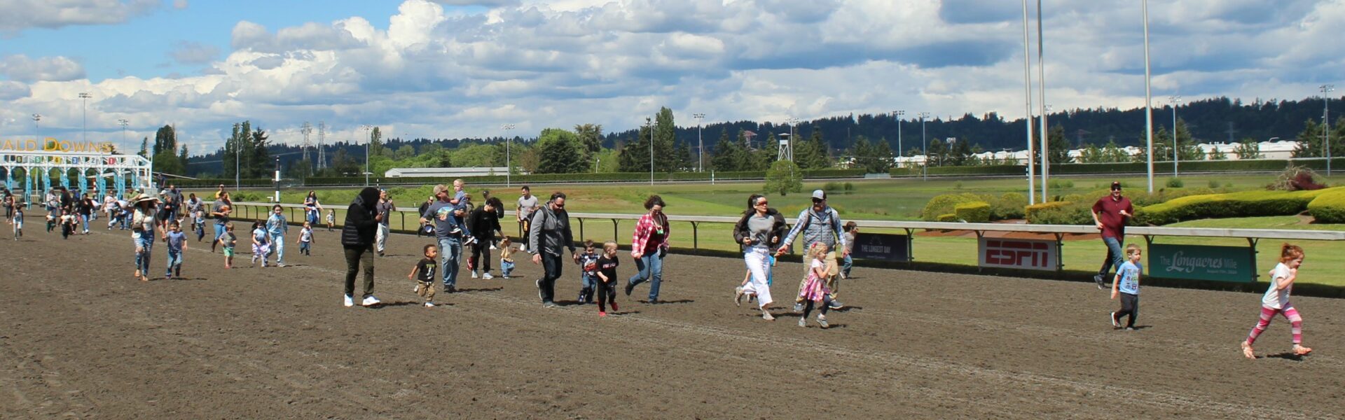 The Promotions crew hosted their first family day in the park filled with free activities and bounce houses. The day is highlighted with a kids race on the track where kids line up in the Emerald Downs starting gate and they race to the finish line. In this race everyone is a winner and all participants got free ice cream.