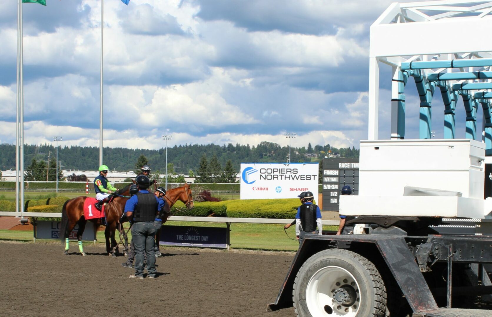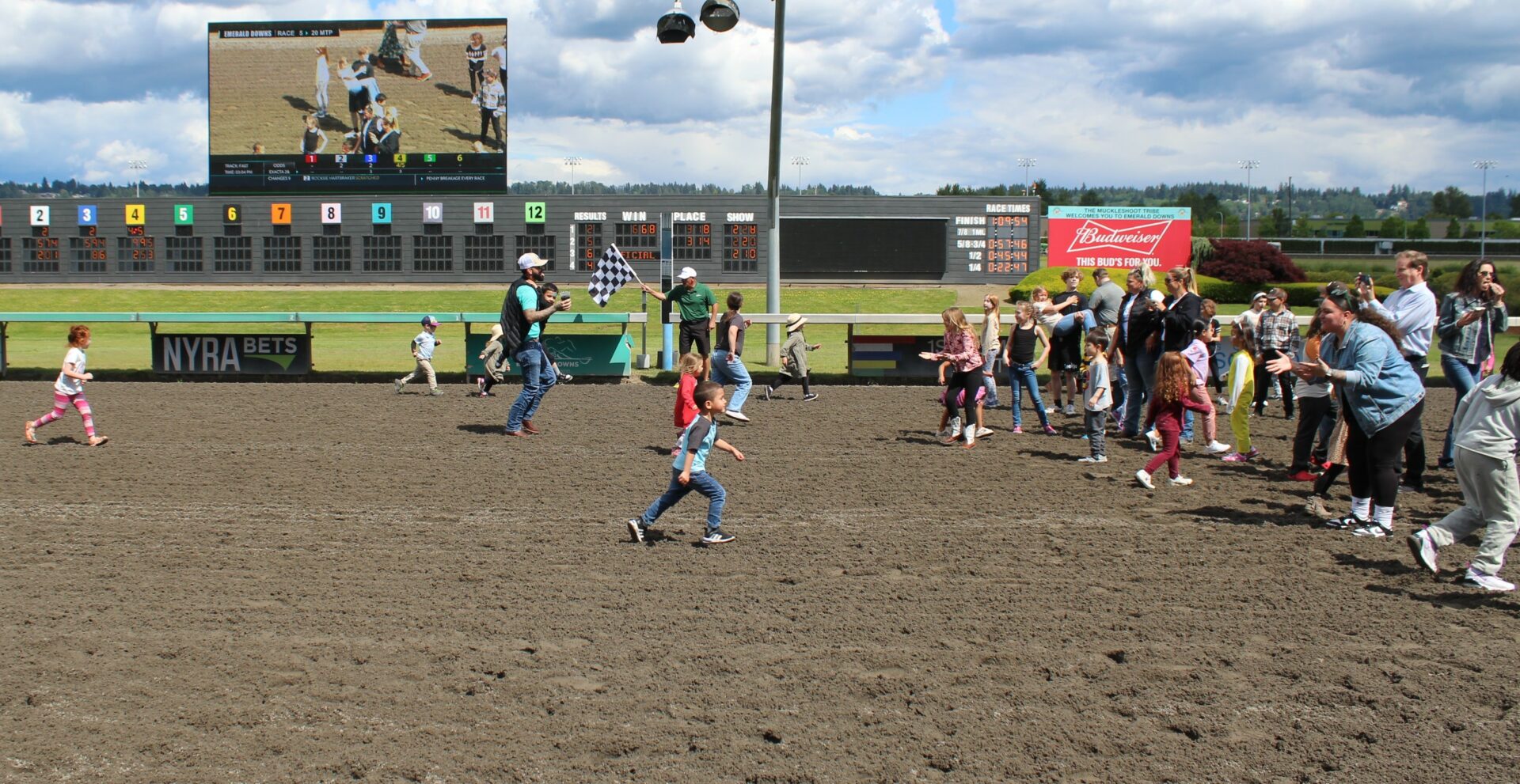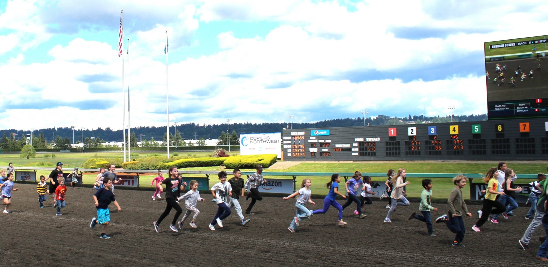 The Promotions crew hosted their first family day in the park filled with free activities and bounce houses. The day is highlighted with a kids race on the track where kids line up in the Emerald Downs starting gate and they race to the finish line. In this race everyone is a winner and all participants got free ice cream.