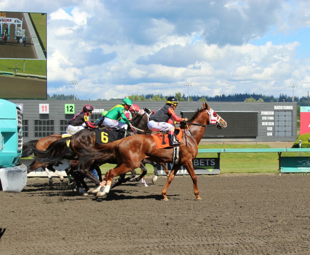 The Muckleshoot Casino Purse was Sunday’s feature race and had a field of 6 going 6-furlongs. #3 You Go Girl with Alex Cruz was the betting choice at 9-5. While #1 Ruby Ray with Karlo Lopez and #4 Silvery Orb with Jose Zunino were the 2nd choices at 5-2. Stein’s Girl with Silvio Amador, Young Life Laura and Carlos Montalvo and Stepup with Francisc Diaz-Lopez were the outsiders.