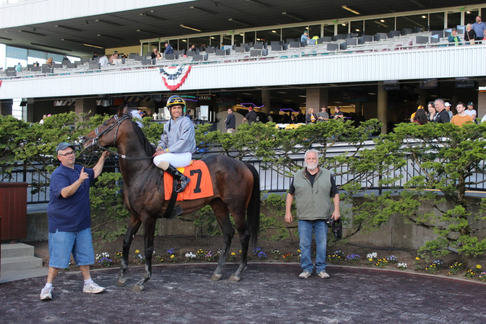 7 went 6 1/2-furlongs in the 3rd and 19-1 longshot Bumping River with Francisco Diaz-Perez jumped out to a 2 length lead running the 1st quarter in 22.60. The hopes of a big win pay ended quickly as 7-5 favorite Another Ten with Luis Reyes rolled up to take the lead entering the far turn and never looked back rolling to a 2 length advantage at the top of the stretch and plenty left to deny 7-2 English Meadow and Karlo Lopez at the wire by 3/4 of a length in a final time of 1:18.88. 7-2 Libby’s Gambit and Kevin Orozco ran on for 3rd and Bumping River held 4th.