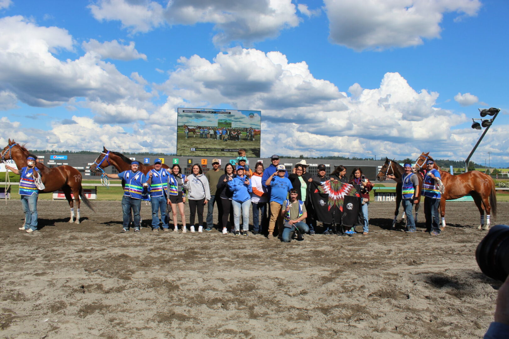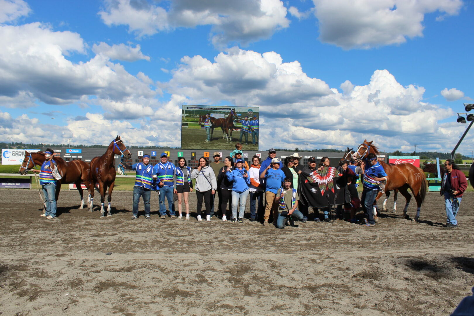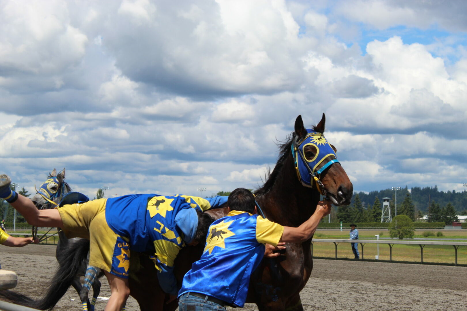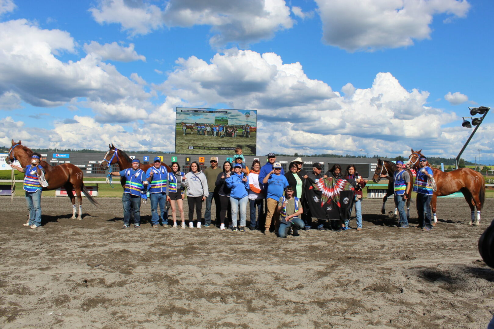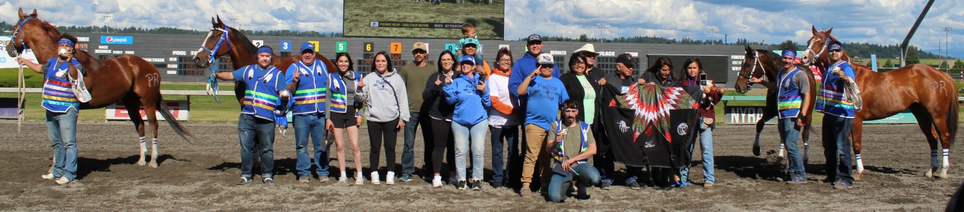 The relay team from Meadowlake, Saskatchewan made their first appearance at the Indian Relay at Emerald Downs a winning one. The team is owned by Curtis Poitras. They have previously competed in both Thoroughbred races and Indian Relay all over the country and Canada. First prize in the Championship heat was worth $11,200.