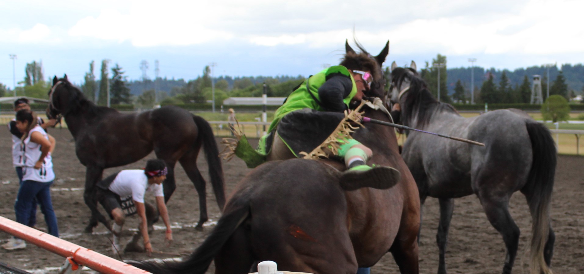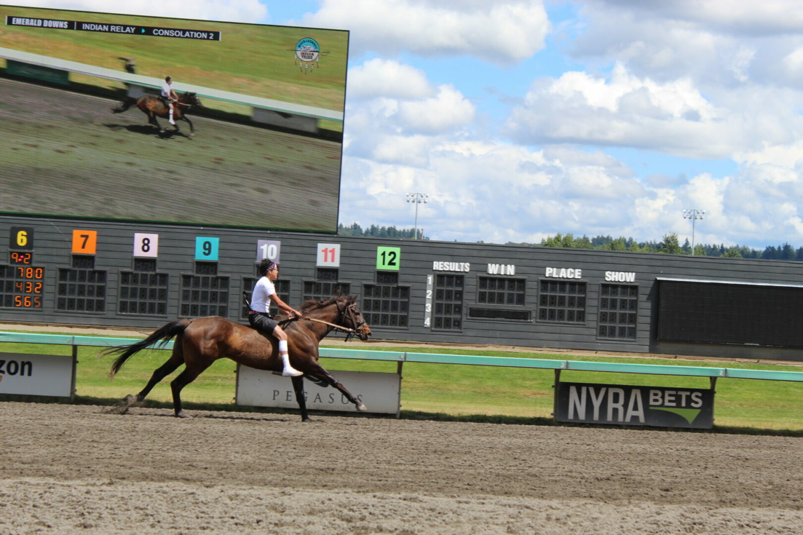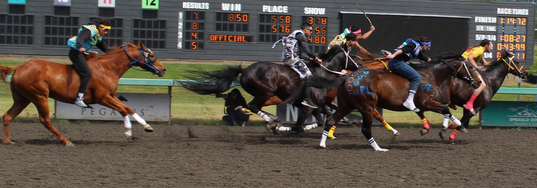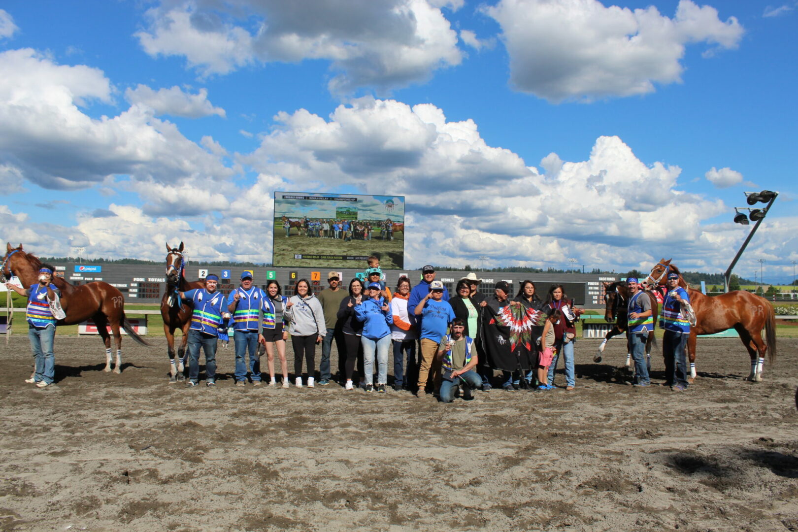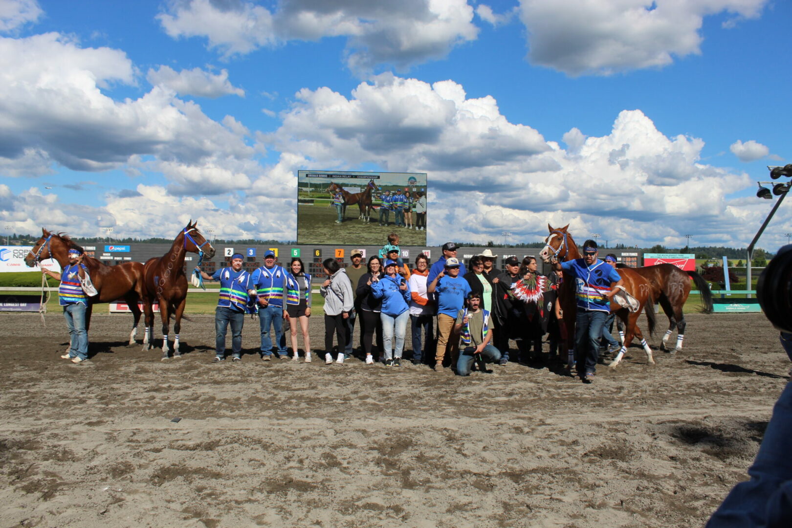 The relay team from Meadowlake, Saskatchewan made their first appearance at the Indian Relay at Emerald Downs a winning one. The team is owned by Curtis Poitras. They have previously competed in both Thoroughbred races and Indian Relay all over the country and Canada. First prize in the Championship heat was worth $11,200.