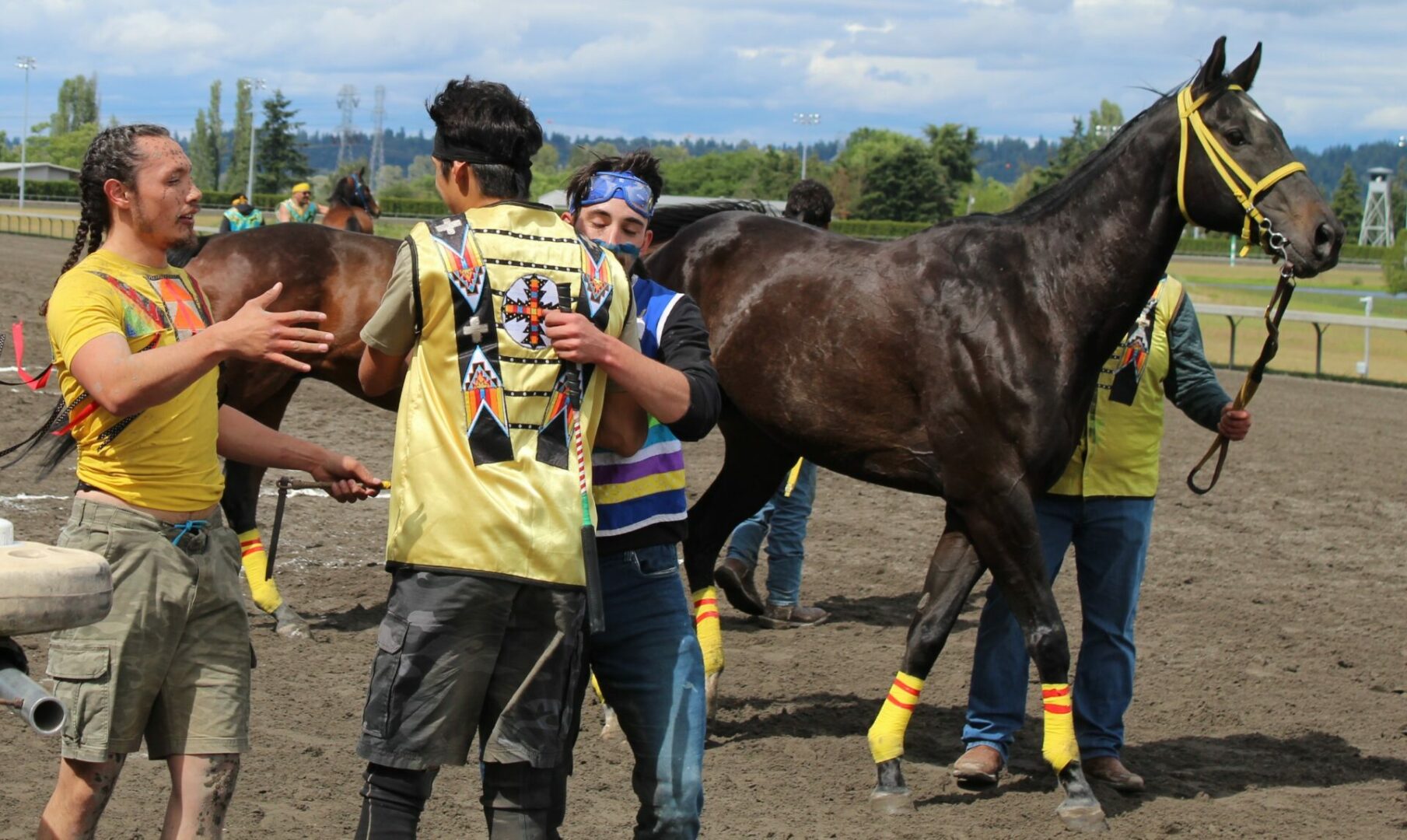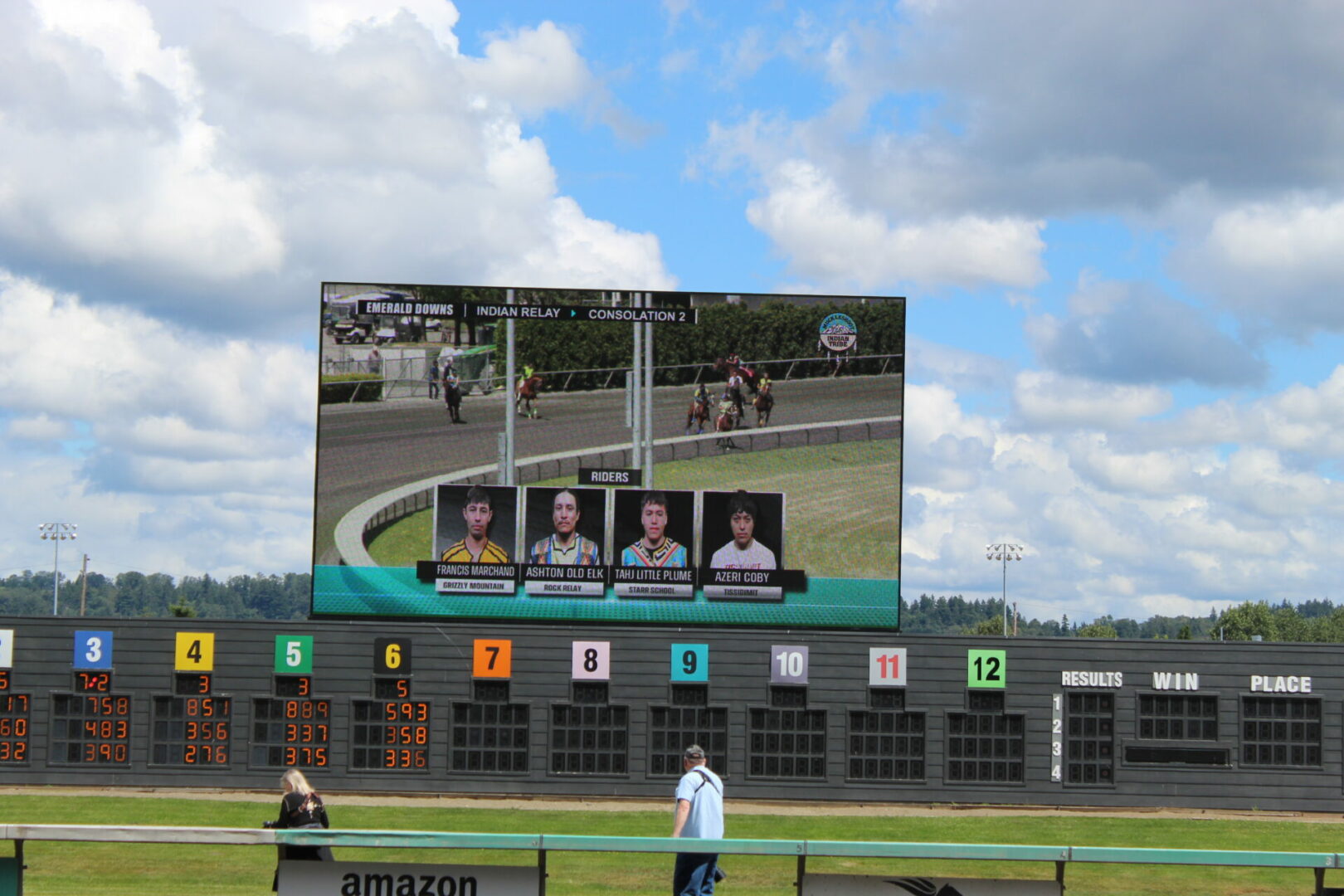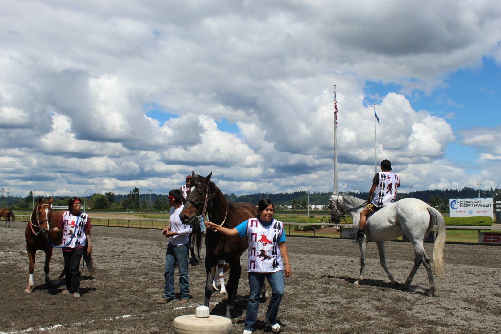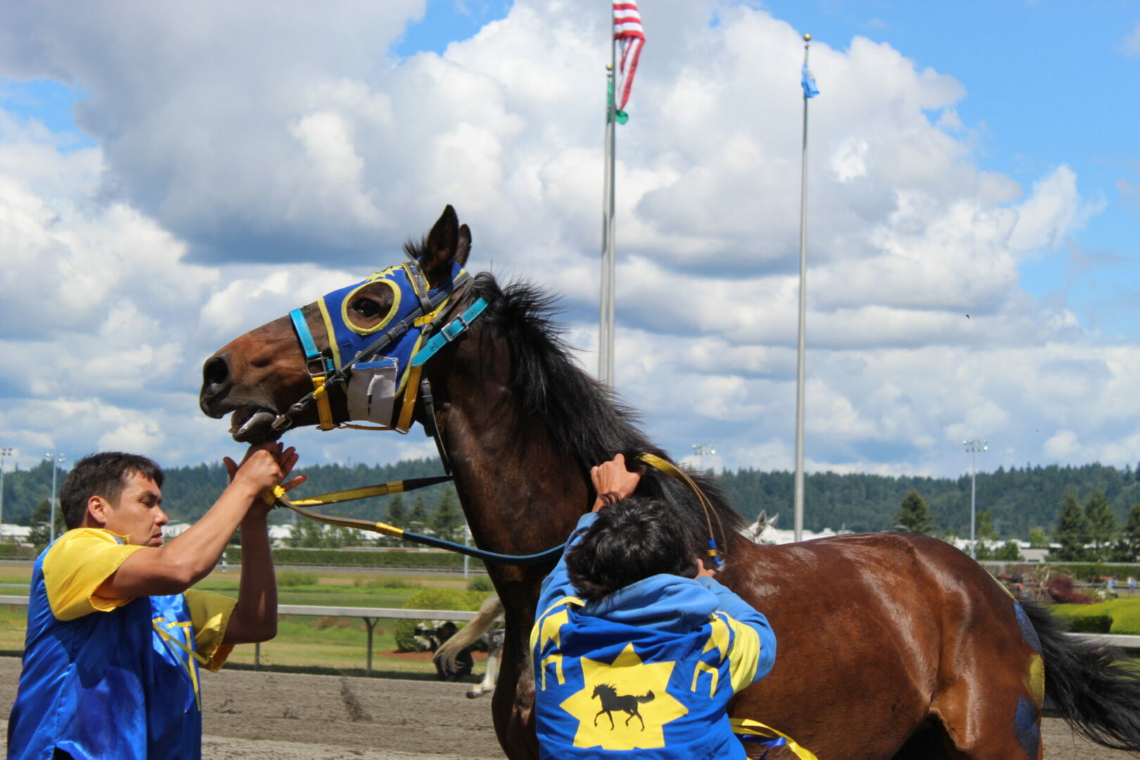 The relay team from Meadowlake, Saskatchewan made their first appearance at the Indian Relay at Emerald Downs a winning one. The team is owned by Curtis Poitras. They have previously competed in both Thoroughbred races and Indian Relay all over the country and Canada. First prize in the Championship heat was worth $11,200.