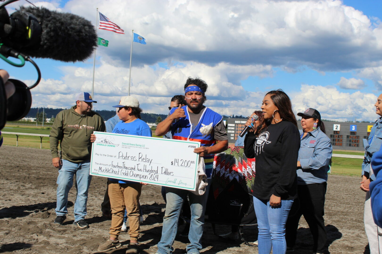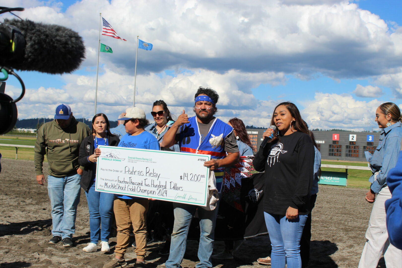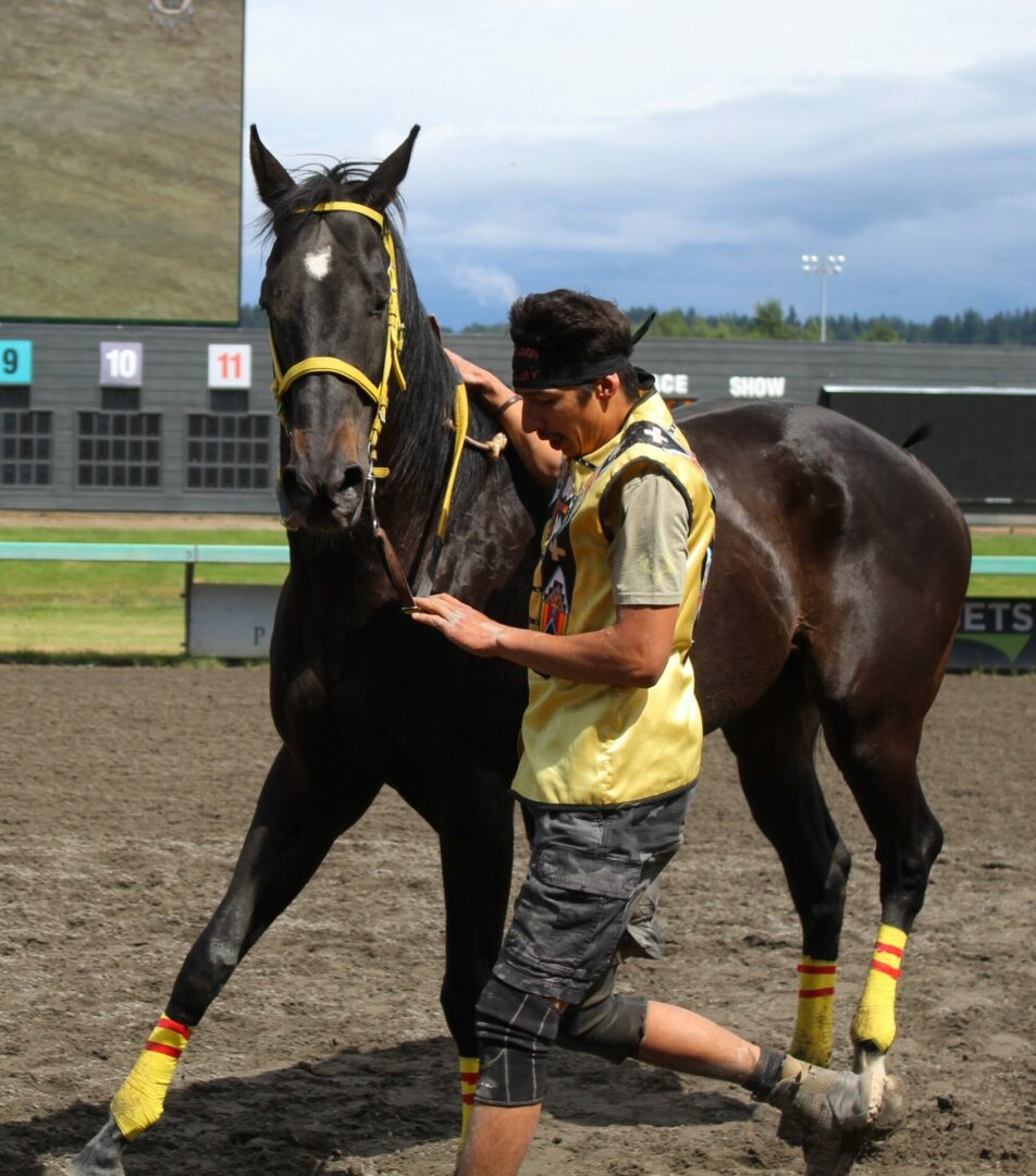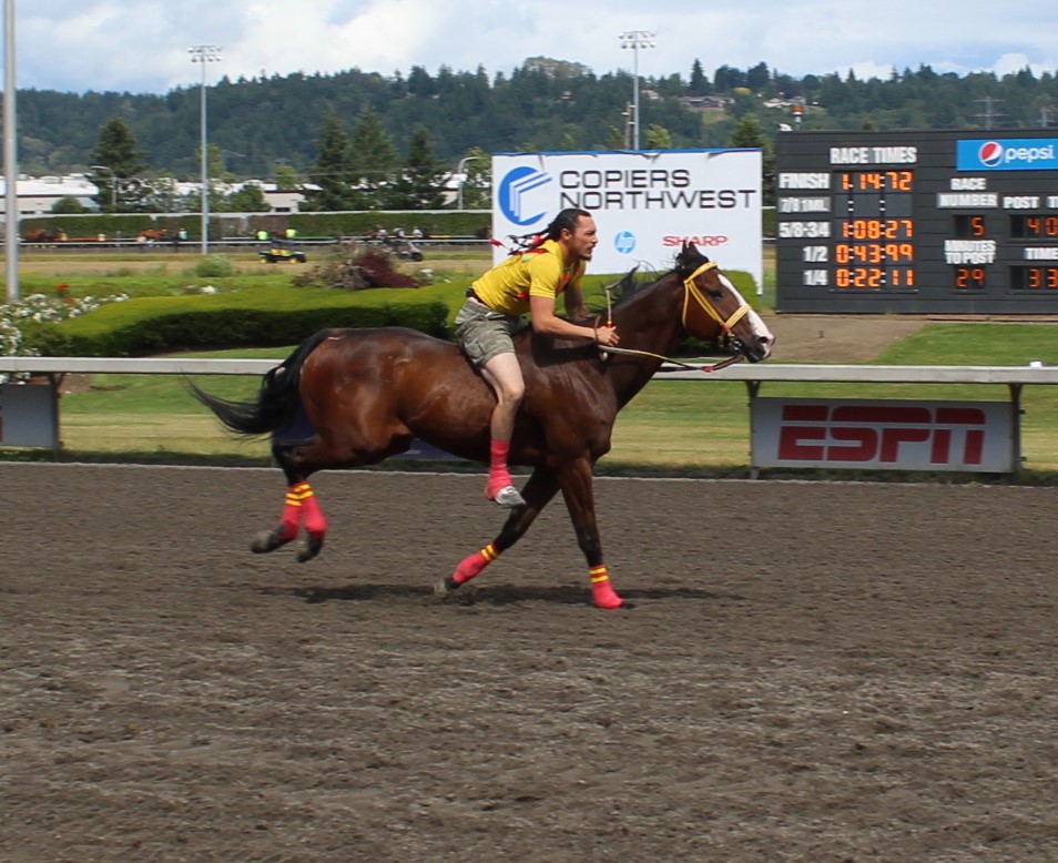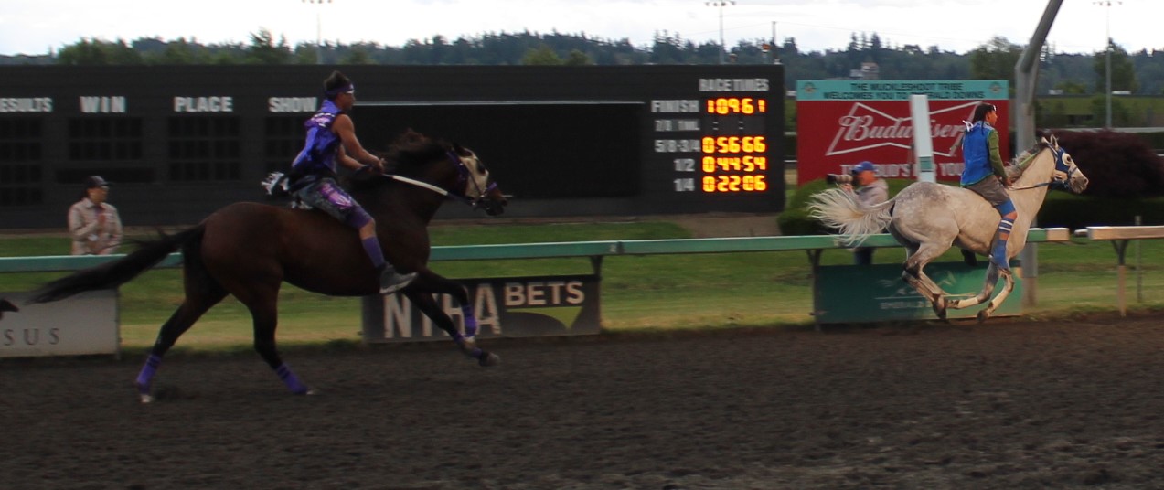 “Seven years ago I was lying in bed watching these races on Youtube,” said Peeaychew who charged passed Mountain Crow Relay in the final stretch run to win by a 1/2 length. That is one of the closest margins in the history of the Muckleshoot Gold Cup Championship race.