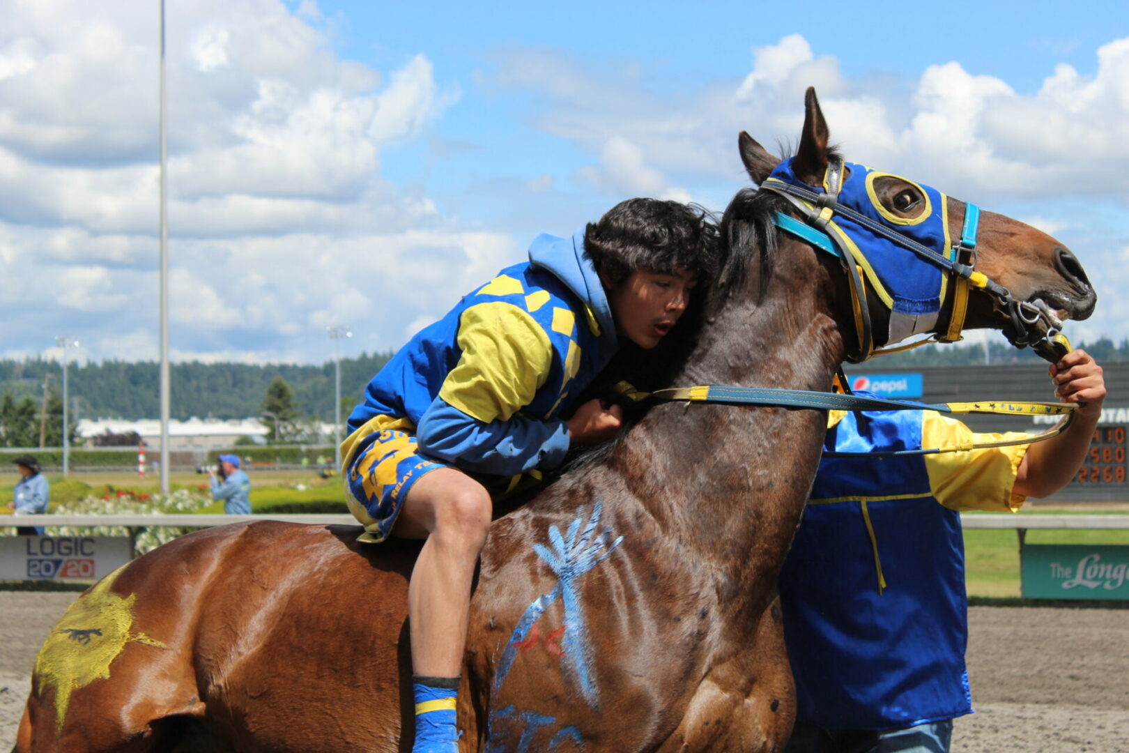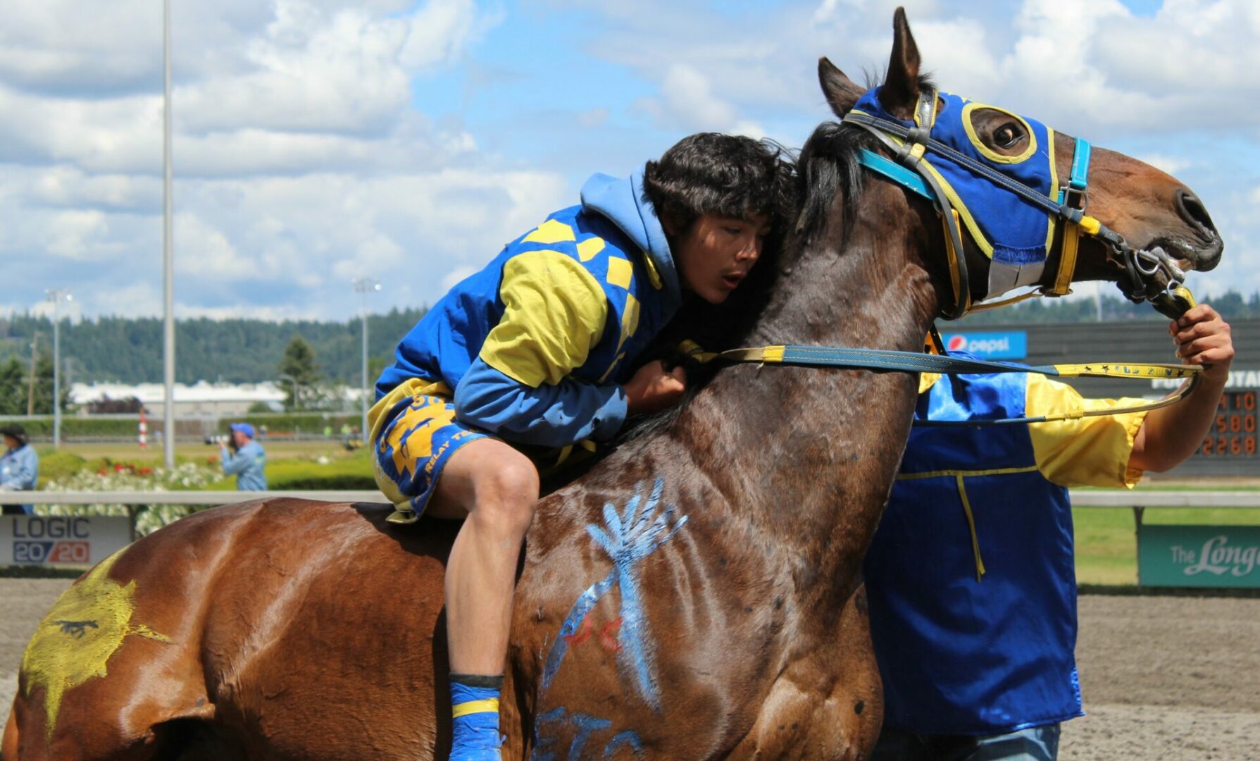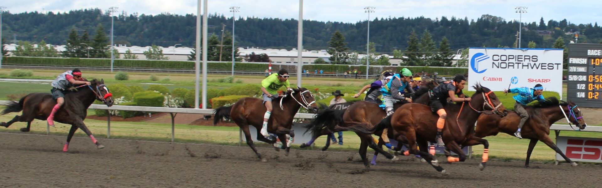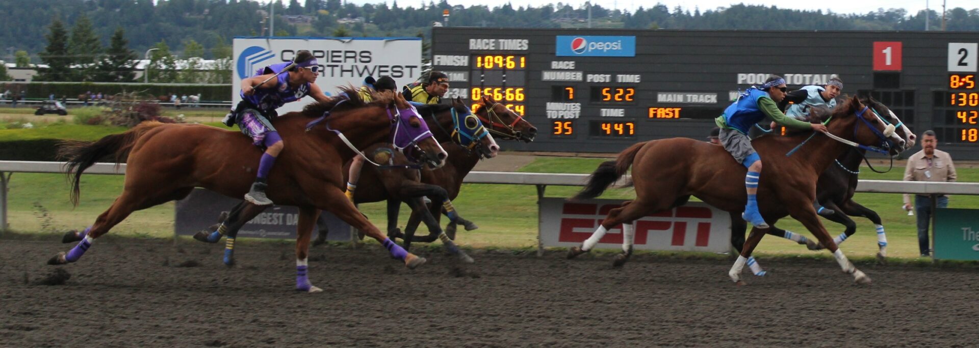 “Seven years ago I was lying in bed watching these races on Youtube,” said Peeaychew who charged passed Mountain Crow Relay in the final stretch run to win by a 1/2 length. That is one of the closest margins in the history of the Muckleshoot Gold Cup Championship race.
