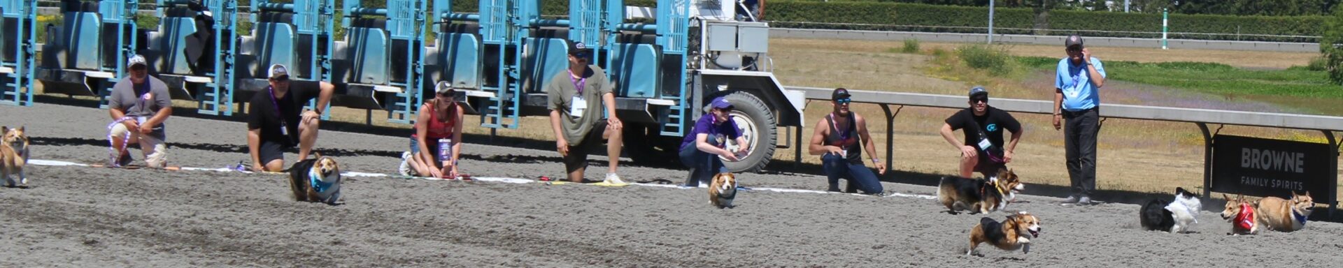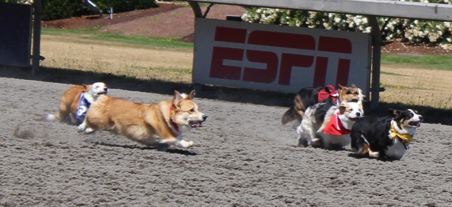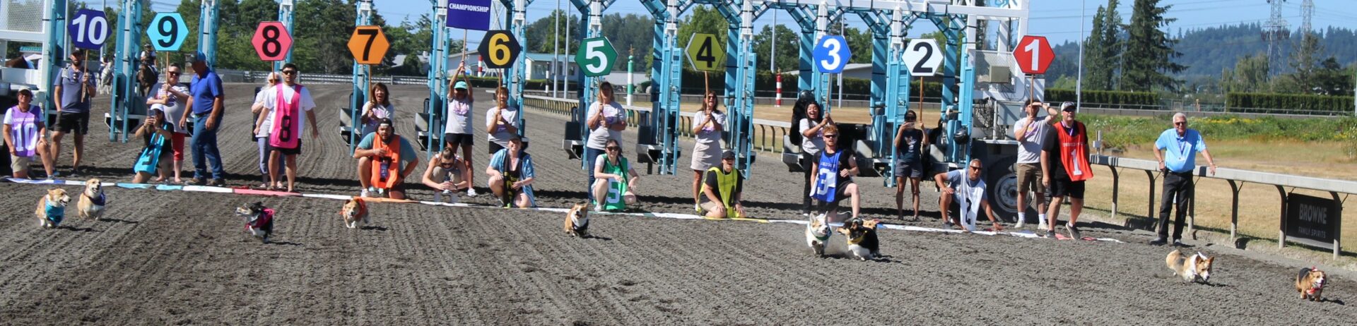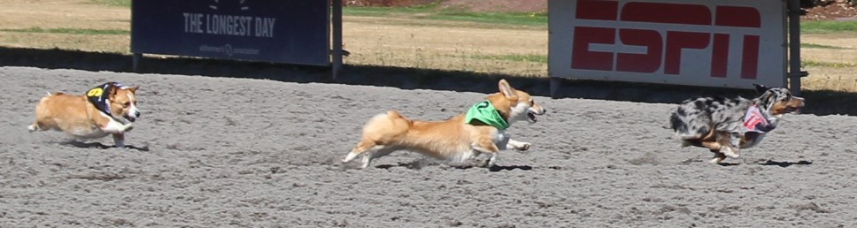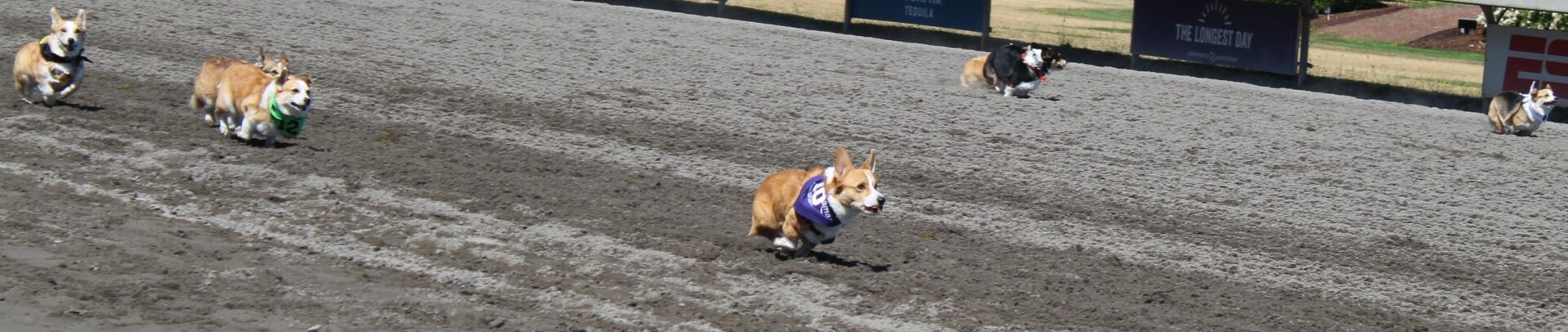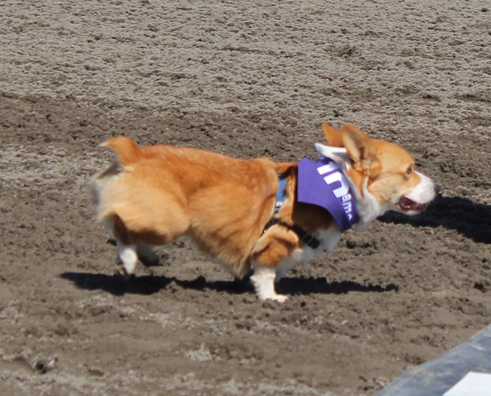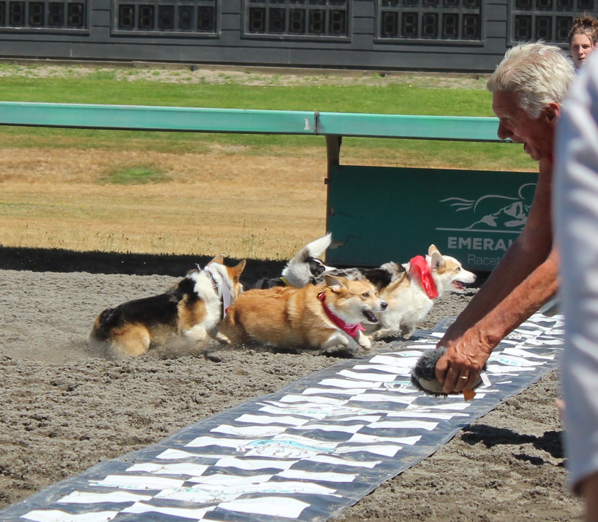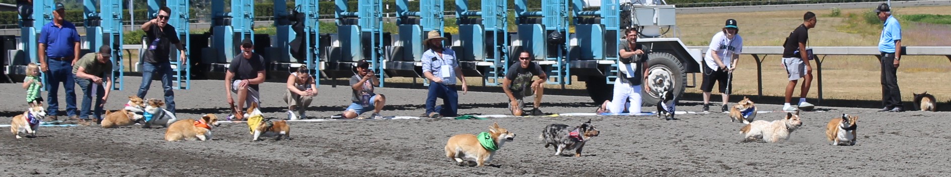 It was Corgi Championship day with more than 100 Corgi’s set to make their run on Sunday. Fields of 12 lined up for 5 qualifying heats after the 2nd thoroughbred race and then 4 more qualifying heats for a total of 9 were run after the 3rd race. The winners earned their way to the Championship heat with last year’s champion for a field of 10 and was run after the 5th race.