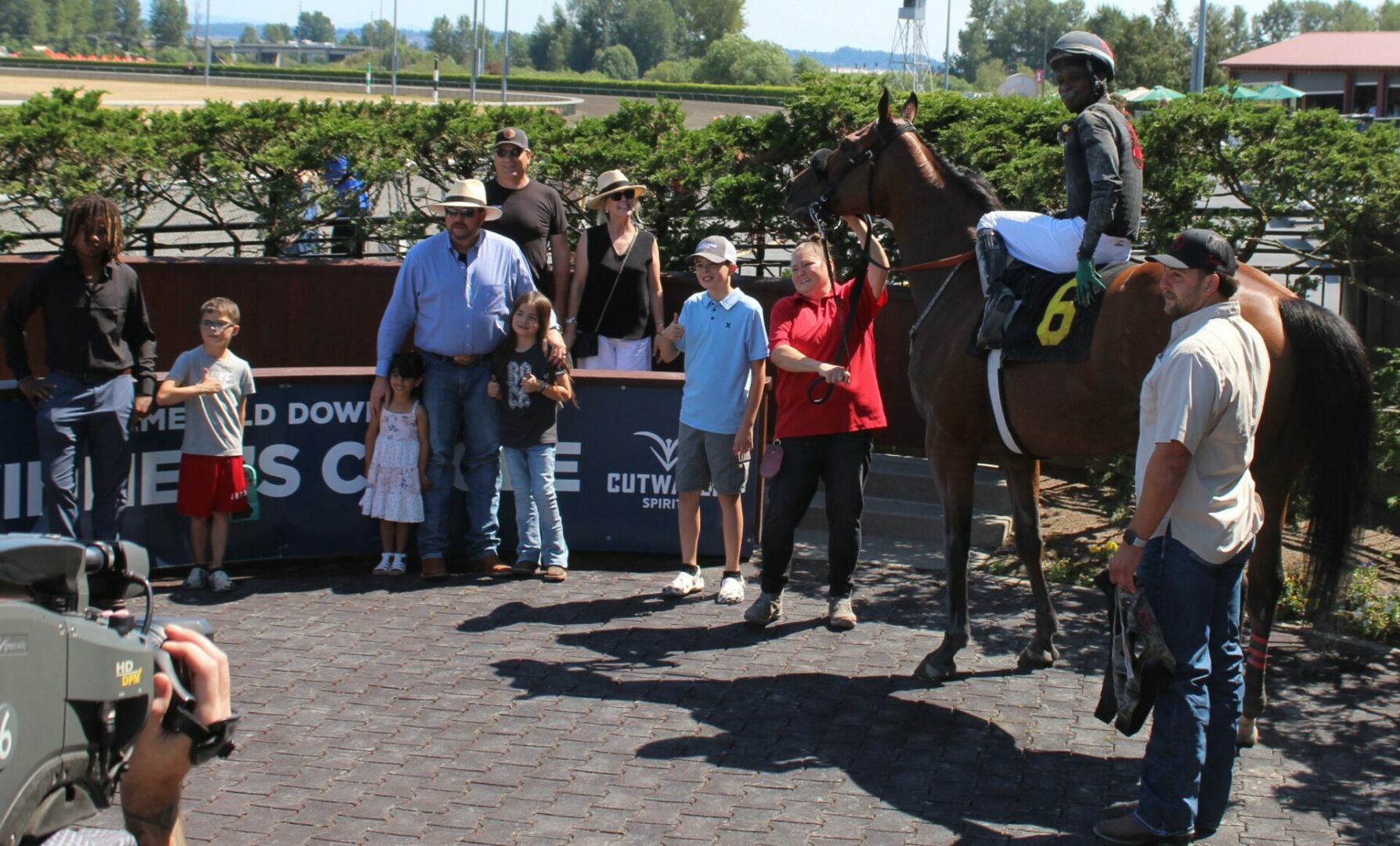 It was a double Winner’s Circle ceremony with #9 Arma d’Oro going first and finishing with #10 Slew’s Tiz Whiz. Arma d’Oro is owned by Rakoczy Racing and trained by Justin Evans. Evans also trains Neiman. Arma d’Oro has run in only 2 Stakes races finishing 4th in last year’s Longacres Mile and now winning his 2nd ever Stakes start. Arma d’Oro is now 7-4-6 from 32 lifetime starts. The owners recently claimed Arma in his 1st start of the season for $25,000. Arma d’Oro earned $18,750 to push his career earnings to $151,370.