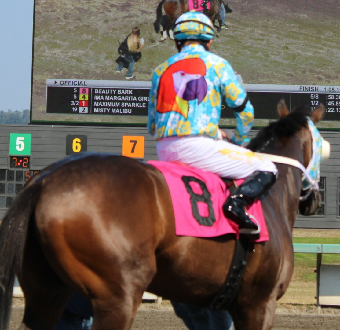 Not only did Beauty Bark win for the 1st time for Barkley the new ownership group the Parrot Heads lit up the track with their silks. The over the top fun and colorful silks certainly will catch your eye. Then in the 7th race the new Baby Shark ownership sent out Hey Sequoia with Leslie Mawing and immediately threw their hat into the ring for the newest and most fun silks at the track. Kudos to both groups for lighting up the skies with their new colors!