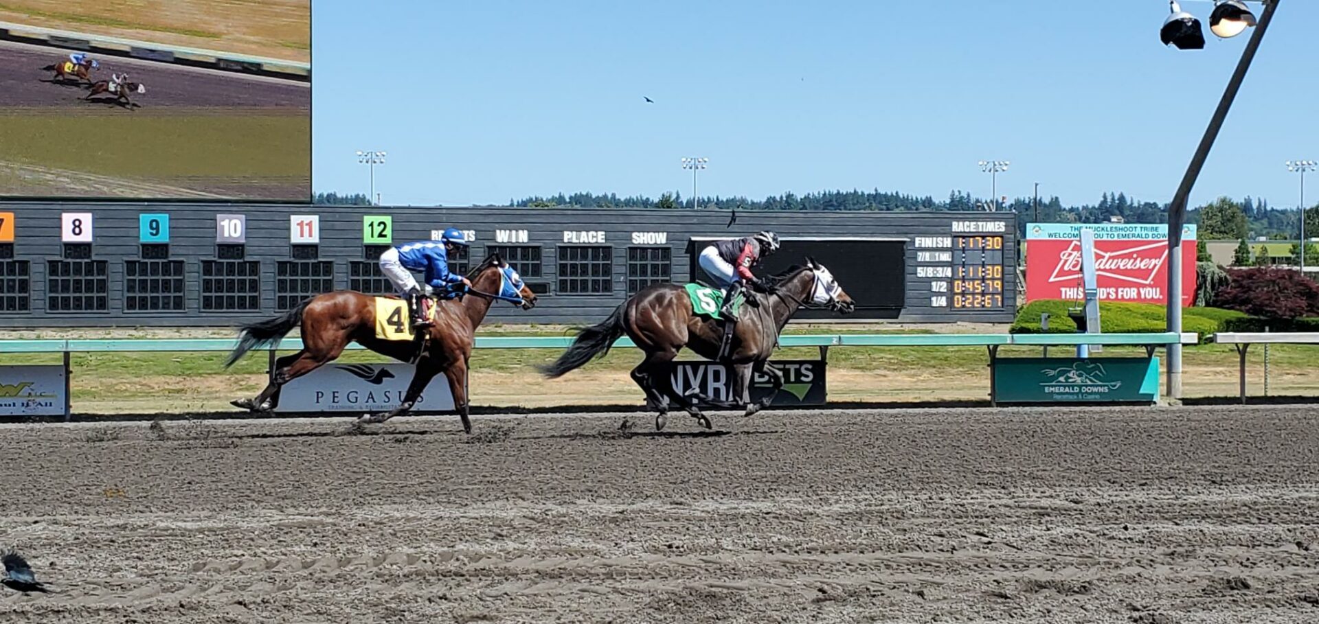 Trainer Blaine Wright was sitting on Emerald Downs win 499 coming into the weekend and scored his 500th win on Sunday in the 4th race when Checkered Flag nosed out Goin’ South for the win.Kevin Orozco got the win for owners William and Mary Lou Griffin, Steve Kinross and Cherie Wright for Blaine Wright’s 500th win.