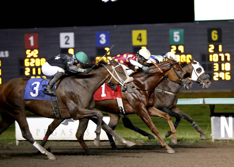 However, the closers were winding up and 2-1 favorite Roll Dem Bones with Juan Gutierrez would poke his head in front at the 1/8th pole while from last 7-1 Dennard and Luis Reyes were hitting their stride in 3rd. The 3 of them would go head and head to the wire with Lie and Deny “denying” the closers with a nose win over Dennard who was a head in front of Roll Dem Bones who was just a 1/2 length in front of Napoletano with Allyssa Morales for a crowded bunch at the finish line.
