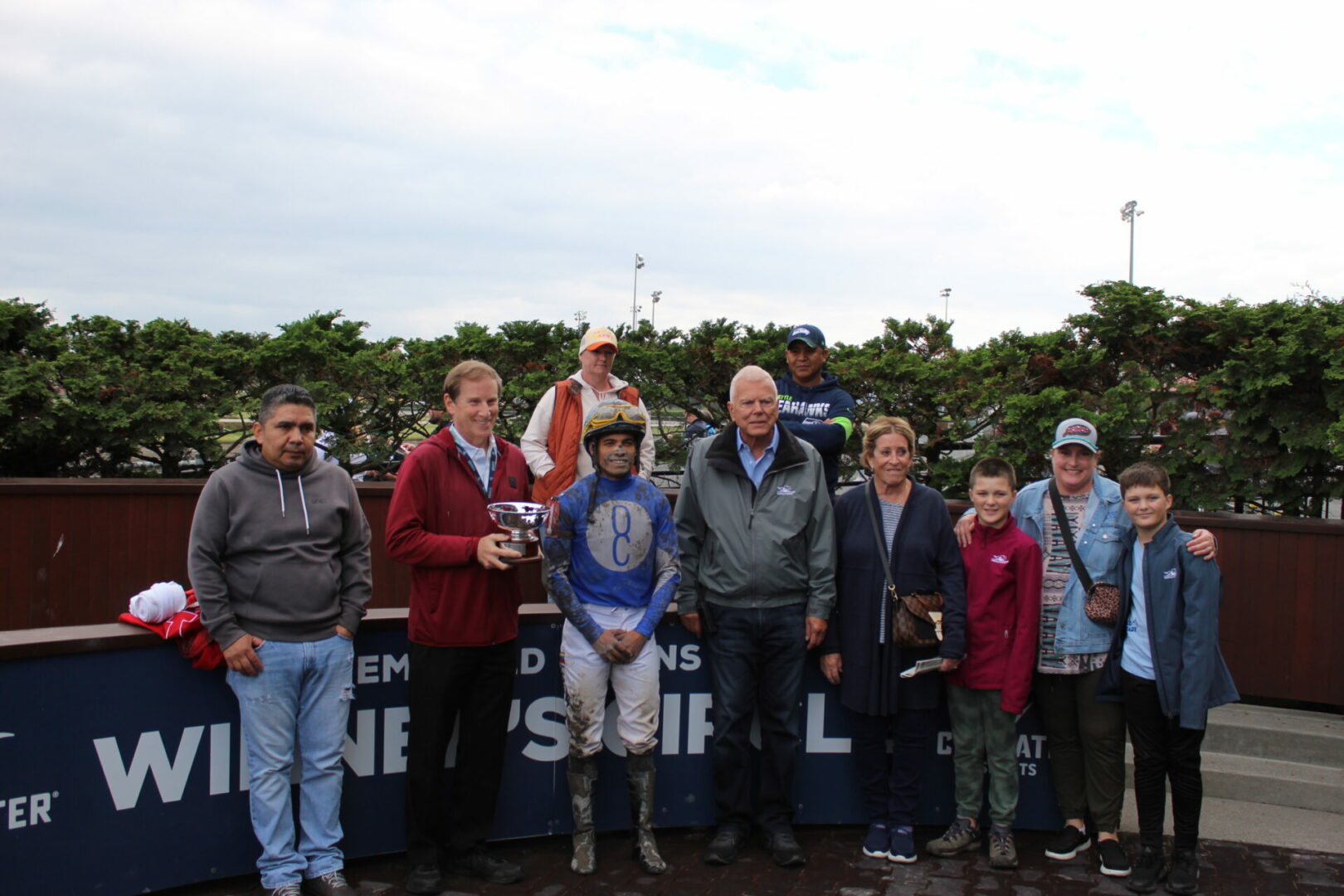 The 1st race on the card was the Jose Zunino Retirement purse and Jose was on hand with all his fellow jockeys to take in the race named in his honor. In a field of 4 going over a sloppy track the 7-5 favorite The Lair with apprentice Manuel Americano would quickly take the lead in the 5 1/2 furlong dash and build a 2 1/2 length lead into the stretch and the duo just extended that lead to a 3 1/2 length victory in a final time of 1:04.00.