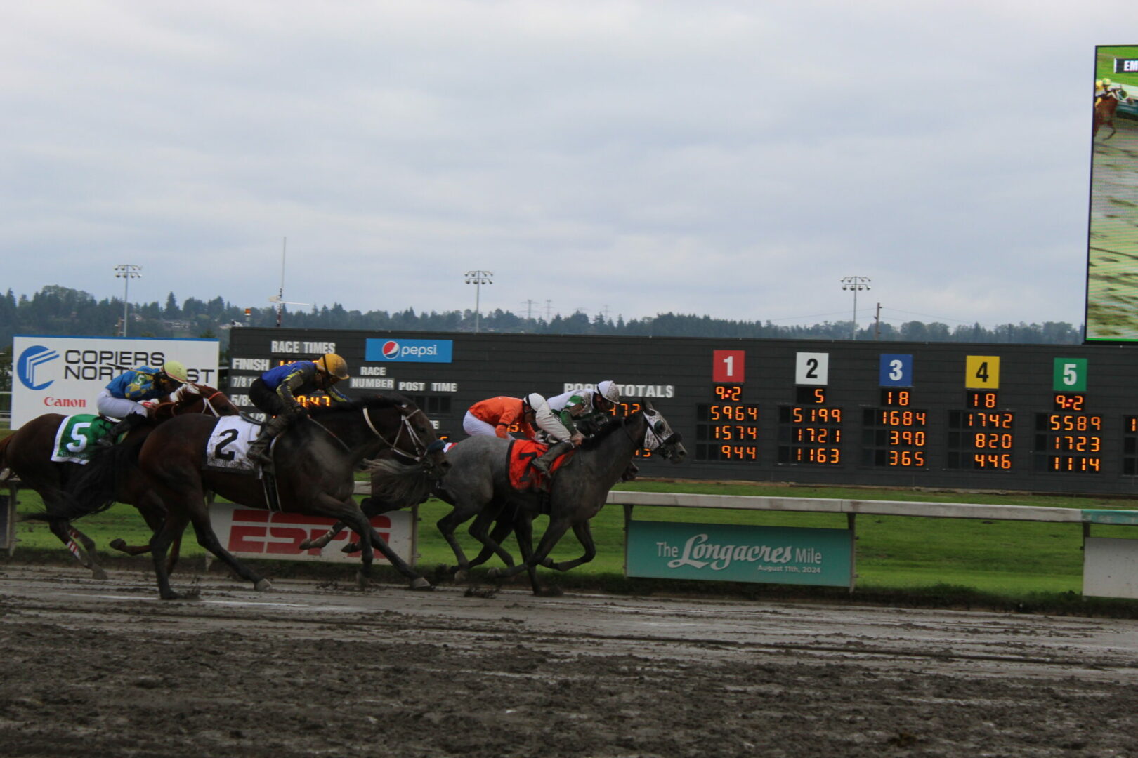 8-1 Coastal Kid and Alex Cruz was sitting in 4th and was the clear next best by 3 lengths in front of 3rd place Its Kraken Time and Luis Reyes at 10-1 while odds-on choice Coastal Jazz and Kevin Krigger never got a hold of the wet-fast track and ran an even 4th with Papa fading to 5th.