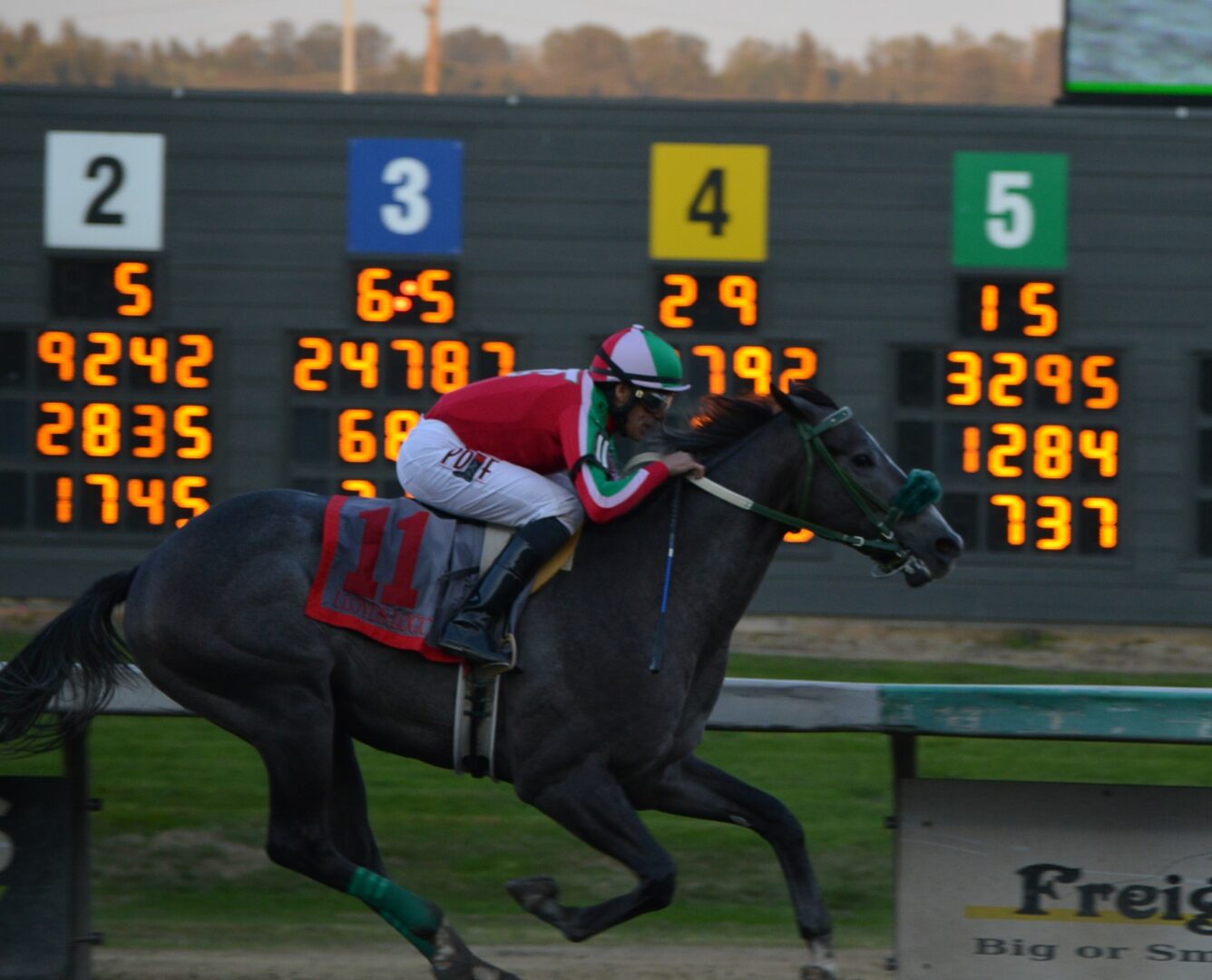 A Skip in the Park was bet down to 1-1 favoritism and had Zunino’s preferred running style closing from well off the pace. When the gates opened for the final time for Zunino he went straight to the back of the pack of 6. Zunino allowed the speed to run on while he saved ground on the rail. Heading into the turn Zunino began to get after Skip and they closed a lot of ground on the rail before swinging to the outside for the stretch run and rolled over the top of them all to the roar of the large closing day crowd with everyone rooting for Zunino to go out on top. Zunino and A Skip in the Park did not disappoint pulling out to a 1 1/4 win.