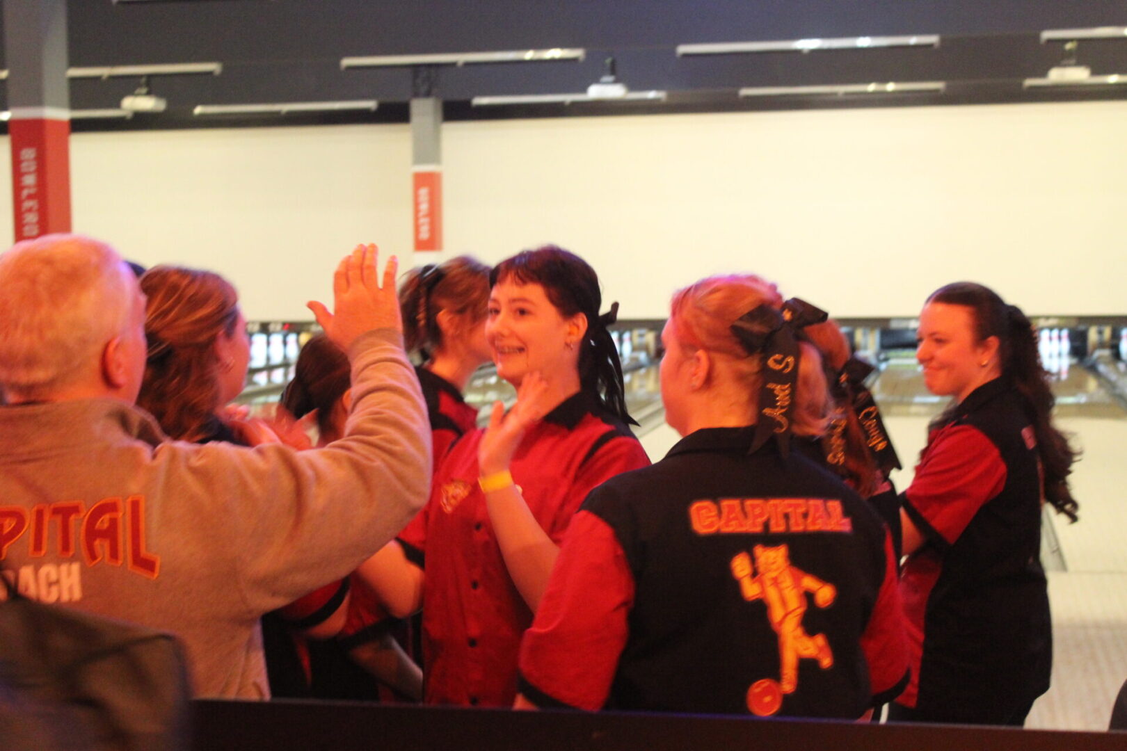 Hermiston’s Lily Fields’ consistent bowling all day put her in contention but settled for 2nd. Fields book-ended her scores with a 203 and a 201 with a 183, 187, 180 and 170 in between. Although she fell off after the break Hewes’ early lead held up enough for her to take 3rd place. And Capital senior Talia Gubbe didn’t break 200 but also super consistent with all of her games between 173 and 194.