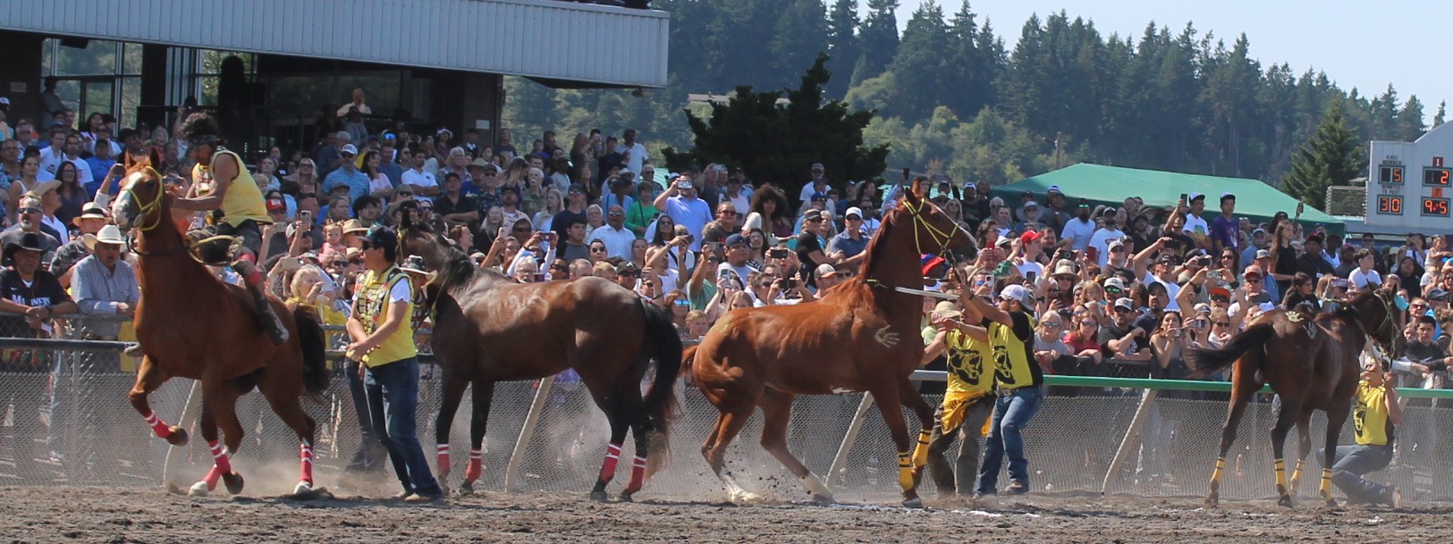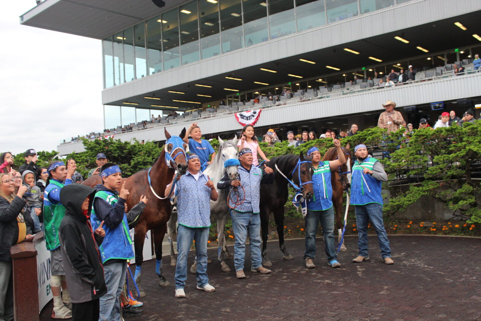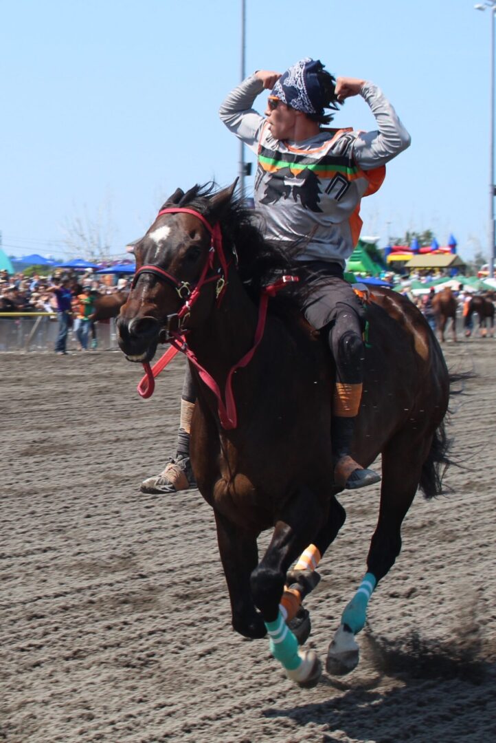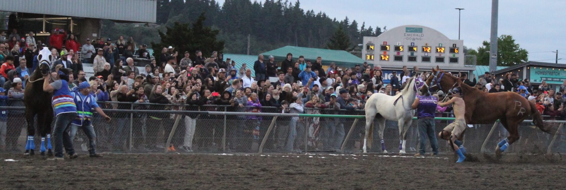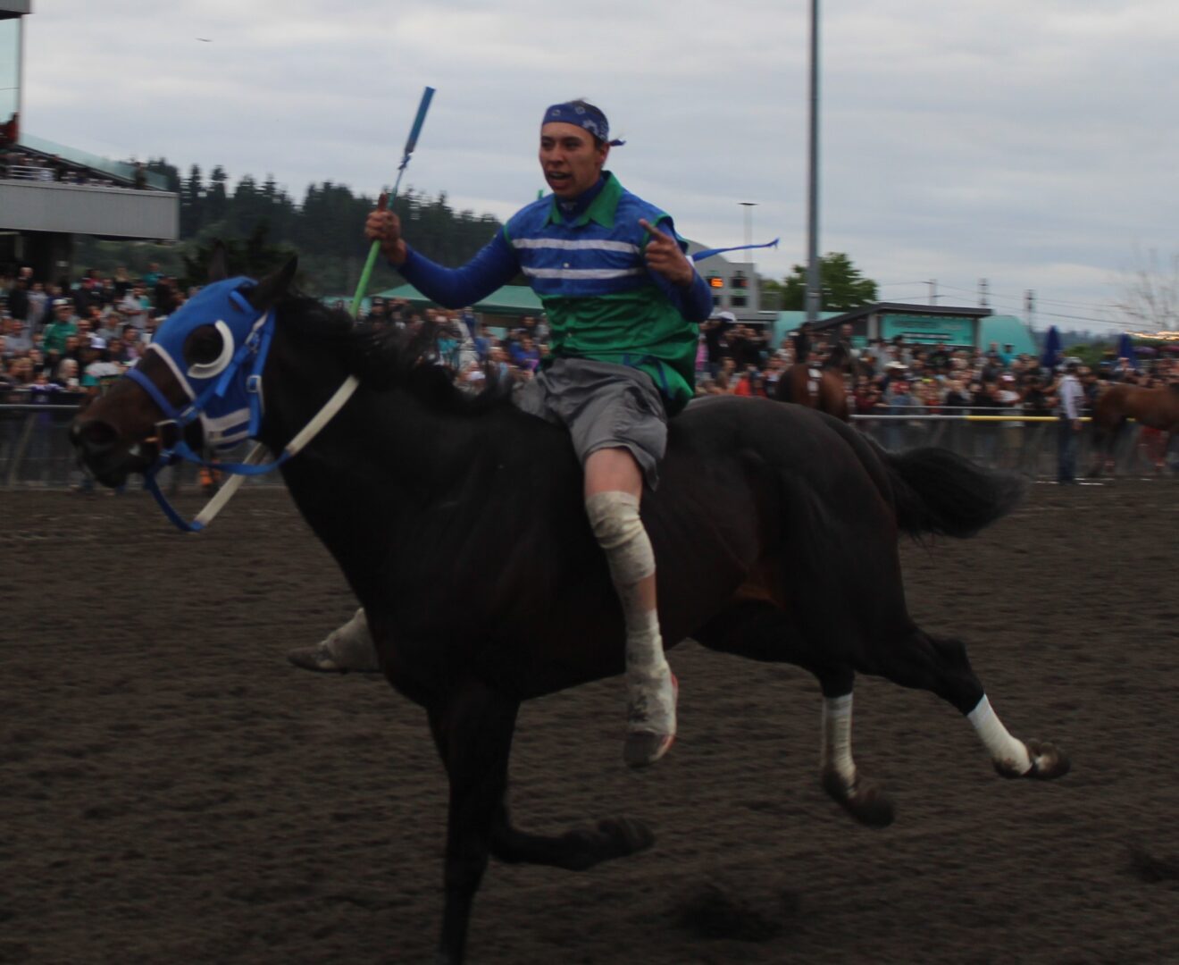 The field was well bunched heading into the backstretch for the first time and a rough transition saw Amskapi Pikunii lose their rider and would finish last. Meantime the scramble was on for those who survived the chaos of the first exchange as they headed for the 2nd transition in front of the Emerald Downs stands. Strong Horse Relay and Kamius Pakootas emerged with a perfect exchange and took a big lead over Big Metal with P. G. Nomee and Big Tobacco ridden by Ian Big Tobacco.
