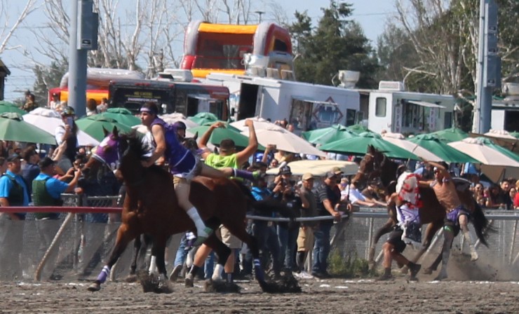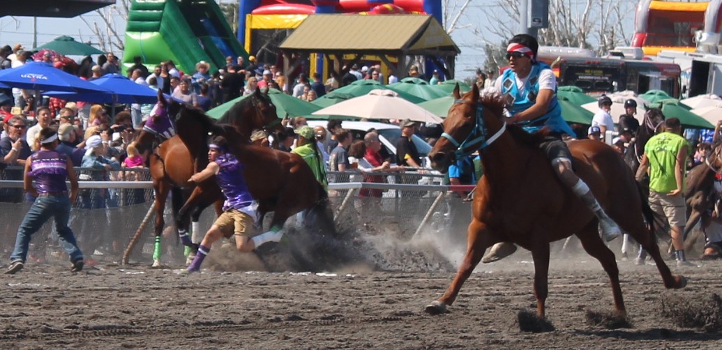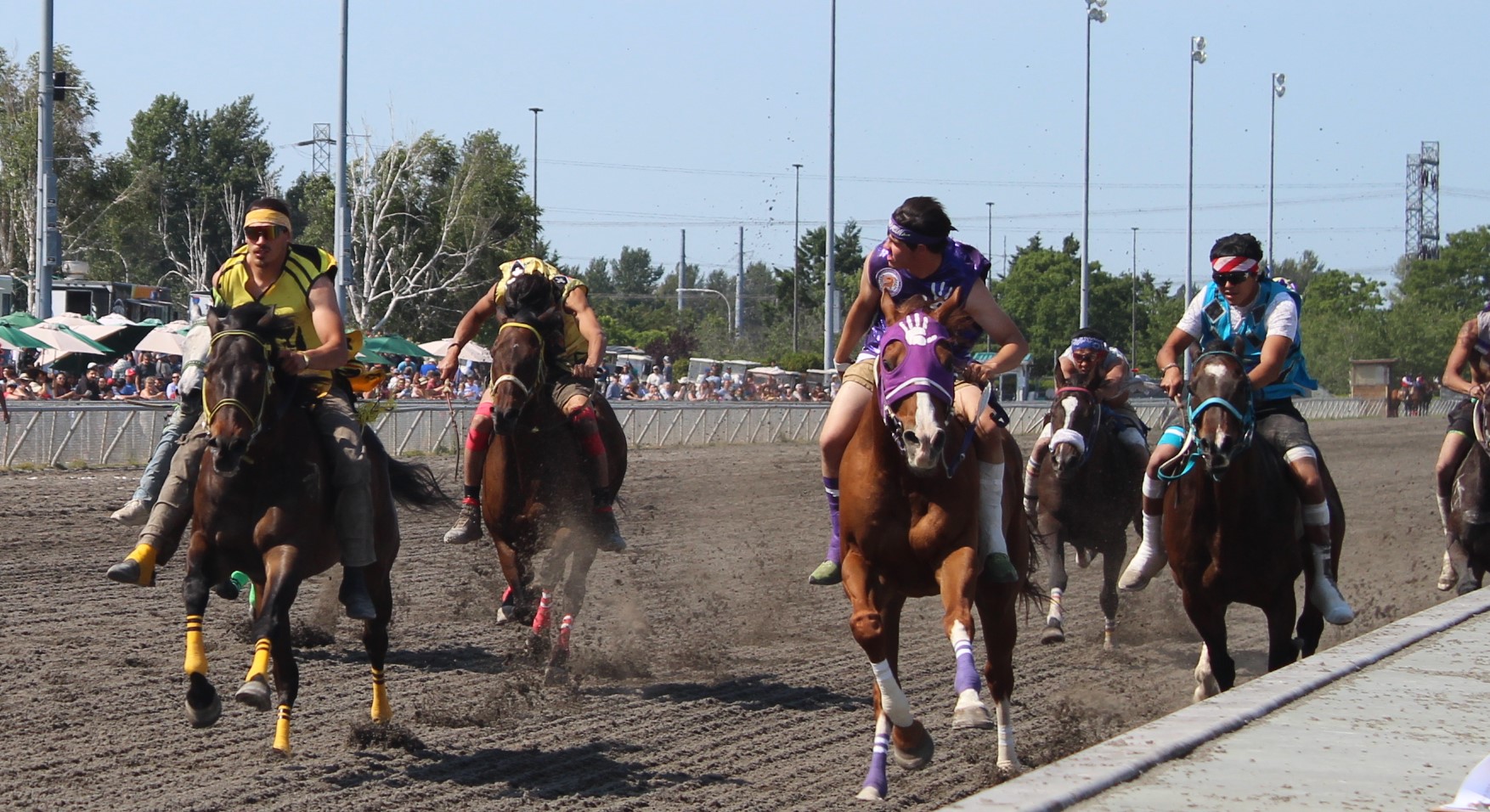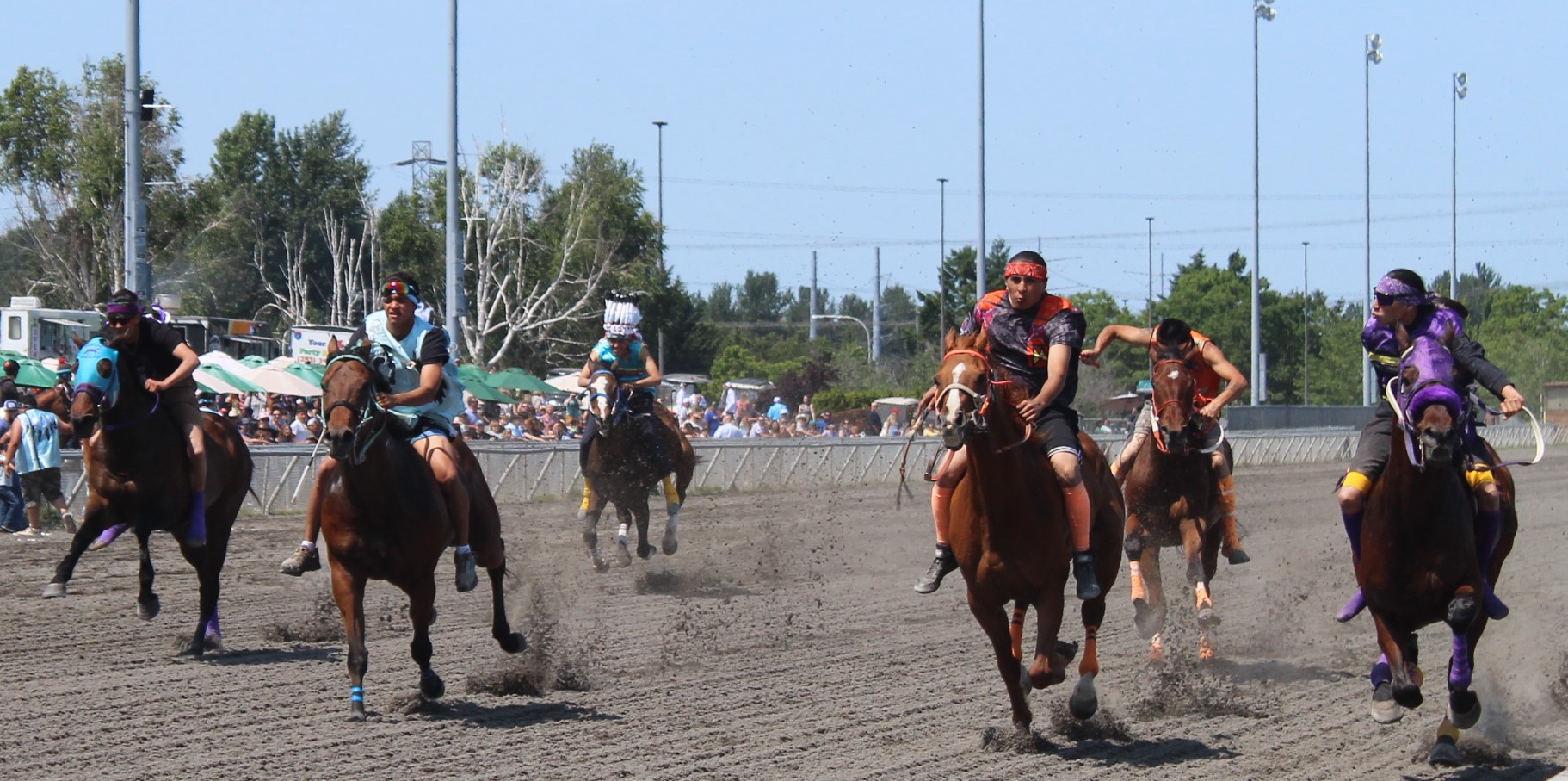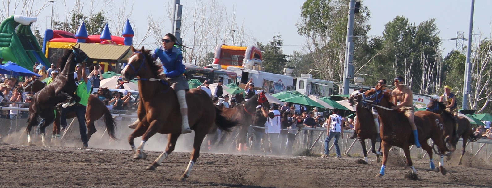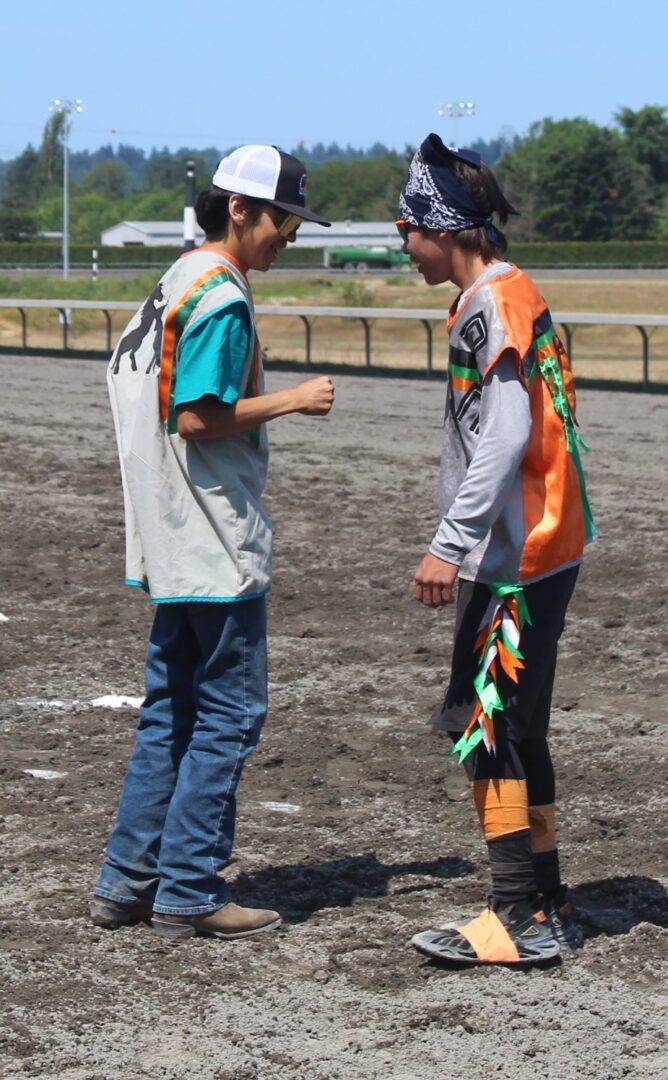 The field was well bunched heading into the backstretch for the first time and a rough transition saw Amskapi Pikunii lose their rider and would finish last. Meantime the scramble was on for those who survived the chaos of the first exchange as they headed for the 2nd transition in front of the Emerald Downs stands. Strong Horse Relay and Kamius Pakootas emerged with a perfect exchange and took a big lead over Big Metal with P. G. Nomee and Big Tobacco ridden by Ian Big Tobacco.