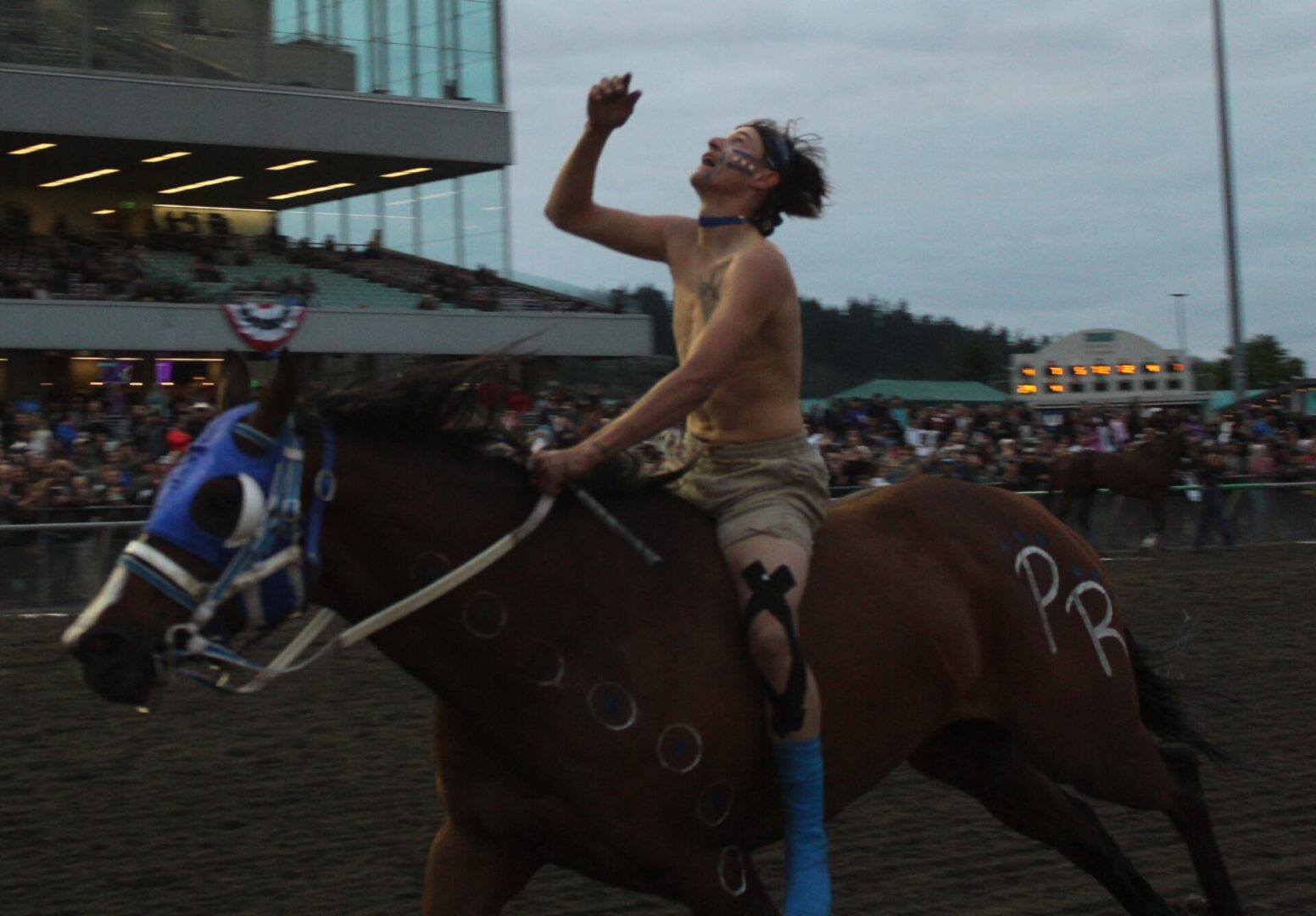 In that 3rd and final transition it went smooth but Peasley had to hesitate as other runners were coming into to transition and this allowed Mountain Crow and Weston Bird to take over the lead by just a length. This is where the faster horse comes into play and Omak Express had plenty left as Peasley quickly made up the ground and drew away on the final turn to create distance between them and Mountain Crow.