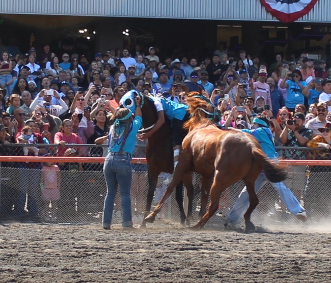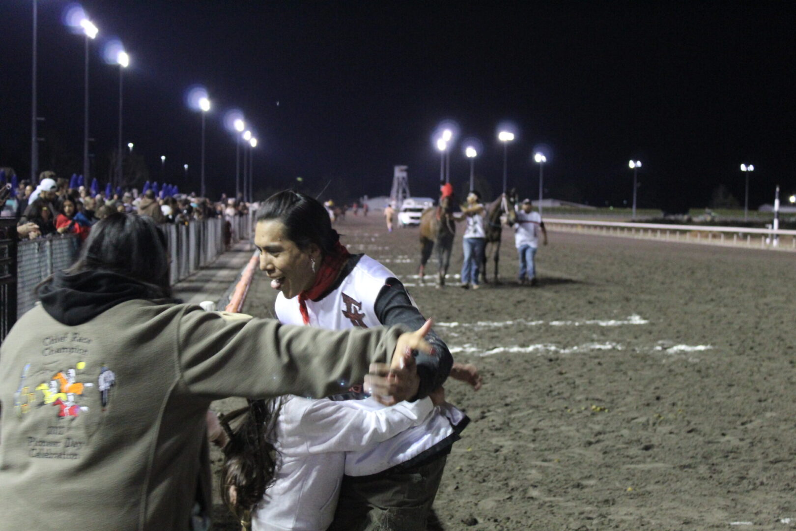 The Championship heat once again proved just having the fastest horses is far from enough to win a Muckleshoot Gold Cup or any Indian Relay event. The physicality of the entire team is important from the rider’s exit from one horse to the next for a smooth transition. The catchers and muggers have to be fined tuned like a pit crew in a car race to get your rider in and back out on the track as quickly as possible.