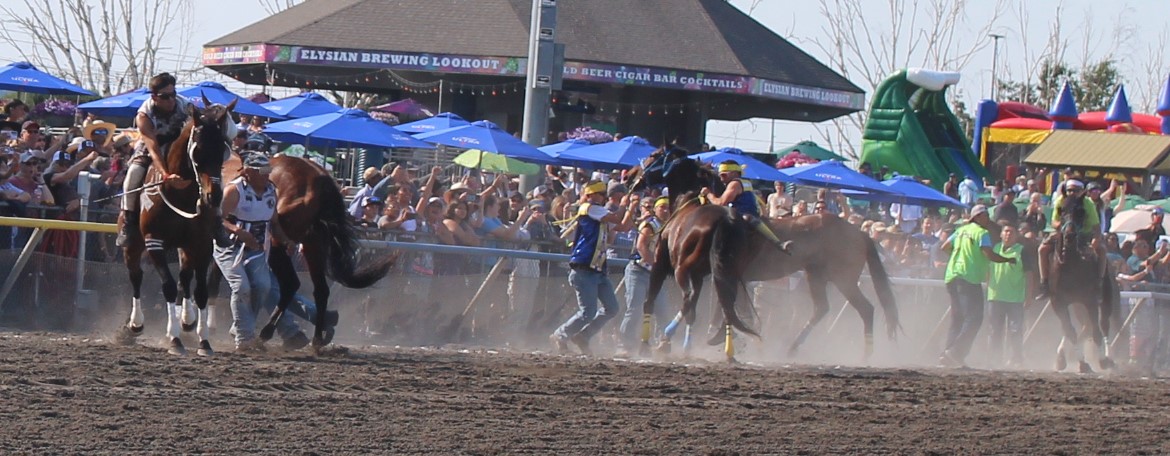 Coming around for the 2nd exchange in front of the huge Emerald Downs crowd, Mountain Crow got there first but rider Weston Bird got hung up as the next horse spun around costing Bird valuable time. In fact it was a rough exchange for all the teams but one.