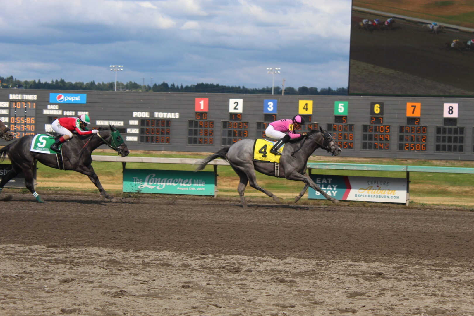 Aloha Breeze did hold onto 2nd but was under attack from a big late run from 19-1 Brookys Gal. Francisco Monroy swung the Brookys Gal to the outside and came running late to be a 1/2 length short of Aloha Breeze. Shocking Grey with Manny Americano closed well to grab 4th on the rail.
