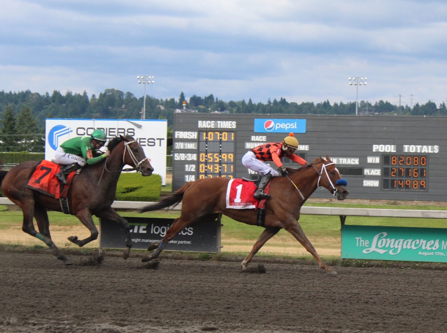 Slew’s trainer and part owner Tom Wenzel said, “He ran big, did get off a bit slow but we’re pretty happy with his effort especially knowing 6-furlongs is not his distance.” Wenzel says, “the Longacres Mile is the goal as always so we’ll see how he comes out of this and try to keep him on track for the big goal.”