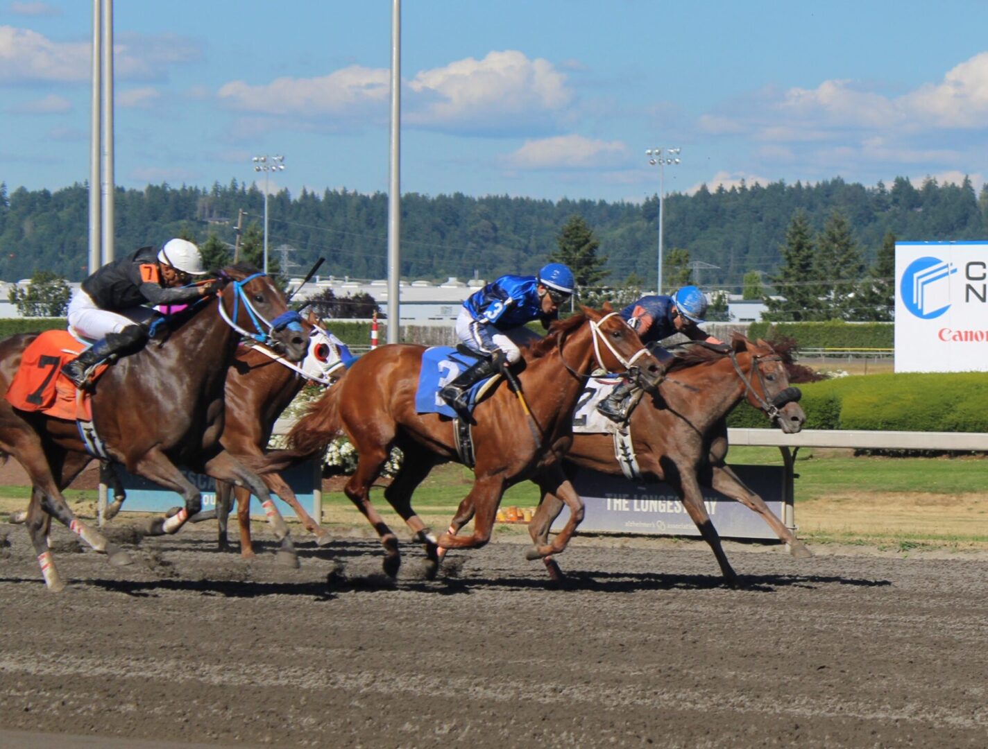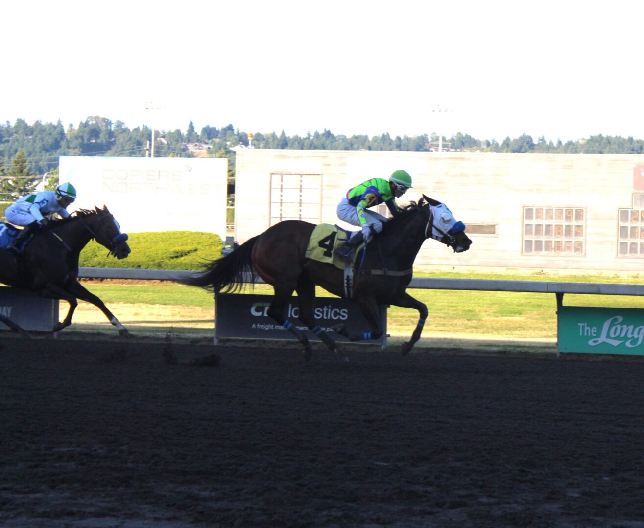 The finale was all about the front speed and Guard Your Spot with Silvio Amador broke clean from the 1 hole and quickly extended their lead down the backstretch in this 6 1/2-furlong run to wrap up the July 3rd 10-race card. The duo would simply not stop and won easily in a final time of 1:16. Guard Your Spot is owned by the Q Stable and trained by Doug McPhee. (more on this story above.) Guard Your Spot is a Washington bred by Coast Guard out of Find Your Spot by Nationhood and was bred by Mr and Mrs Frederick Pabst.