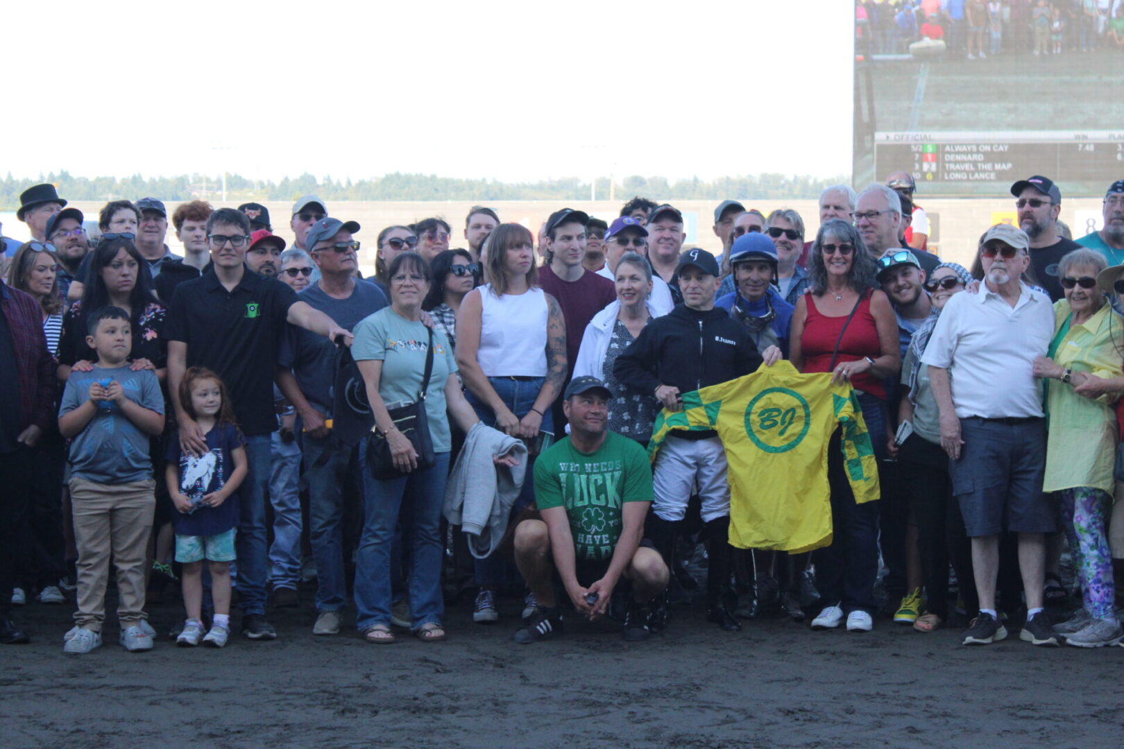 In the race itself, 5-2 Always On Cay and Alex Cruz came from just off the pace to win by 1 1/2 lengths. When the owners, Lusk Racing and trainer Vince Gibson came to the winner’s circle for the picture they were wondering how are we going to do this as it was packed with friends and loved ones of the Jenne’s.