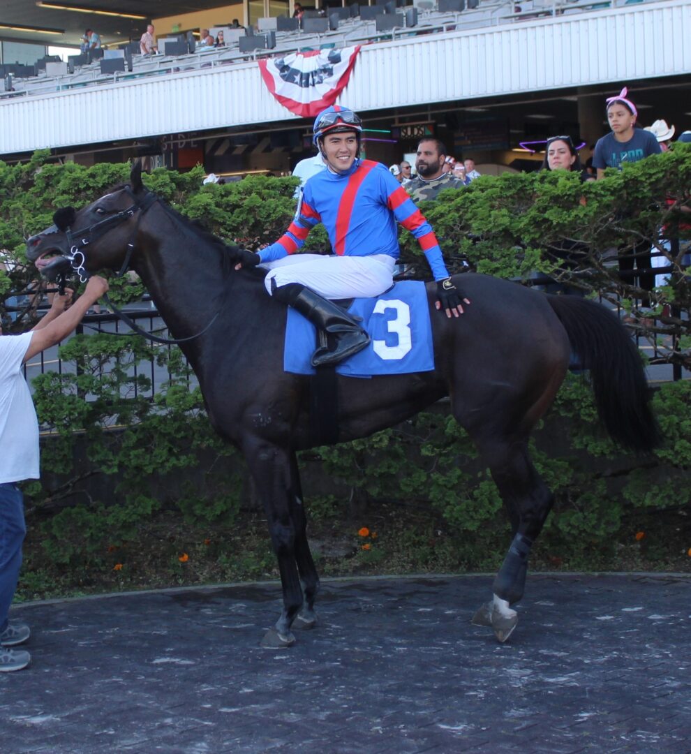 The other Kevin, Kevin Orozco was a stride away from being the one who tripled as he just got beat by a fast closing Sexzie over his ride Empirical in the 6th. Orozco came back to win the 7th on Nation’s Belle in front running style. He ran 4th in the Stakes on 10-1 Adios Jojo and won the 11th in upset fashion on 12-1 Libby’s Gambit. He missed the board twice,