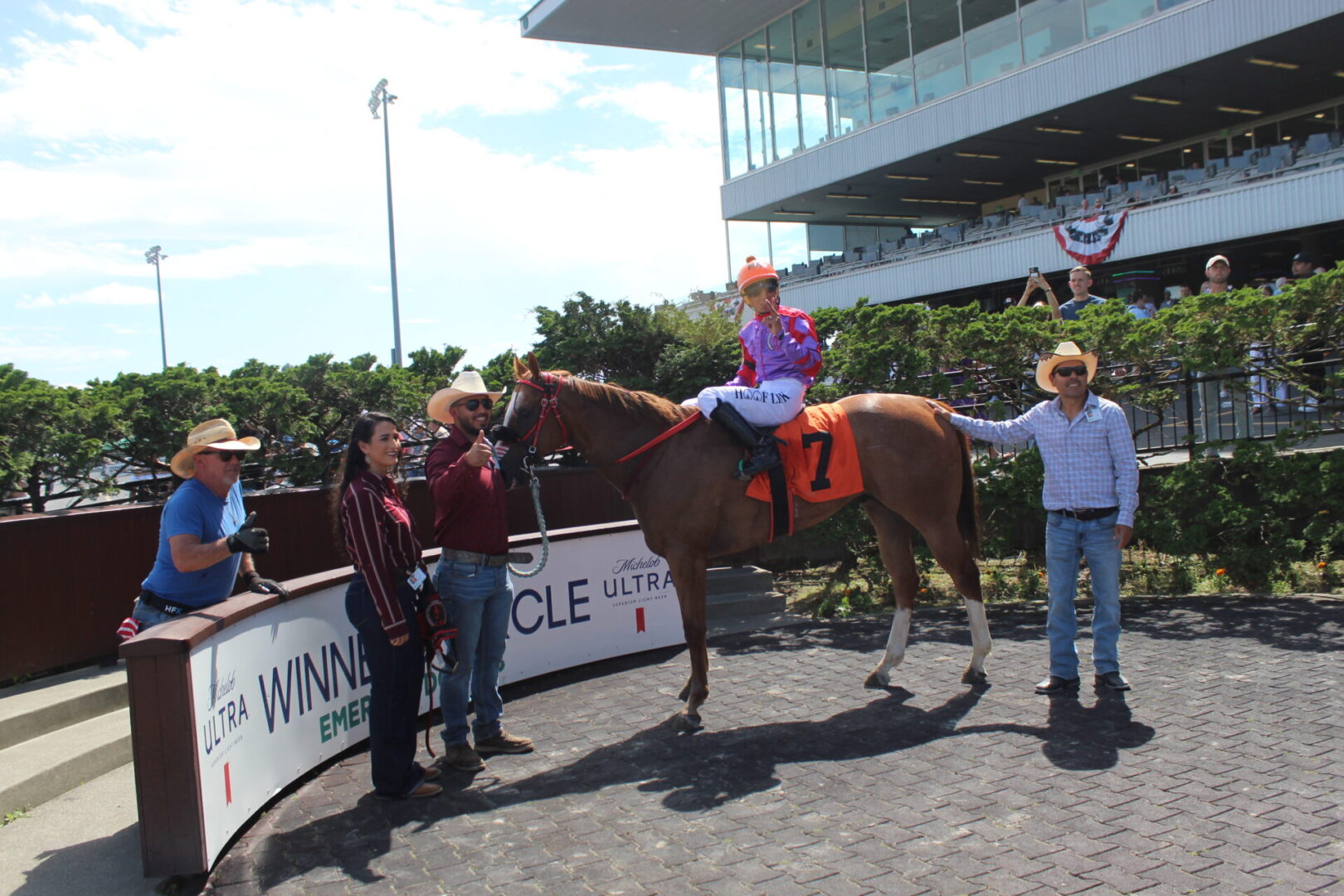 The field of 8 goinng 440 yards was separated by a head with the 2-5 favorite getting the nod. A Famous Ribbon gave jockey Minor Arana a riding back-to-back double as they stopped the clock in 22.10, the top qualifying time. A Famous Ribbon is owned by Adrian Aleman and trained by Jorge Paredes, both double wins for the owner and trainer too.